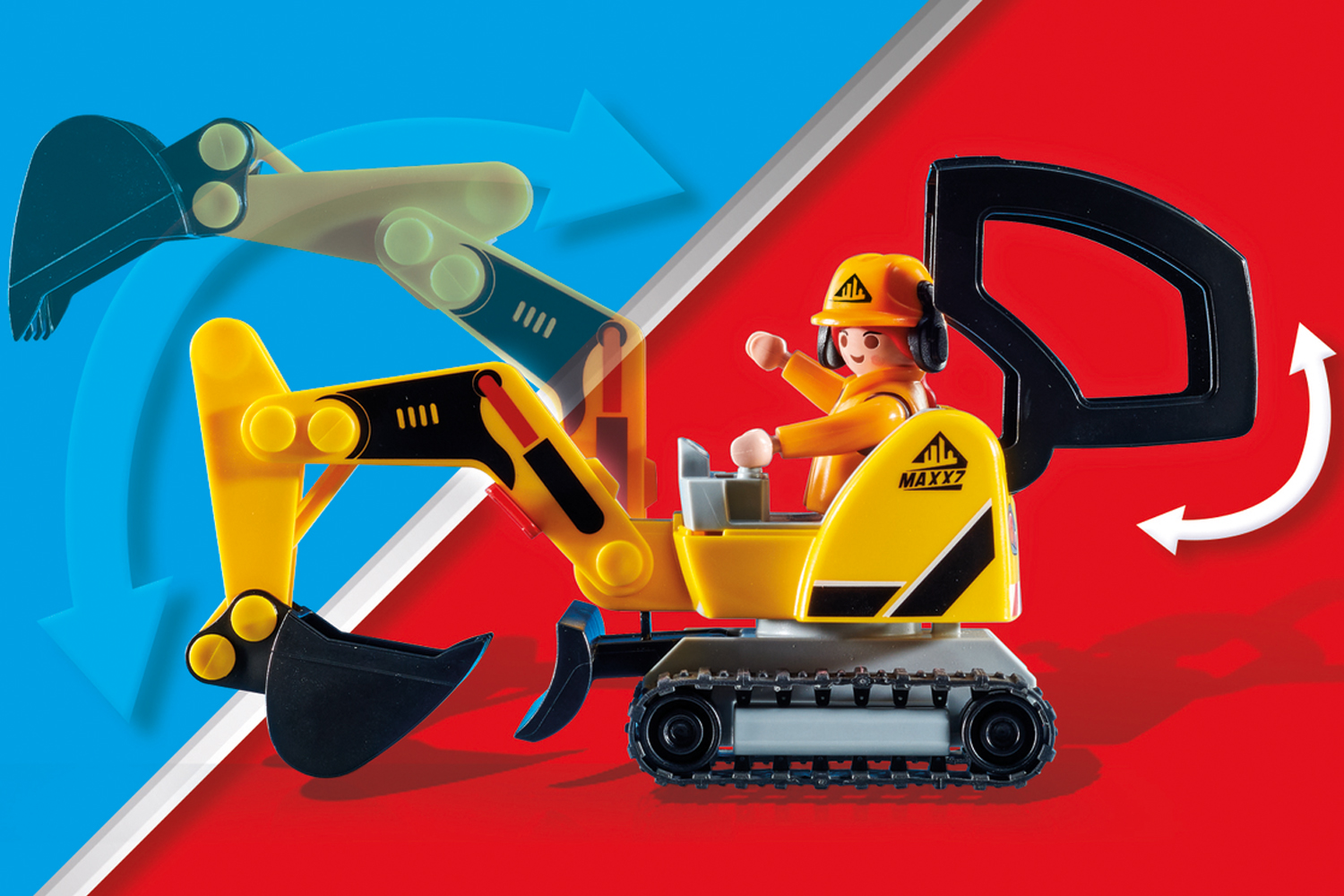 Get to work and lead the construction site with the Playmobil Road Construction playset. A new road must be built. To do this, the ground is first loosened with the jackhammer then the loose stones are removed with the mini-excavator and the wheelbarrow. Then the subsoil is leveled and compacted with the vibratory tamper. The construction team works hand in hand and will quickly complete the road section. Great construction fun for children aged 4 and up. The limited Playmobil Promo Pack includes an excavator with rotating superstructure, a wheelbarrow, jackhammer, construction site sign, pylons and stones. Playmobil construction worker and the realistic extras guarantee hours of imaginative activity. The body of the mini excavator can be rotated 360 degrees. The excavator arm can be fixed in the highest position by a slider.