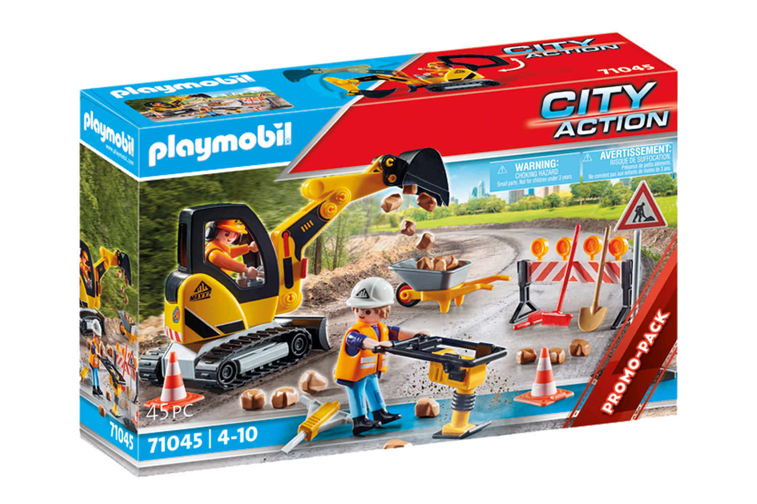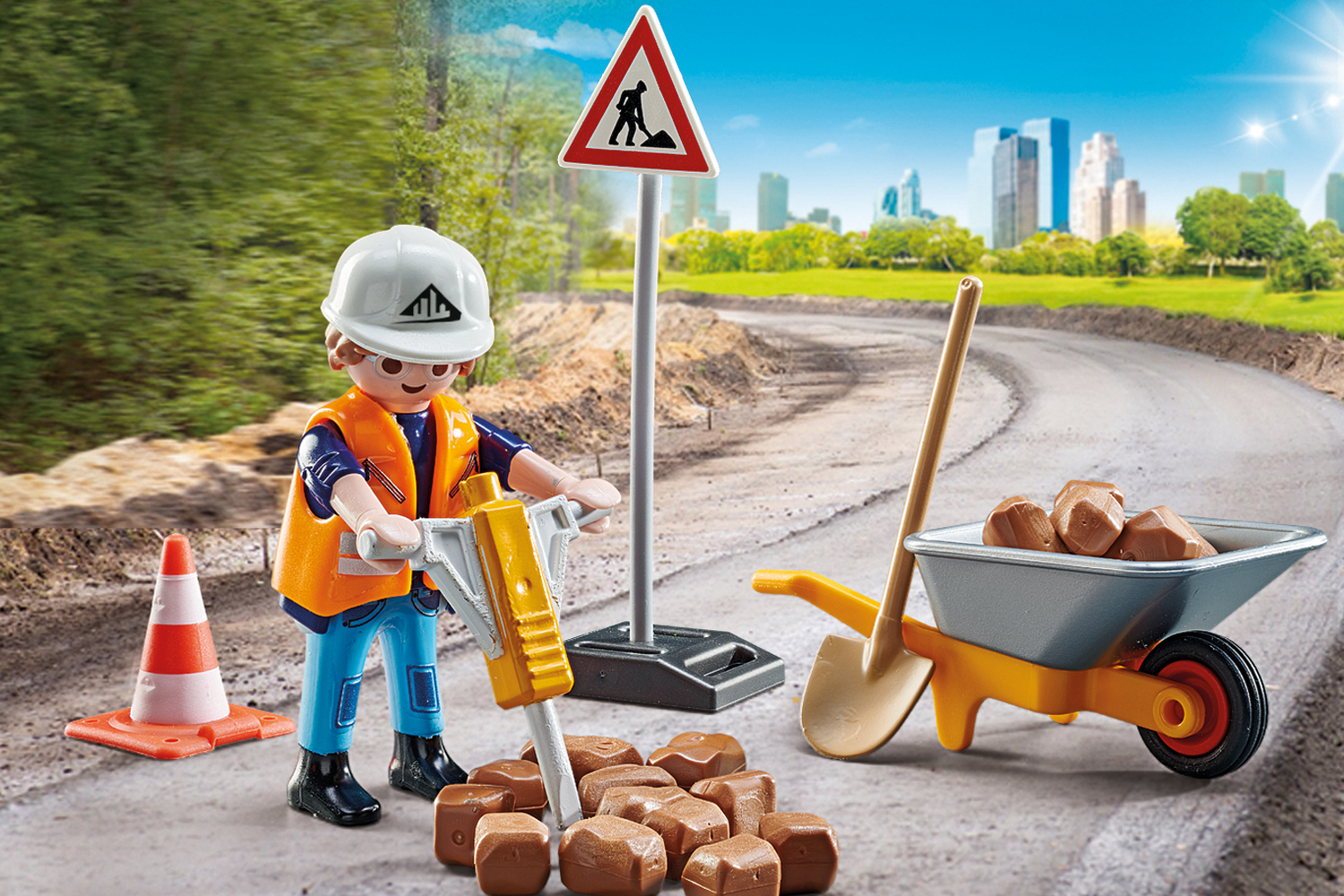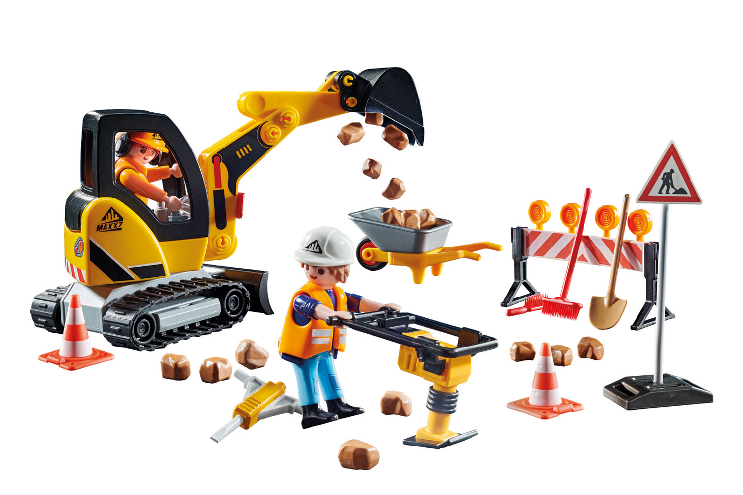 Accessories: 1 excavator, 1 roadblock, 1 jackhammer, 1 vibrating rammer, 1 wheelbarrow, 2 construction helmets, 1 broom, 1 shovel, 1 hand brush, 1 construction site sign, 1 pylon, 20 bricks.