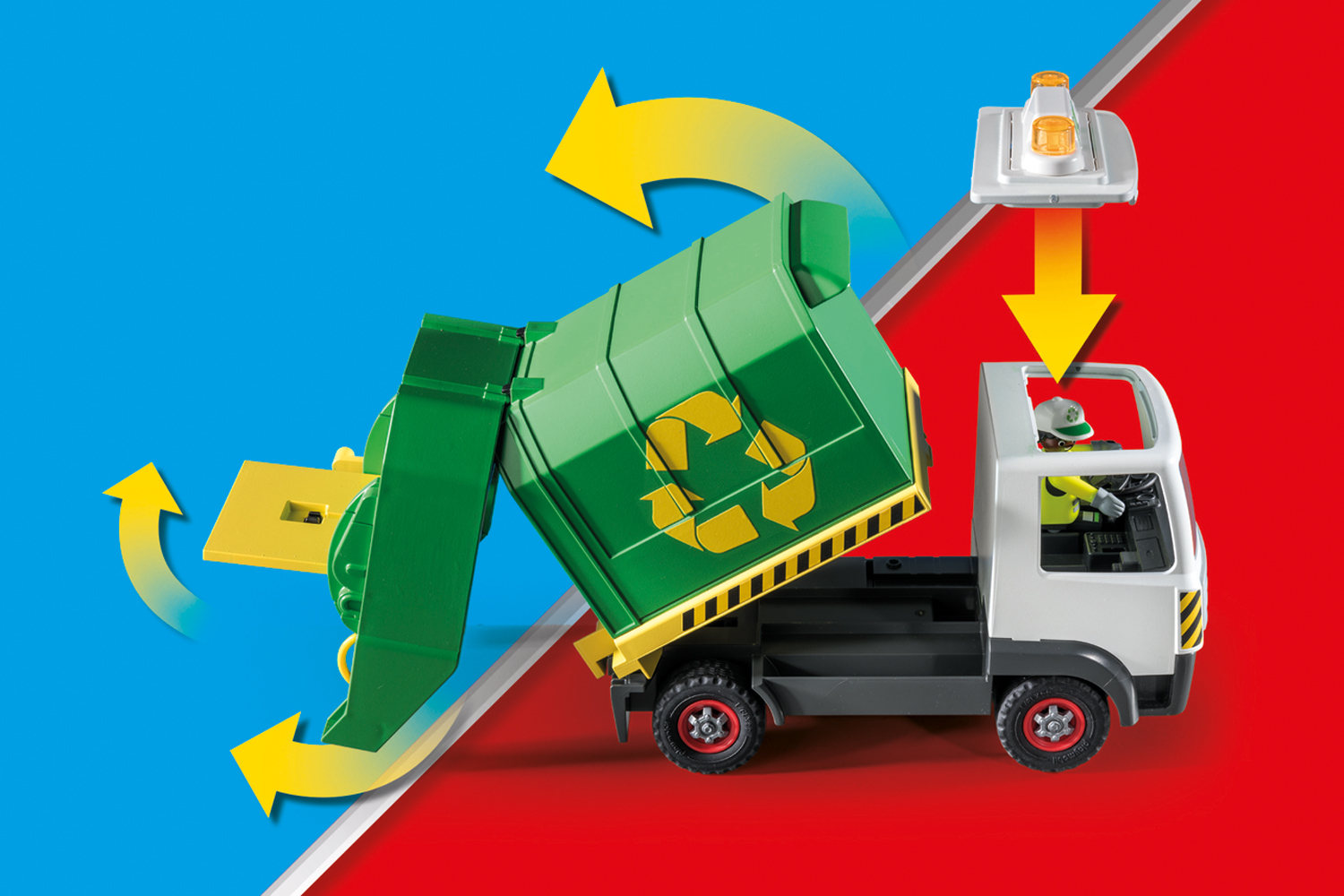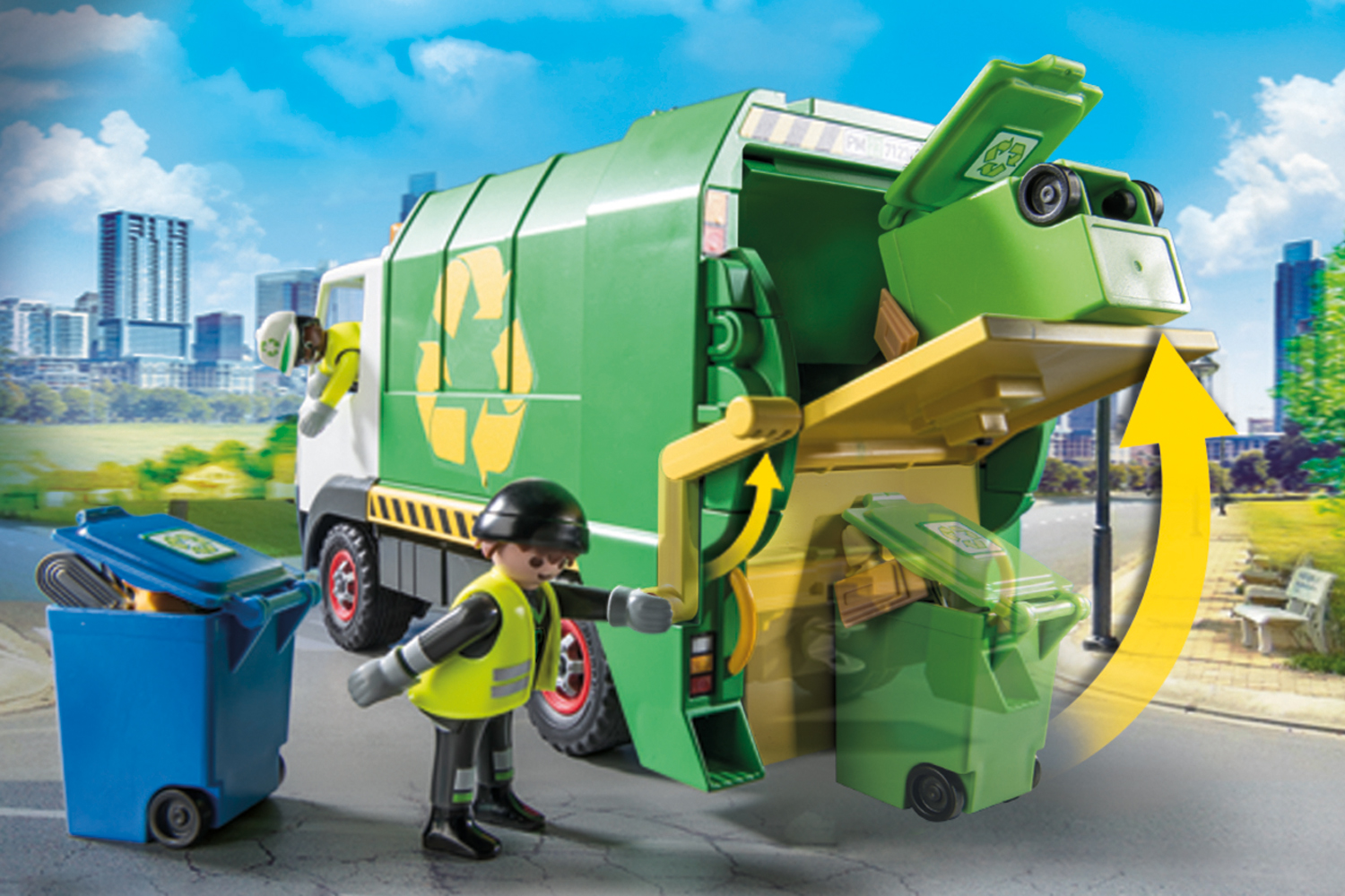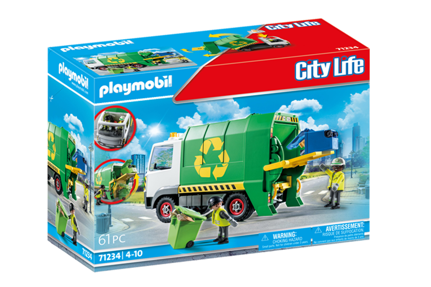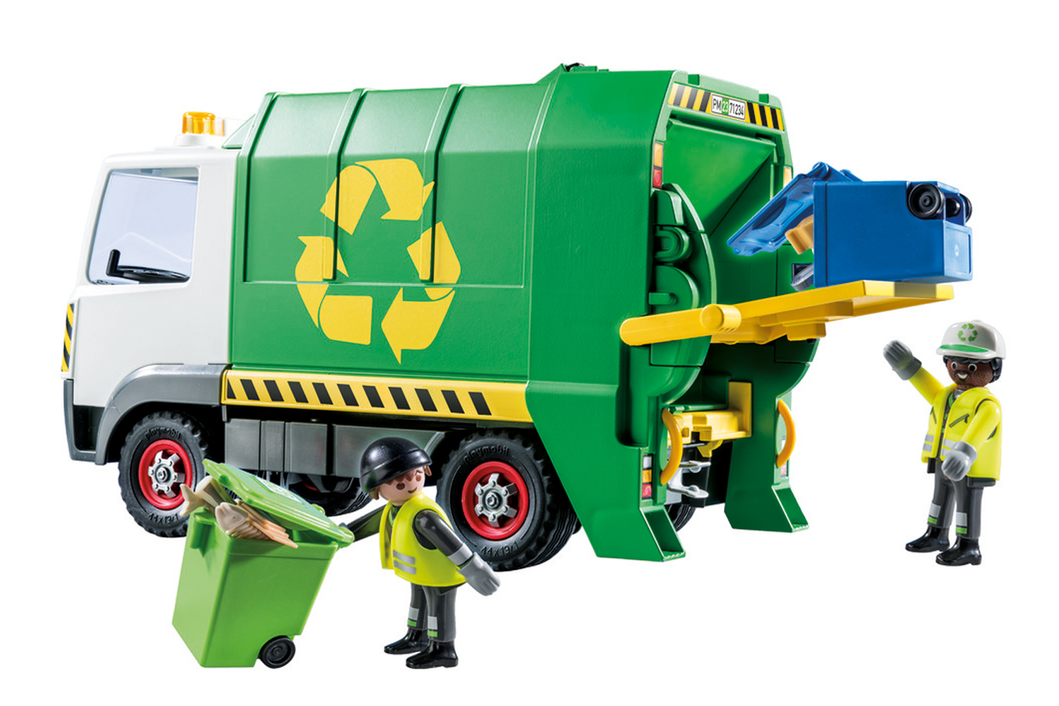 Help keep the city clean with the Playmobil Recycling Truck. This Playmobil City Life Recycling Truck comes with many realistic features, such as two bins and lots of garbage to collect and recycle. Help the sanitation workers to load the bins on the back of the truck and then pull the lever to lift and empty each container. To empty the vehicle, the entire container is tilted up and the rear attachment is lifted. Easily access the driver's cab thanks to the removable roof. Two members of the sanitation department can ride in the vehicle. Just like the real thing: The figures can stand on the left and right at the rear of the vehicle, holding on to the grab handle while driving. Includes 2 Playmobil figures. Recommended for ages four to ten years. Warning. Choking Hazard. Small parts. Not for children under 3 years.