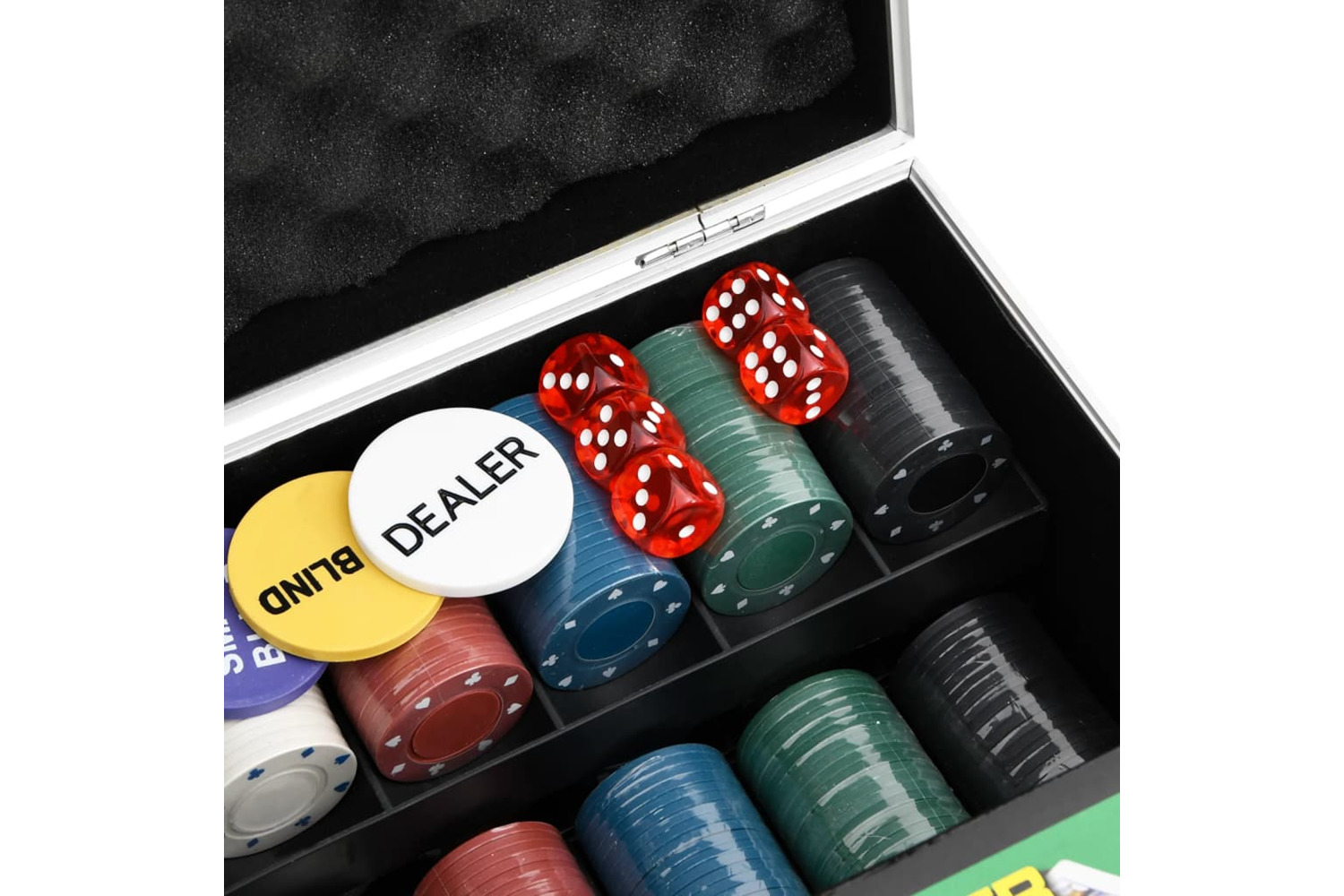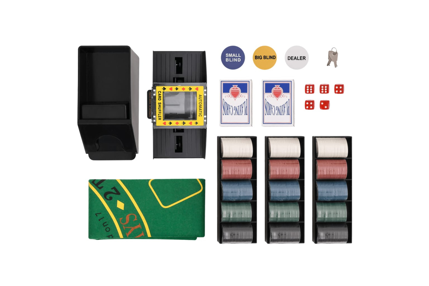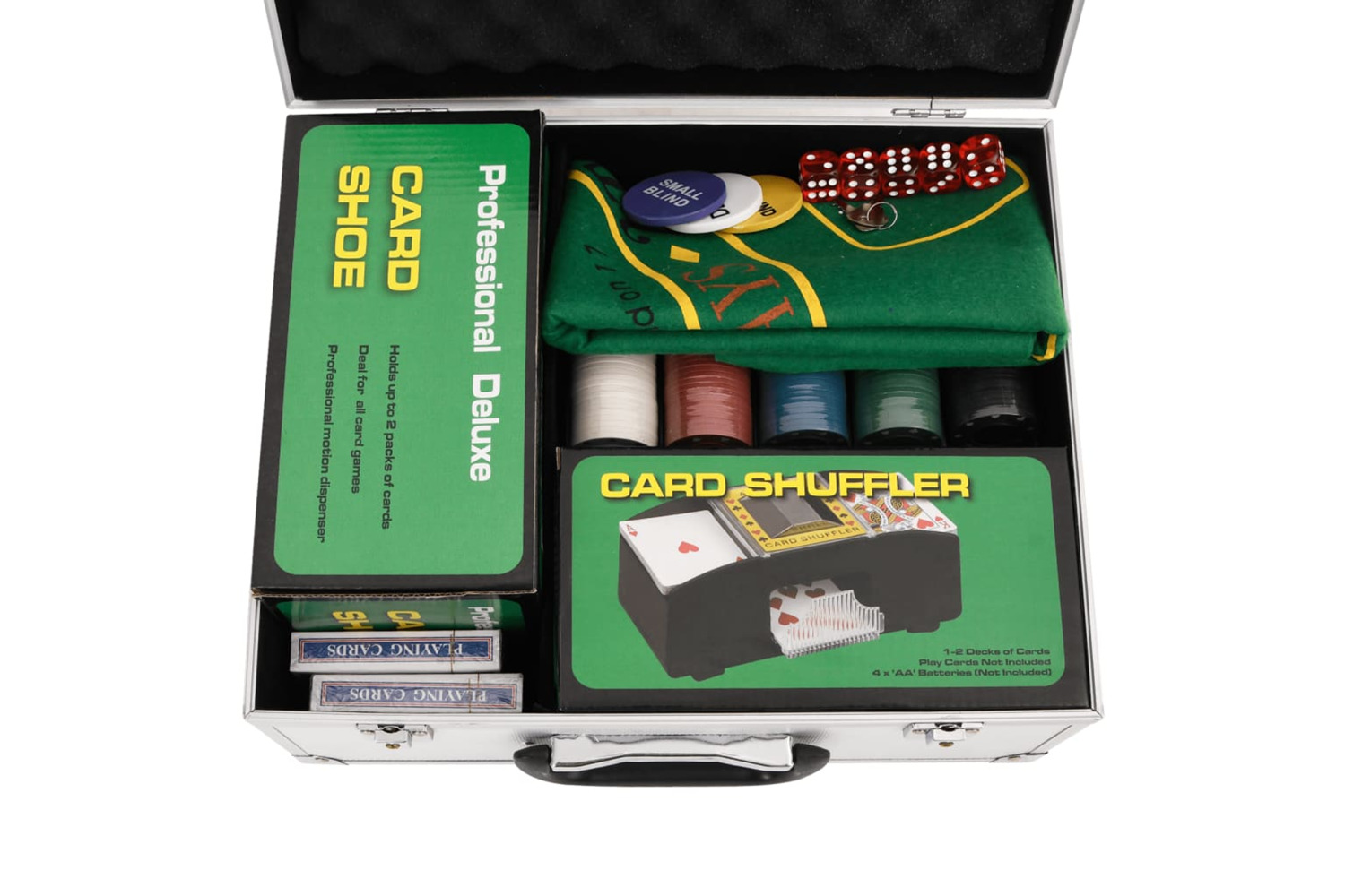 - Professional poker set: This set includes 5 dice, 1 card shoe, 2 decks of cards, 3 chip holders, 1 automatic card shuffler, 1 play mat, 1 dealer button, 1 small blind button, 1 big blind button, and 300 chips.