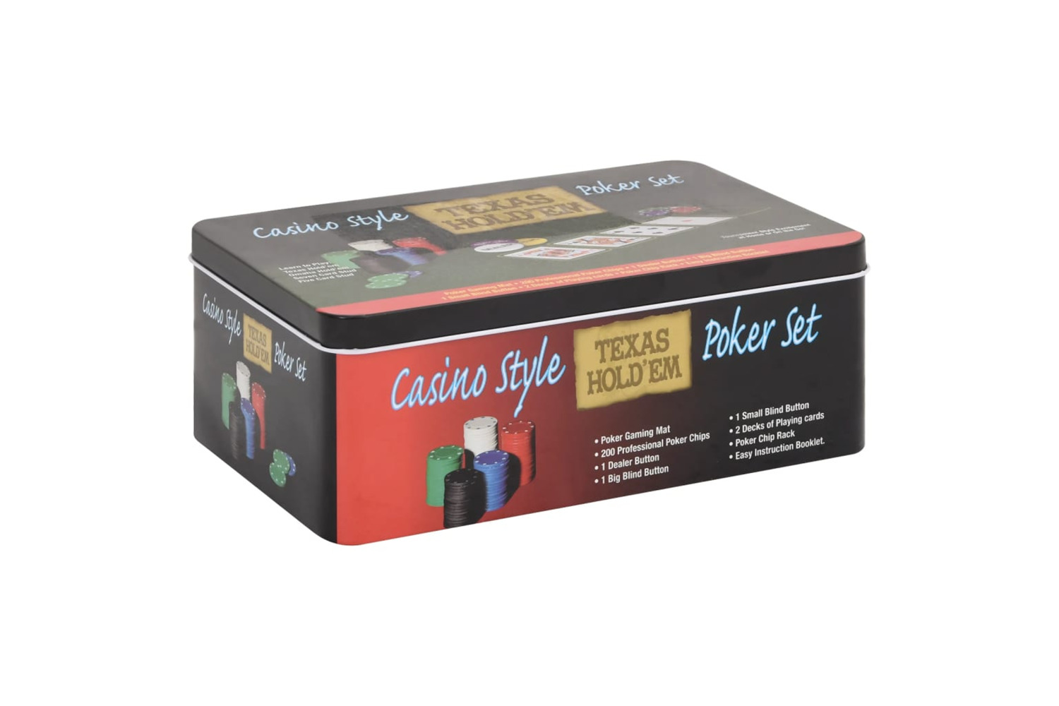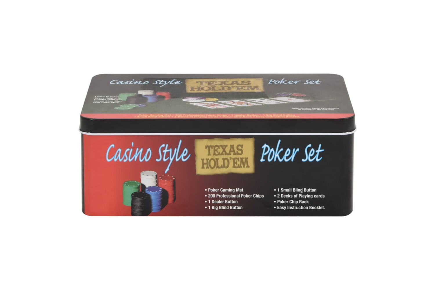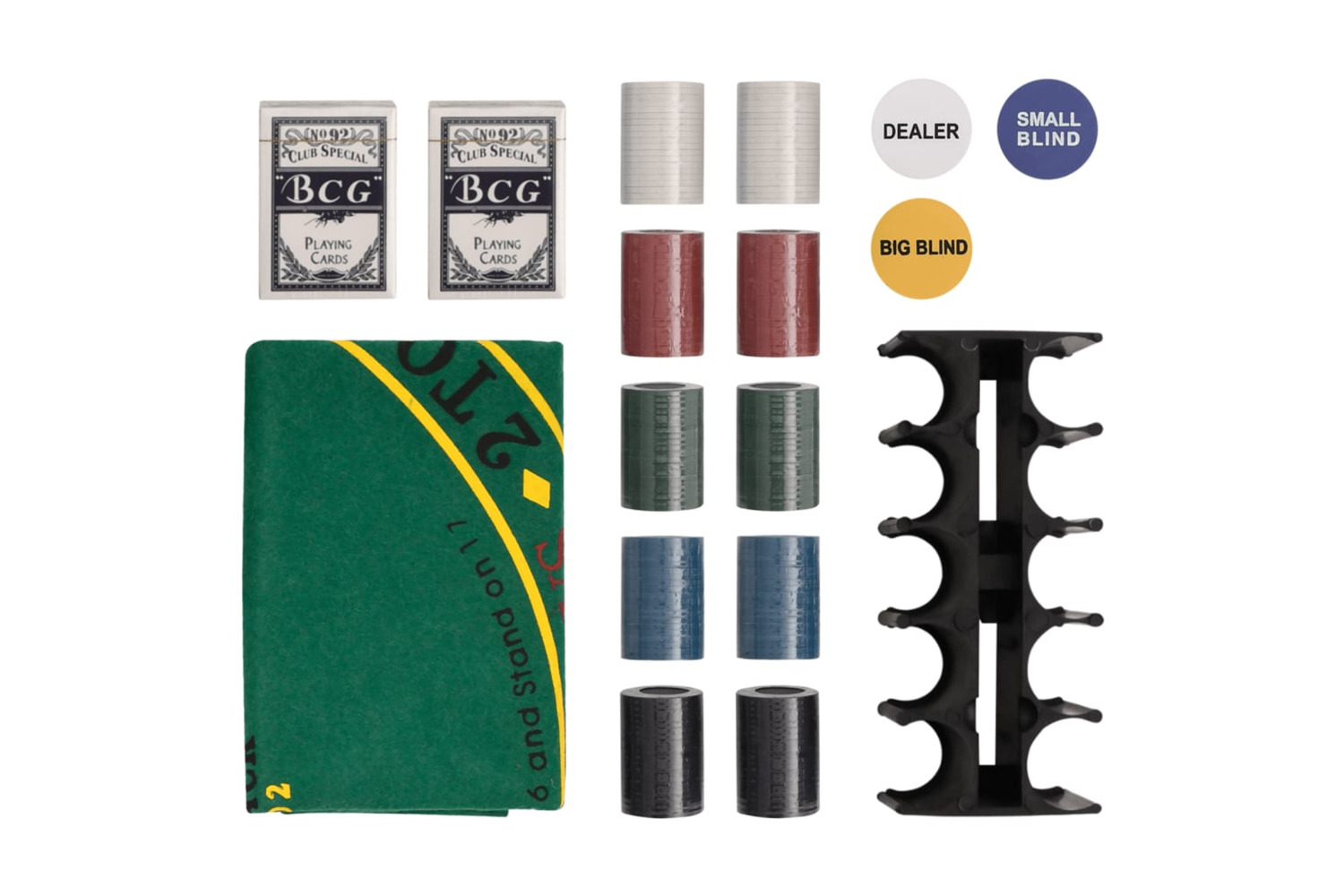 - Professional poker set: This set includes 2 decks of cards, 1 play mat, 1 dealer button, 1 small blind button, 1 big blind button, and 200 chips.