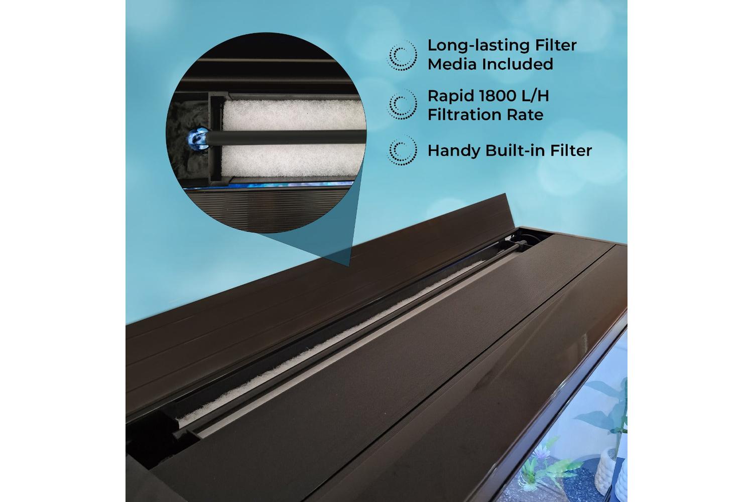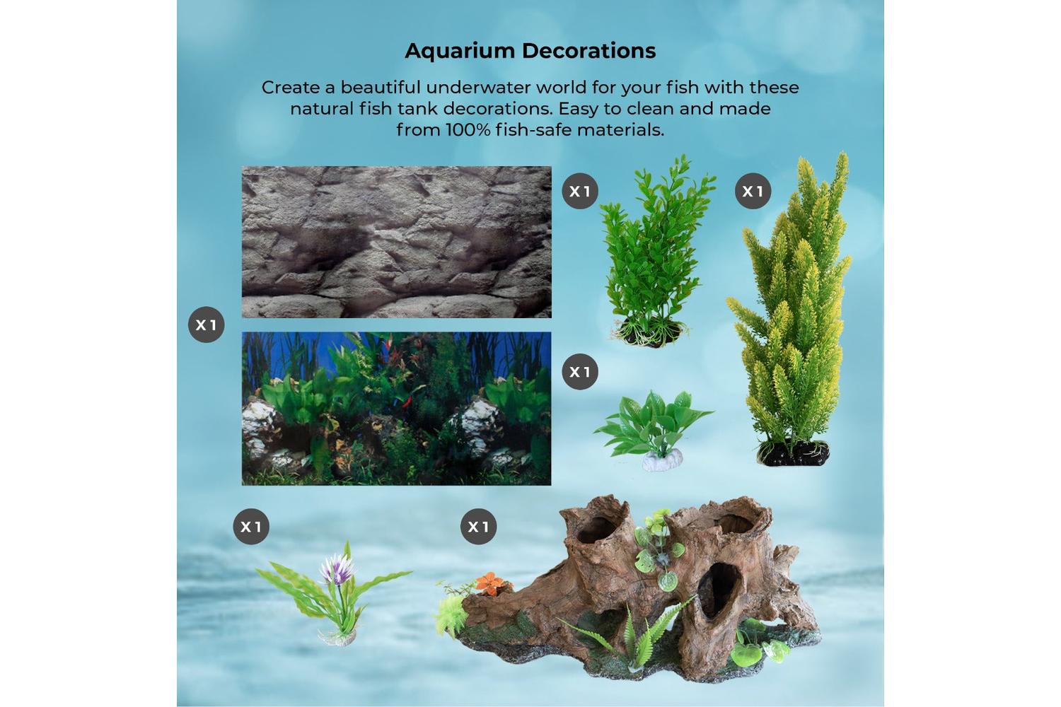 Your tank is beautifully complimented with a complete starter pack including a whopping 25kg bag of natural gravel and a huge tree ornament. These go hand-in-hand with two life-like artificial plants and a 150cm x 75cm reversible plastic backdrop which gives you the choice of a stone or an underwater scene.