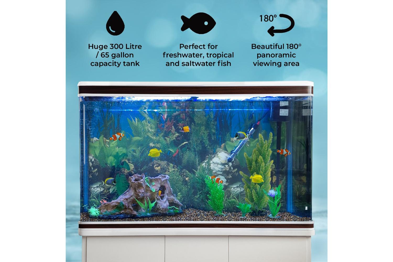 The extra large 300L capacity aquarium tank gives you loads of space to set up your included ornament, gravel and plants, you’ll be replicating The Great Barrier Reef in no time!