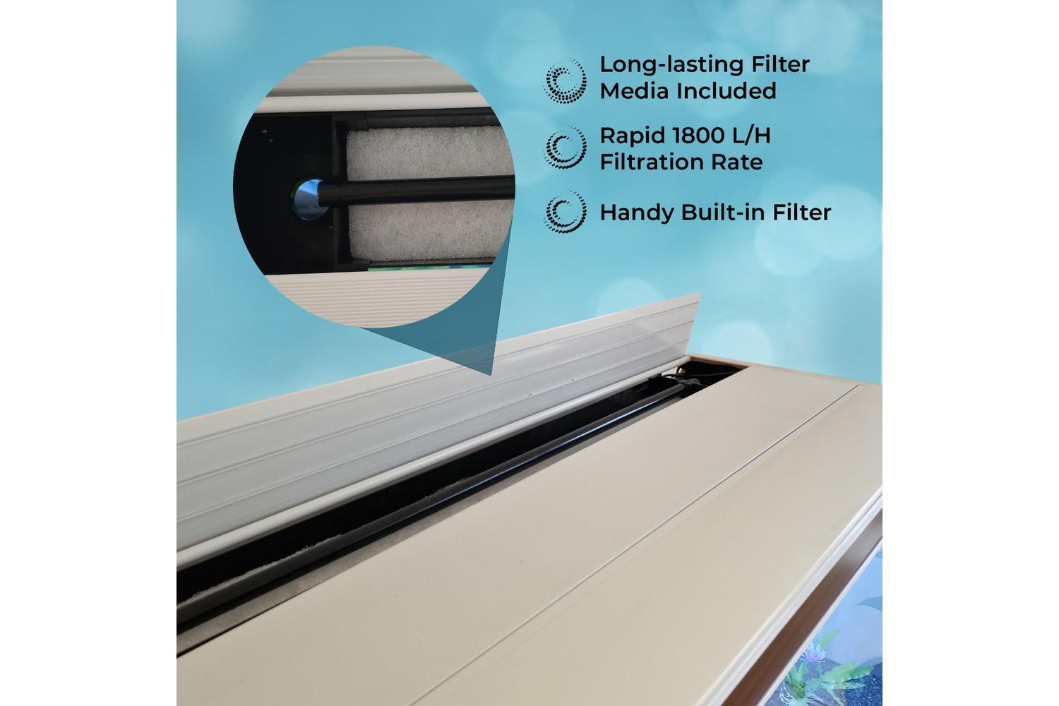 - Built in filter sits over the whole length of the tank which increases the surface area of the filter medium and makes it extremely efficient with a 1800 L/H rate