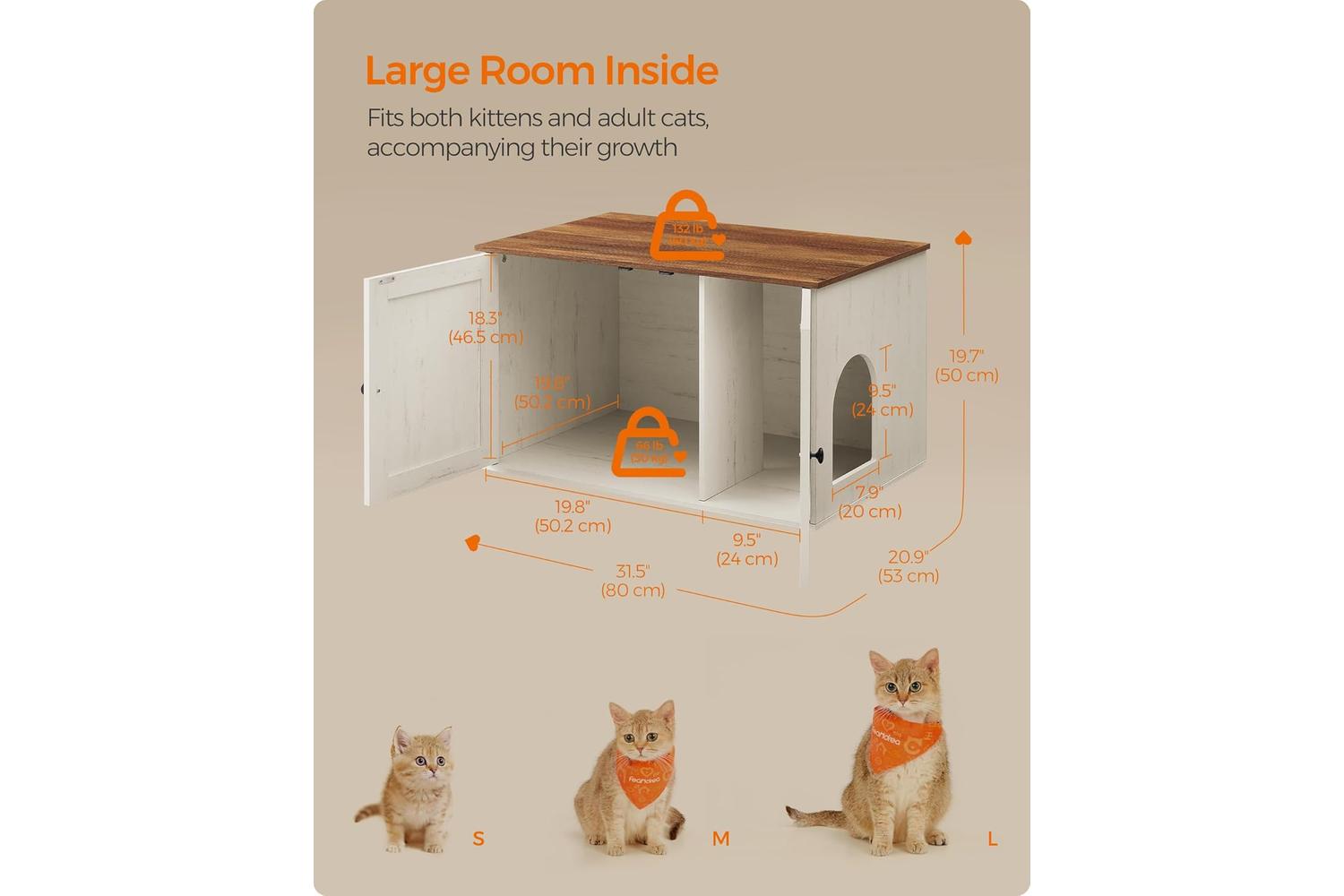Measuring 80 x 53 x 50 cm, this enclosure is ideal for most standard litter boxes and can also serve as a multifunctional side table or bench. The sturdy top supports up to 60 kg with the inner divider, allowing you to display decorative items, plants, or even use it as extra seating. The easy-access door ensures hassle-free cleaning, while the included accessory kit and clear instructions make assembly straightforward for any pet owner.