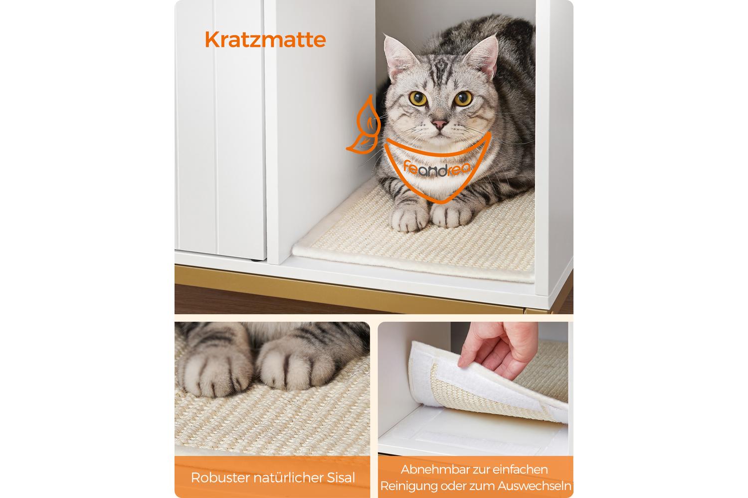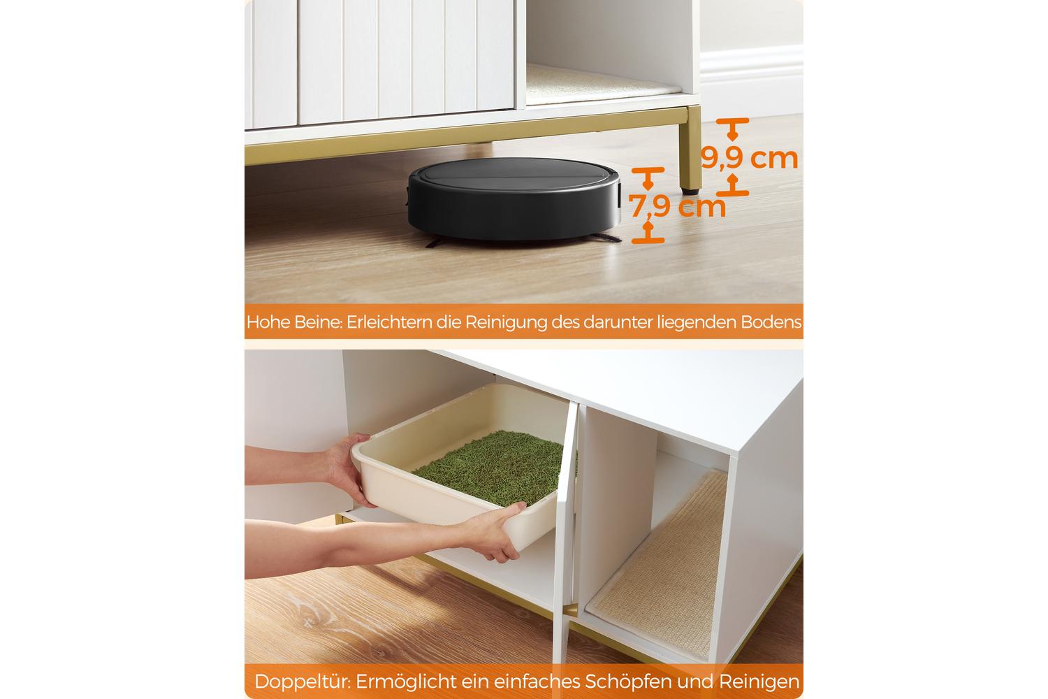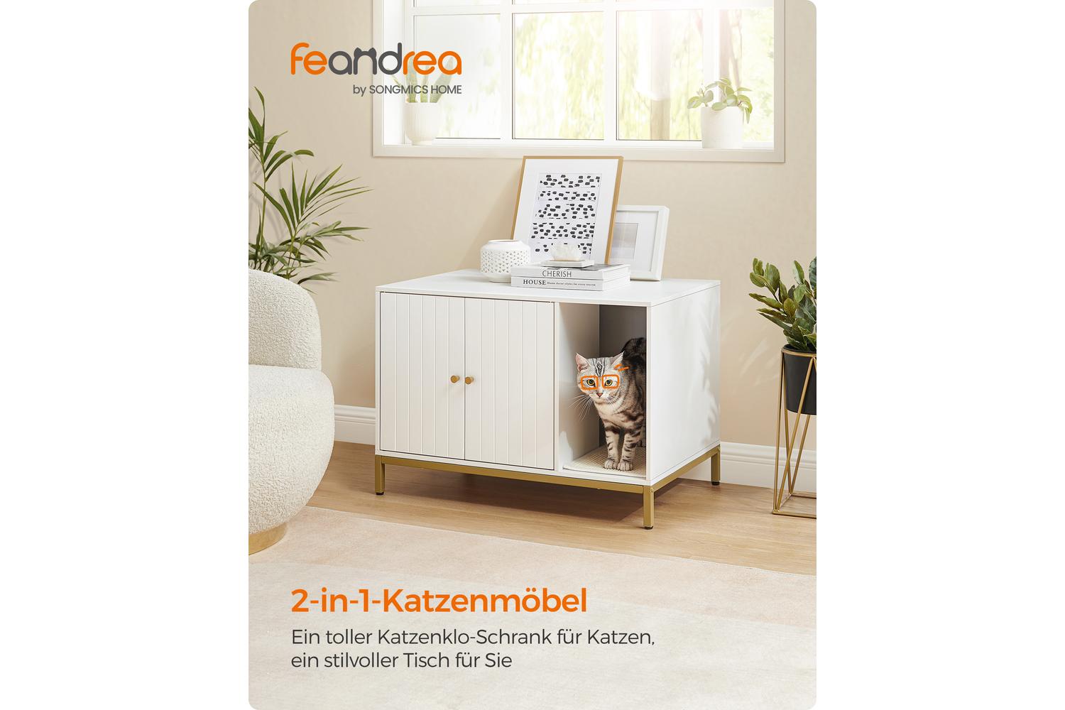 Upgrade your pet's comfort and your home's style with the FEANDREA Cat Litter Box Enclosure. Designed for Irish cat owners who value both functionality and aesthetics, this modern enclosure discreetly hides your cat's litter box while blending seamlessly with your home decor. The elegant white and gold finish, paired with robust particleboard and steel construction, ensures this piece is as durable as it is attractive. Whether you live in a cosy apartment in Dublin or a spacious home in Cork, this enclosure is the perfect solution for keeping your living space tidy and odour-free.