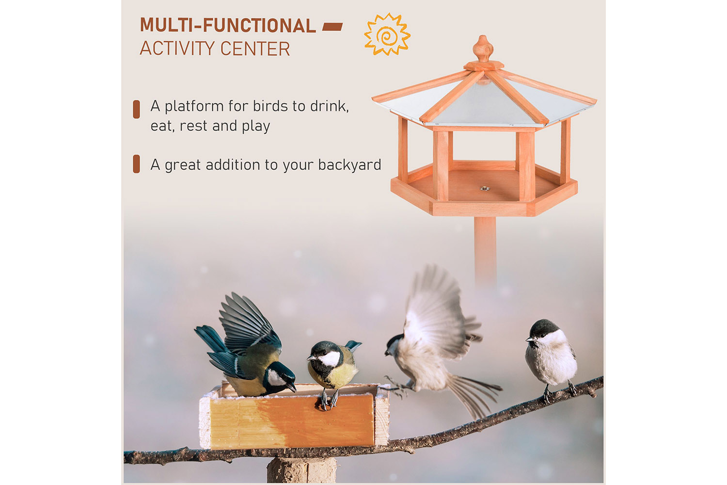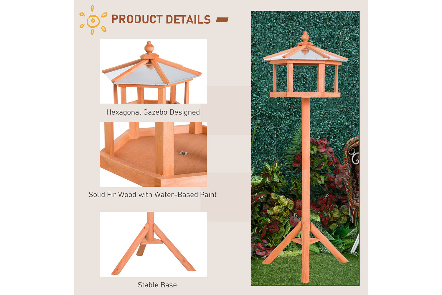 Enjoy the pleasant melody of birds’ singing in your backyard and get closer to nature with our sturdy bird feeder. Help feed wildlife while attracting many and varied smaller birds for your pleasure. Made of high-quality fir wood, this beautiful feeder is pretty to look at. The opening makes refilling much easier and it holds so much seed that you won’t have to worry about refilling very often. What’s more, the metal sheet roof will help keep the seeds protected from the elements.