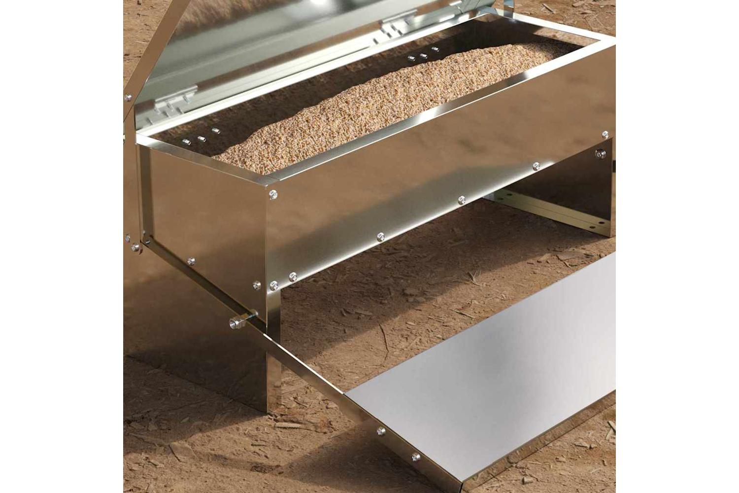 - Strong Steel Build This feeder is crafted from high-quality steel, ensuring exceptional durability for constant exposure to outdoor elements. Its robust material choice resists ,promising a long lifespan while maintaining its sleek, minimalistic sheen. Easy to clean, the steel surface adds practicality and ensures hygienic feeding for chickens.