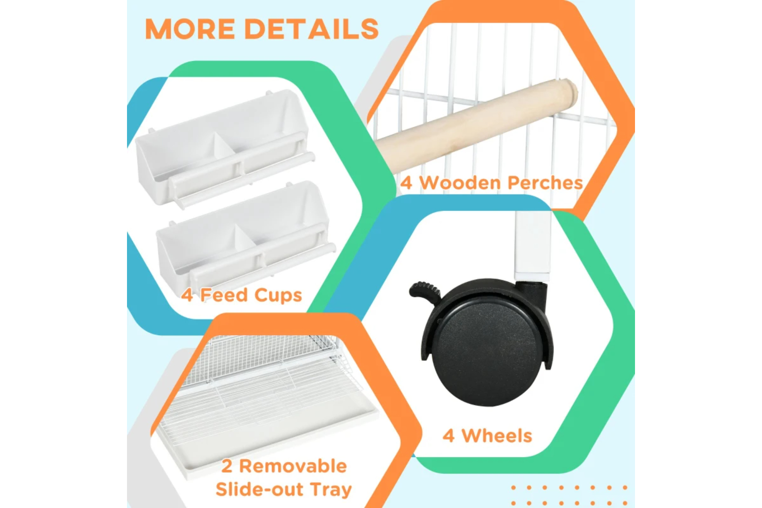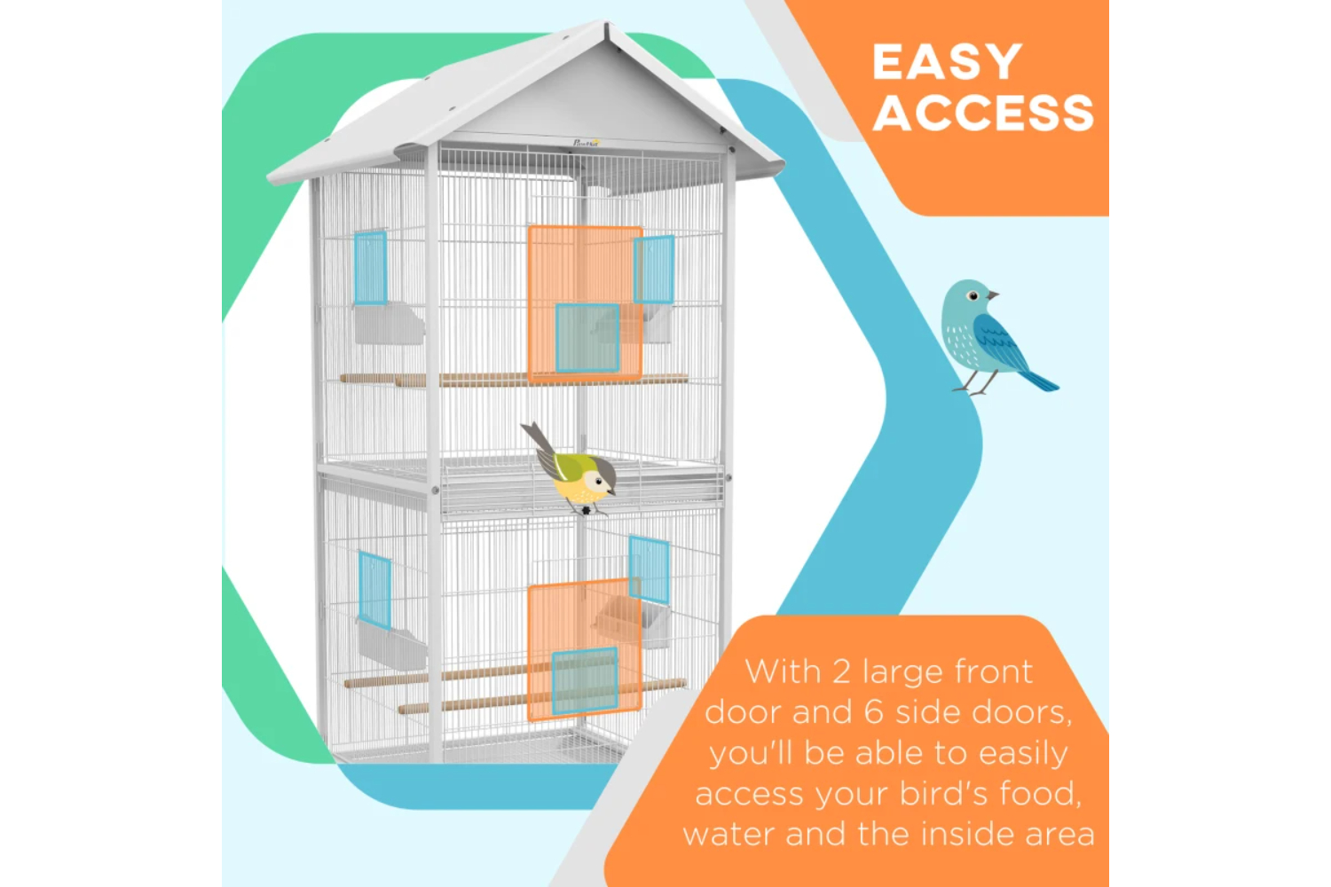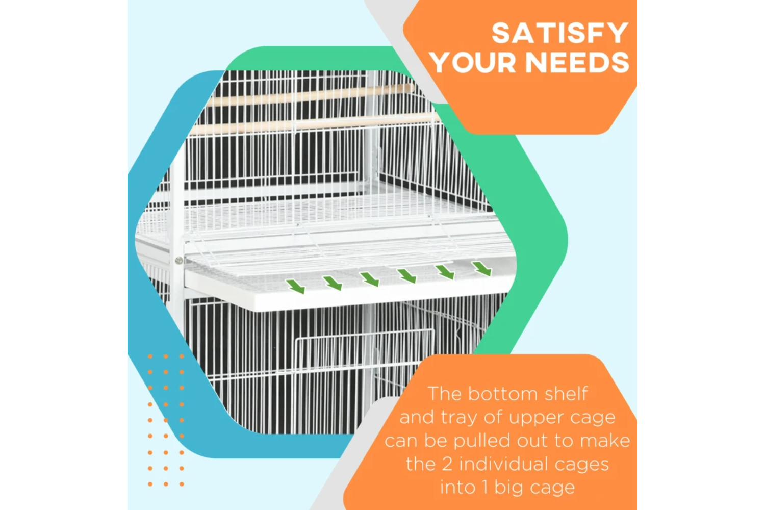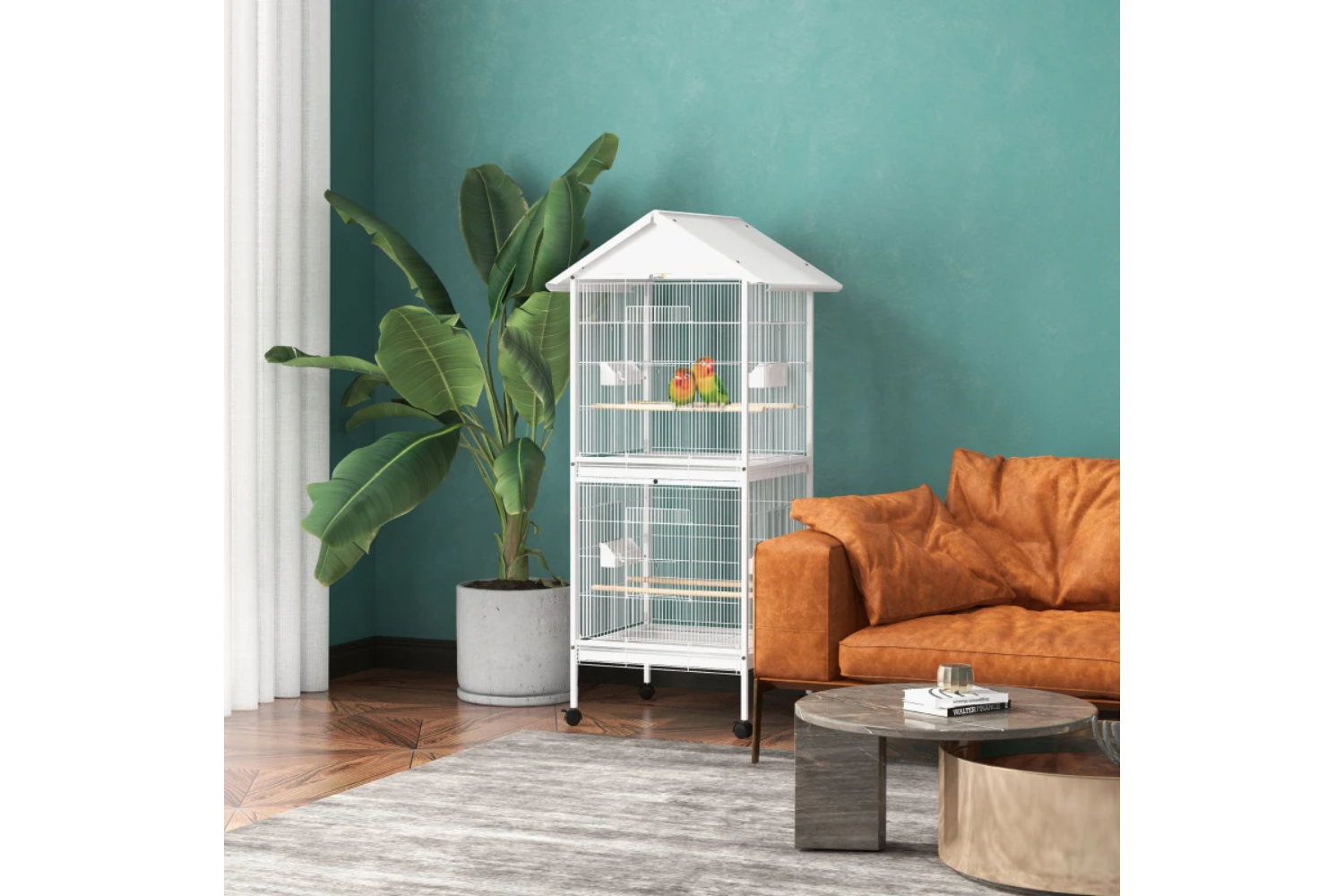 Keep birds safe and happy with this large PawHut bird cage. With a removable shelf, you can choose between two floors or one large area. Each area has wood perches and food containers, keeping your pets comfortable and fed. Multiple doors for easy access, so you can simply refill their food and clean their space. Resting on four wheels, you can move it around easiy with zero disturbances inside. Create a special home for finches, canaries, budgies and similar-sized birds.