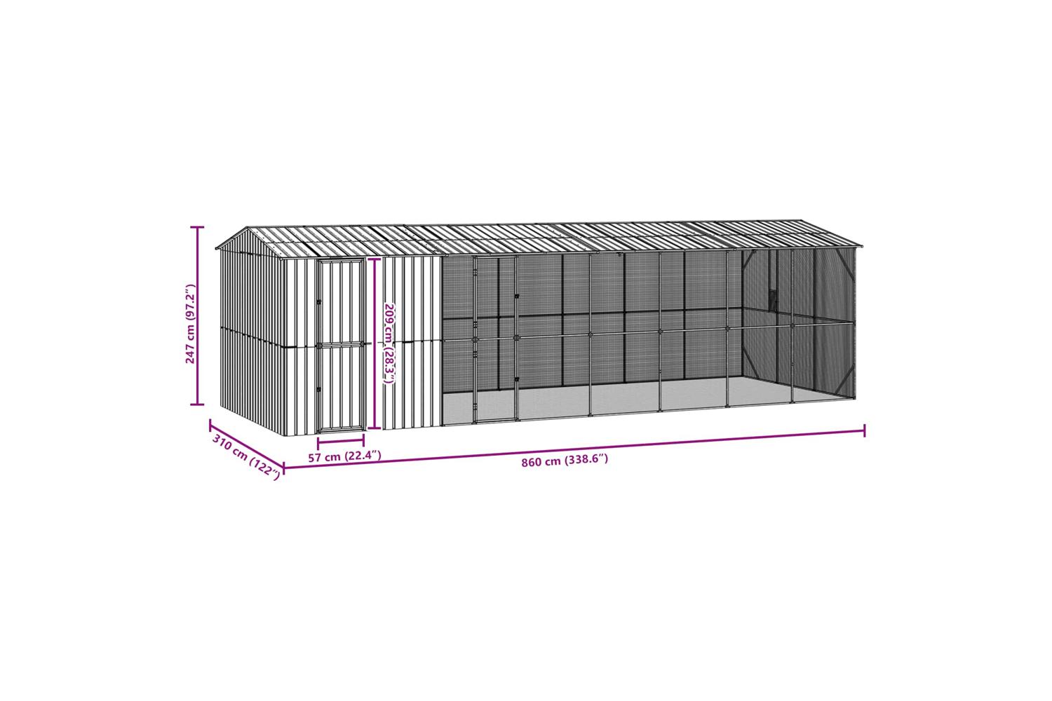 This elegant outdoor bird cage is a harmonious blend of modern design and practical functionality, designed to transform your garden or terrace into a charming avian haven. Crafted from robust galvanized steel, this sleek, rectangular enclosure offers a pristine and ethereal ambiance that enhances any outdoor space. Its anthracite finish adds a sophisticated touch, while the spacious design accommodates various bird types, fostering a vibrant and lively environment for your feathered companions.