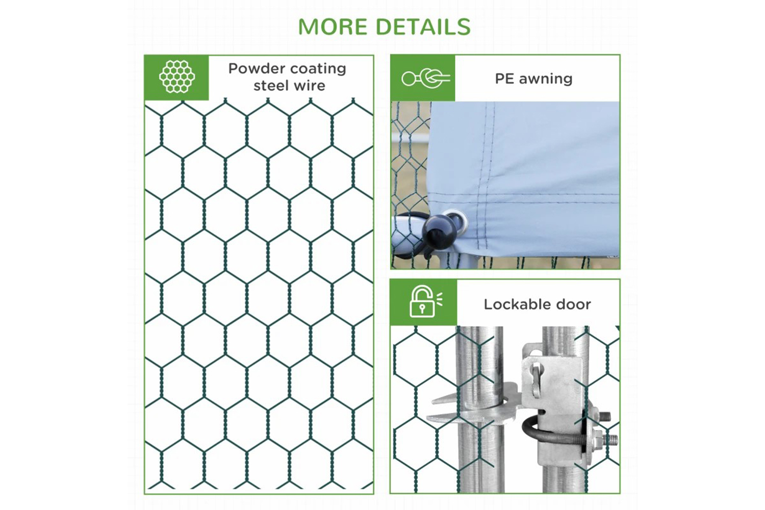 PawHut outdoor cages are the perfect products to offer protection to your pets while providing them the freedom of fresh air. PawHut solid galvanized metal frames, hexagonal wire mesh walls, and durable weather-resistant covers provide you peace of mind for the safety of your animals in the outdoor environment.