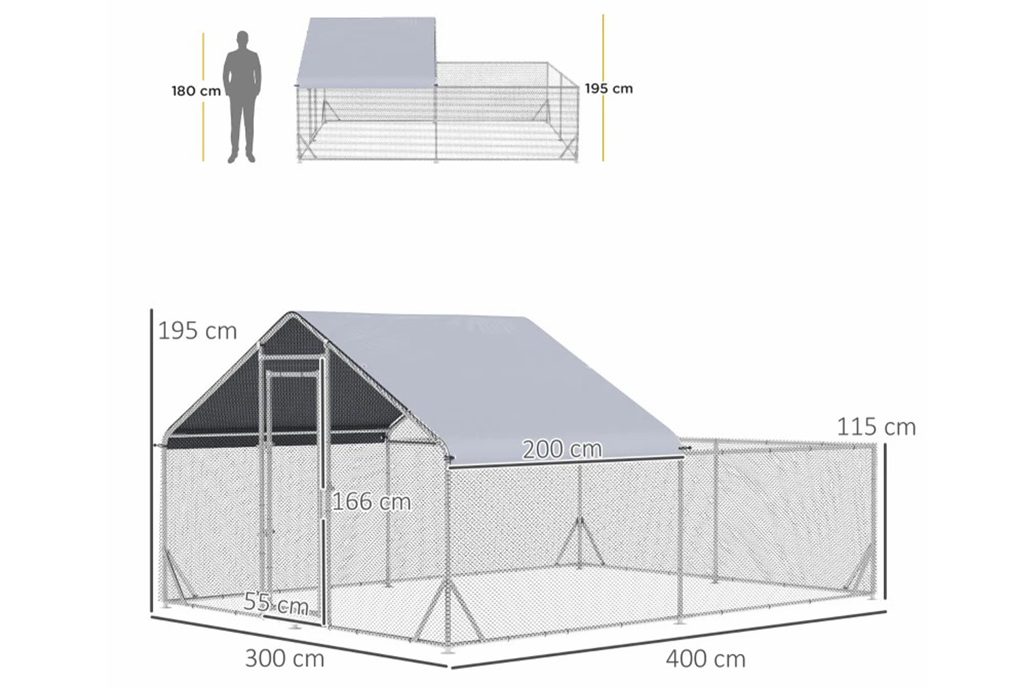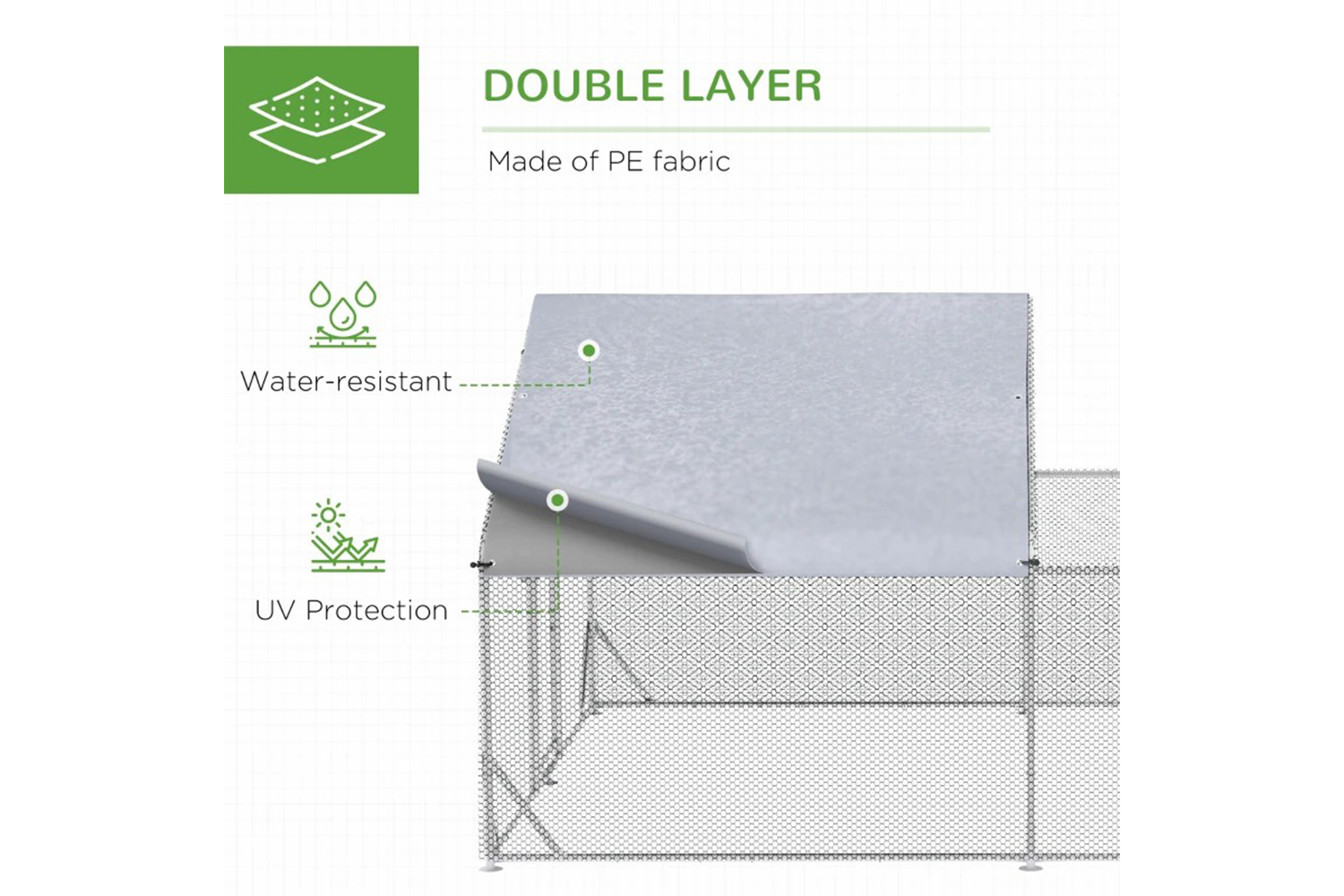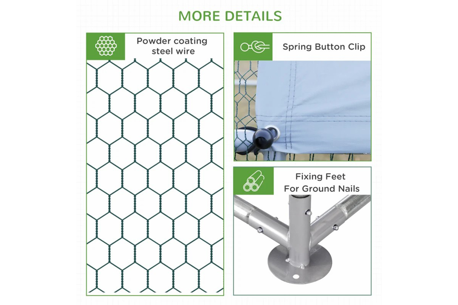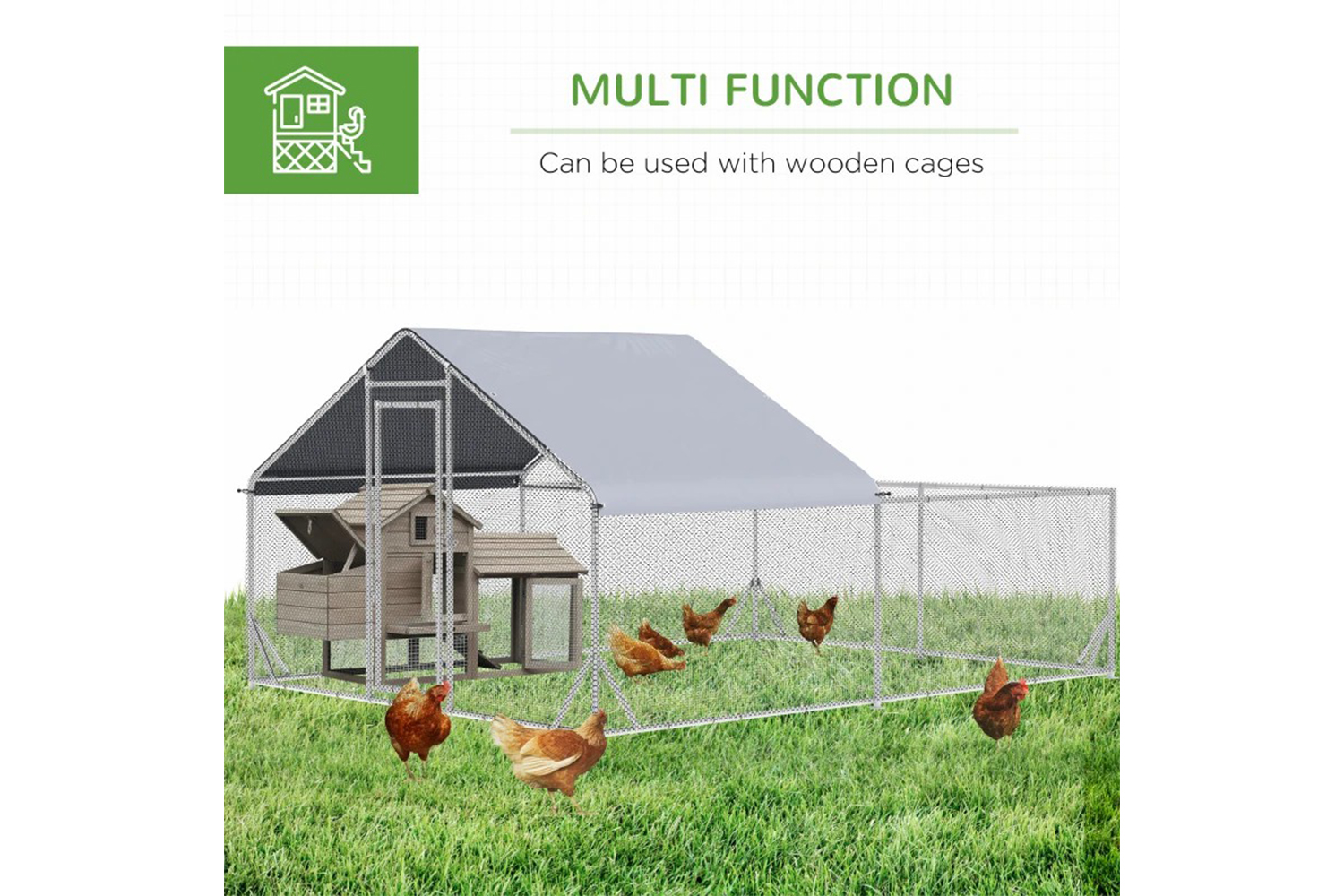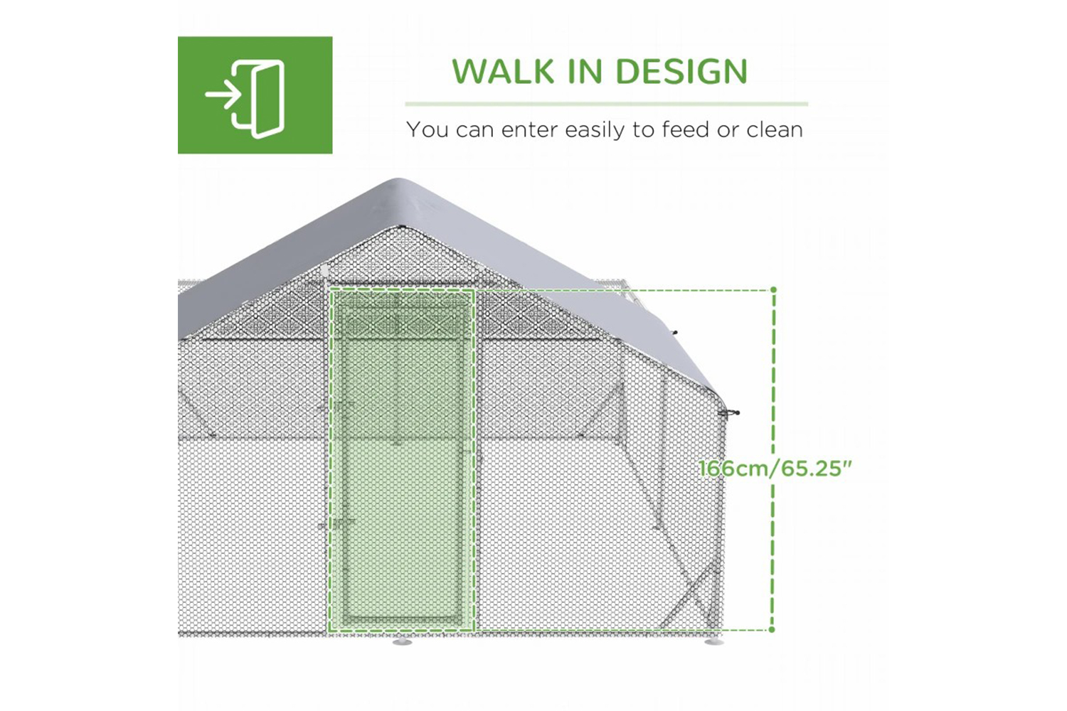 This PawHut large chicken coop is extra big and wide - enough room for up to 12 chickens. The roof provides proper shelter, protecting pets from rain and UV rays. There' s a tall entrance for you to pass through, so you can go in and feed pets with ease. Surrounded by steel wire, keeping pets protected, whilst letting air pass through for ventilation. A simple and secure way to keep flock protected, comfortable and safe.