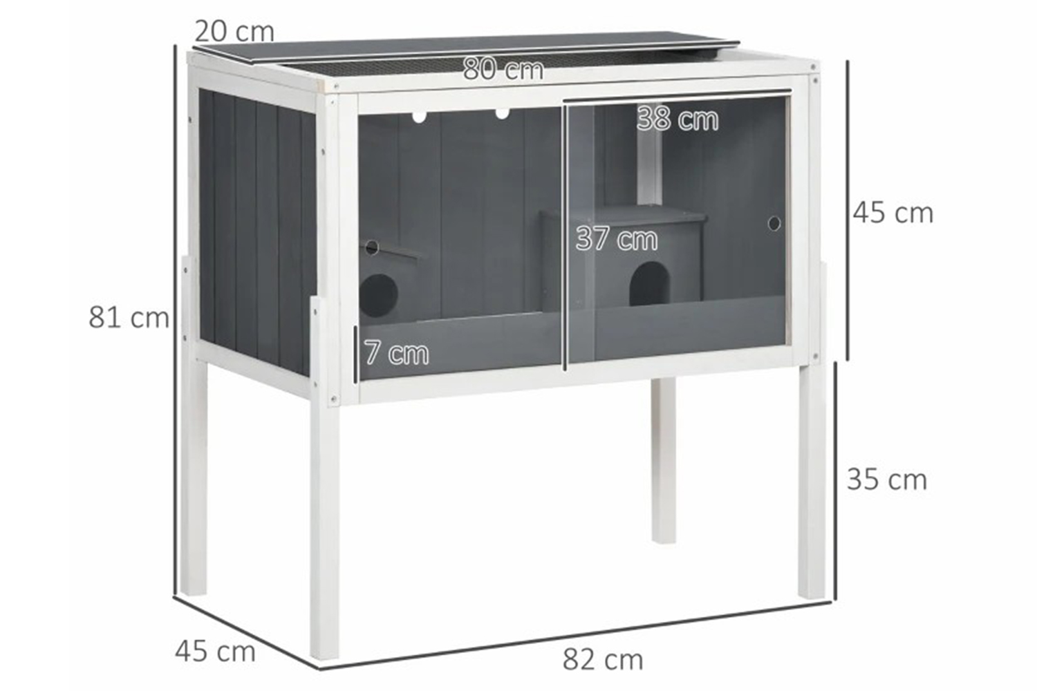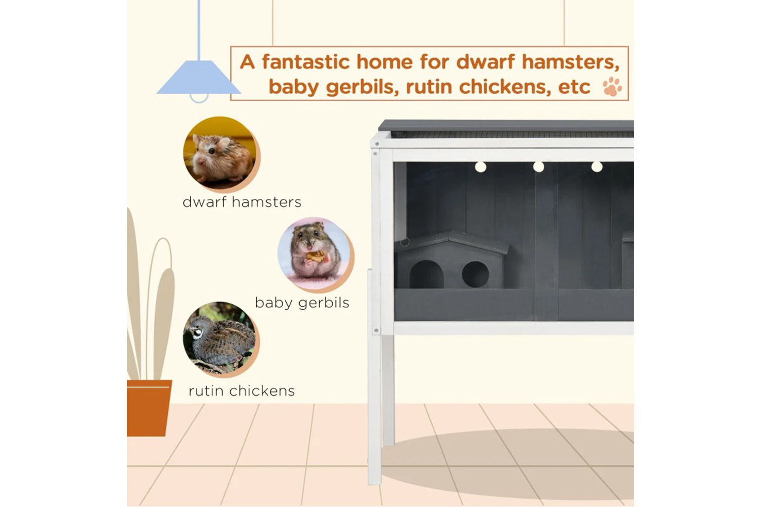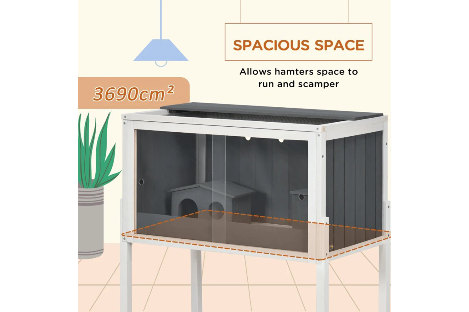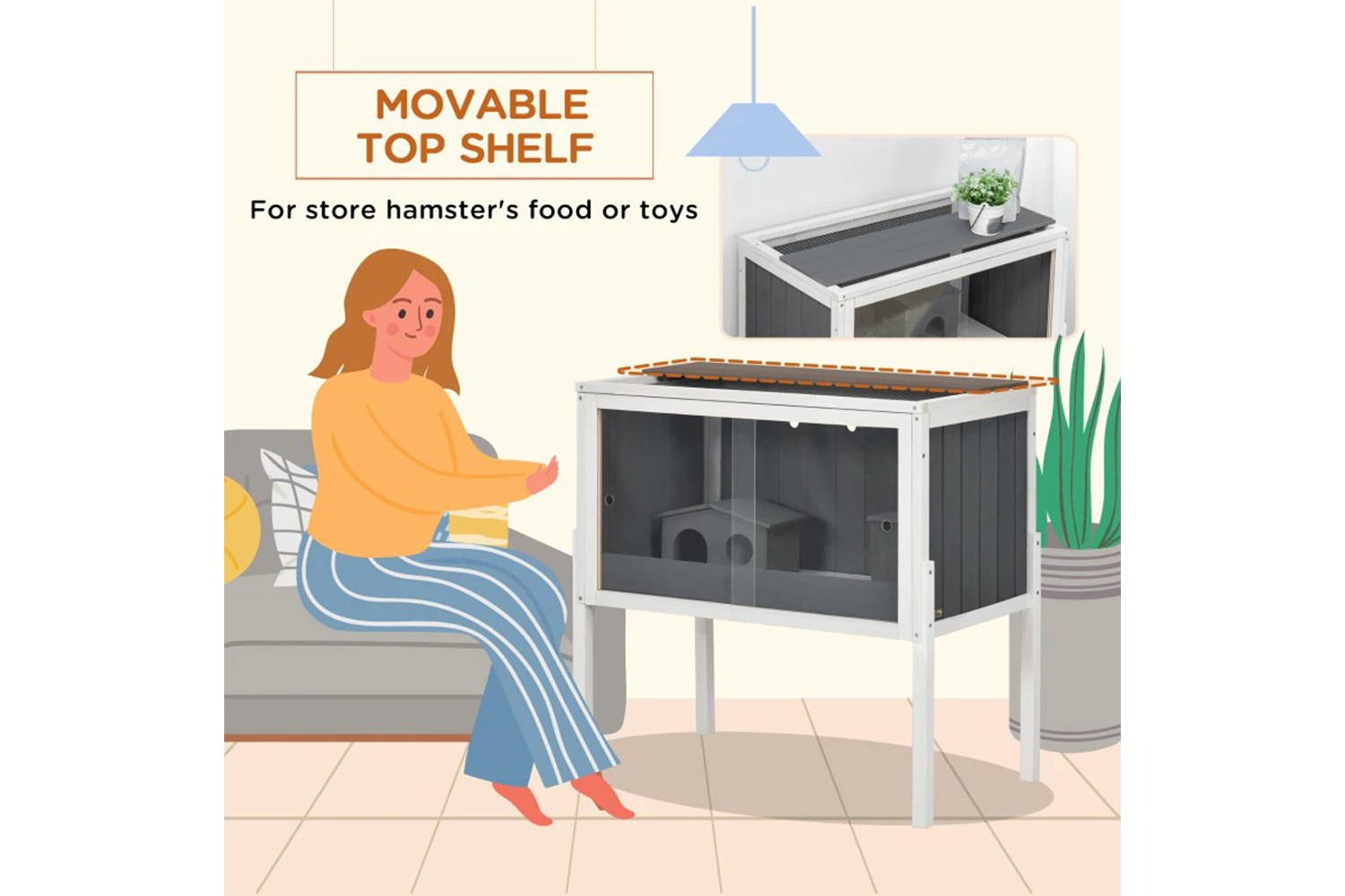 With this PawHut hamster cage, small pets have a safe and active place to call home. It has over 3000 cm² of space, where the two huts give them a choice of where to play and relax. There's a shelf on the top, which is great for storing pet supplies and more. Finished with sliding acrylic doors, you can see into the cage and watch your pets. This big hamster cage is the perfect home for dwarf hamsters, baby gerbils, rutin chickens and other similar sized animals.