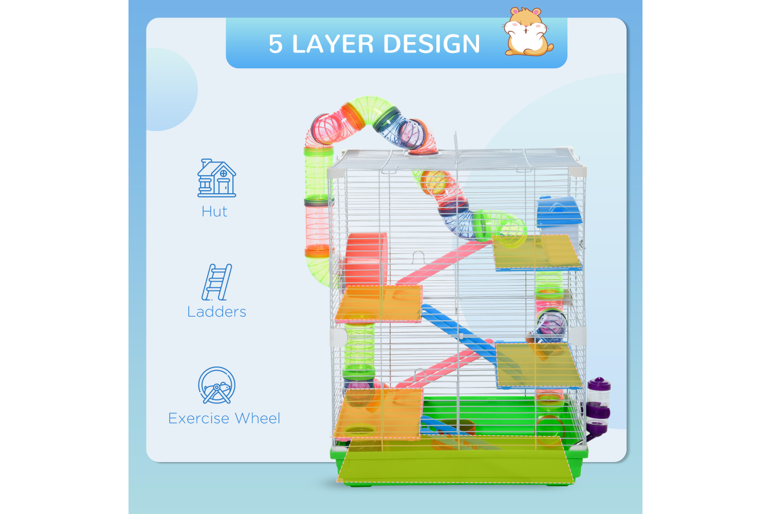 Keep your small pets stimulated, safe and happy with a multi-level indoor small animal cage kit from PawHut. 5-tier design offers ample space for your pet such as hamsters, mice, gerbils to exercise, explore, play and relax. This hamster cage starter kit includes the main habitat, water bottle, food dishes, play tubes and exercise wheels. Play tubing system add more fun and allows your small pet to move freely. Don't hesitate to buy it!