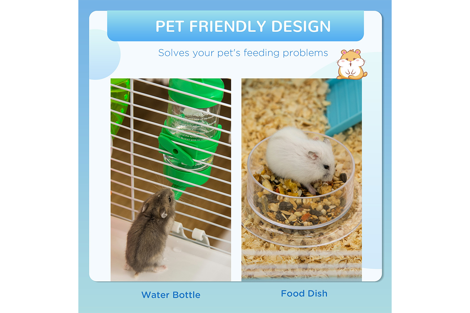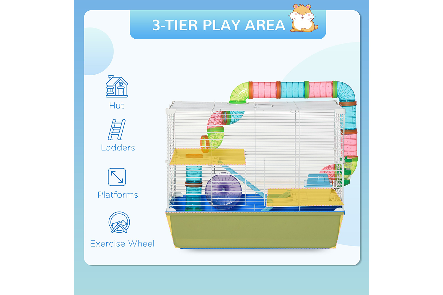 A happy home for small pets, thanks to this multilevel gerbil cage from PawHut. It comes with a platform, ramp and tube, providing lots of space for pets to play, rest and roam. They'll have an exercise wheel to keep active, whilst the food tray and water bottle ensures they're fed and hydrated. Its removable base makes cleaning easy, so their space stays tidy. Handle on the top for effortless carrying – you can take it anywhere, and your pets can always enjoy this comfortable habitat.