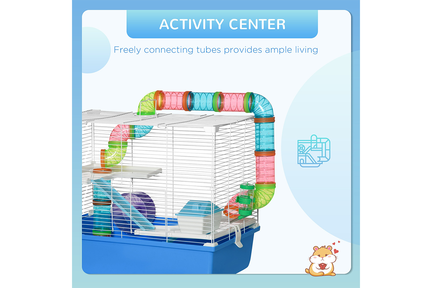 PawHut D51-234BU Hamster Cage with Tubes Tunnel Three-Level | Blue