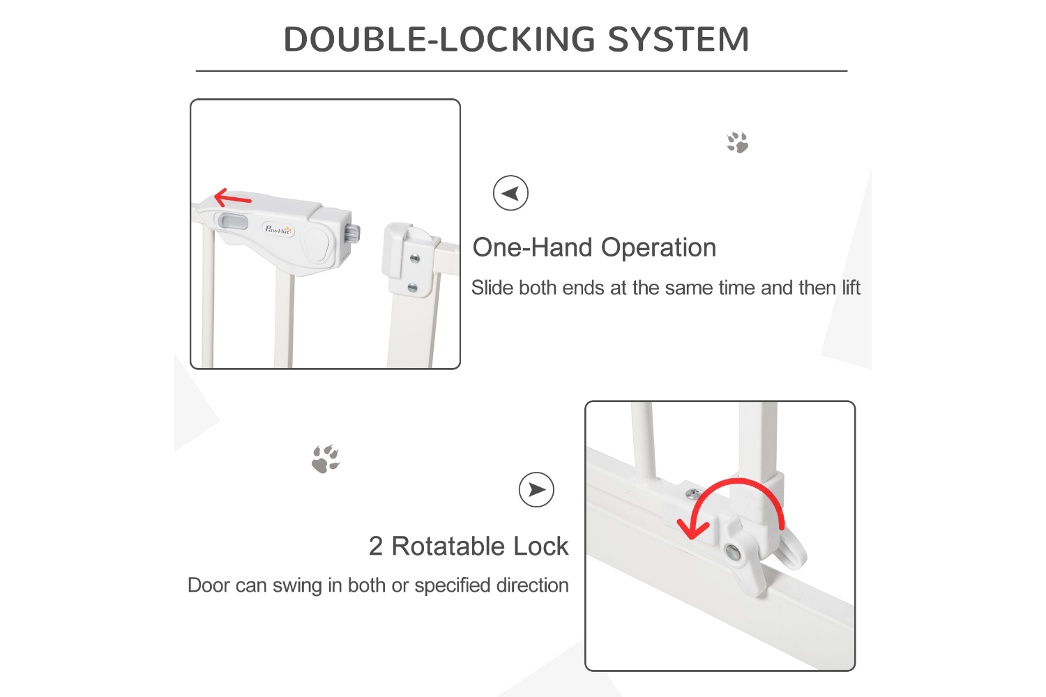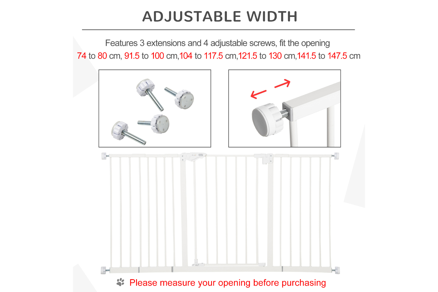 Need to keep pets away from certain places? This PawHut pet gate does the trick. Suitable for hallways, doorways and staircases, the width is adjustable for different sizes. Its metal frame stays in shape when in use, whilst the lead-free surface keeps pets safe. Door automatically closes if it's open at less than 90°, so it isn't a problem if left slightly open. Accessories are included, making it easy to assemble – you can get your gate up instantly, so pets stop going to restricted areas.