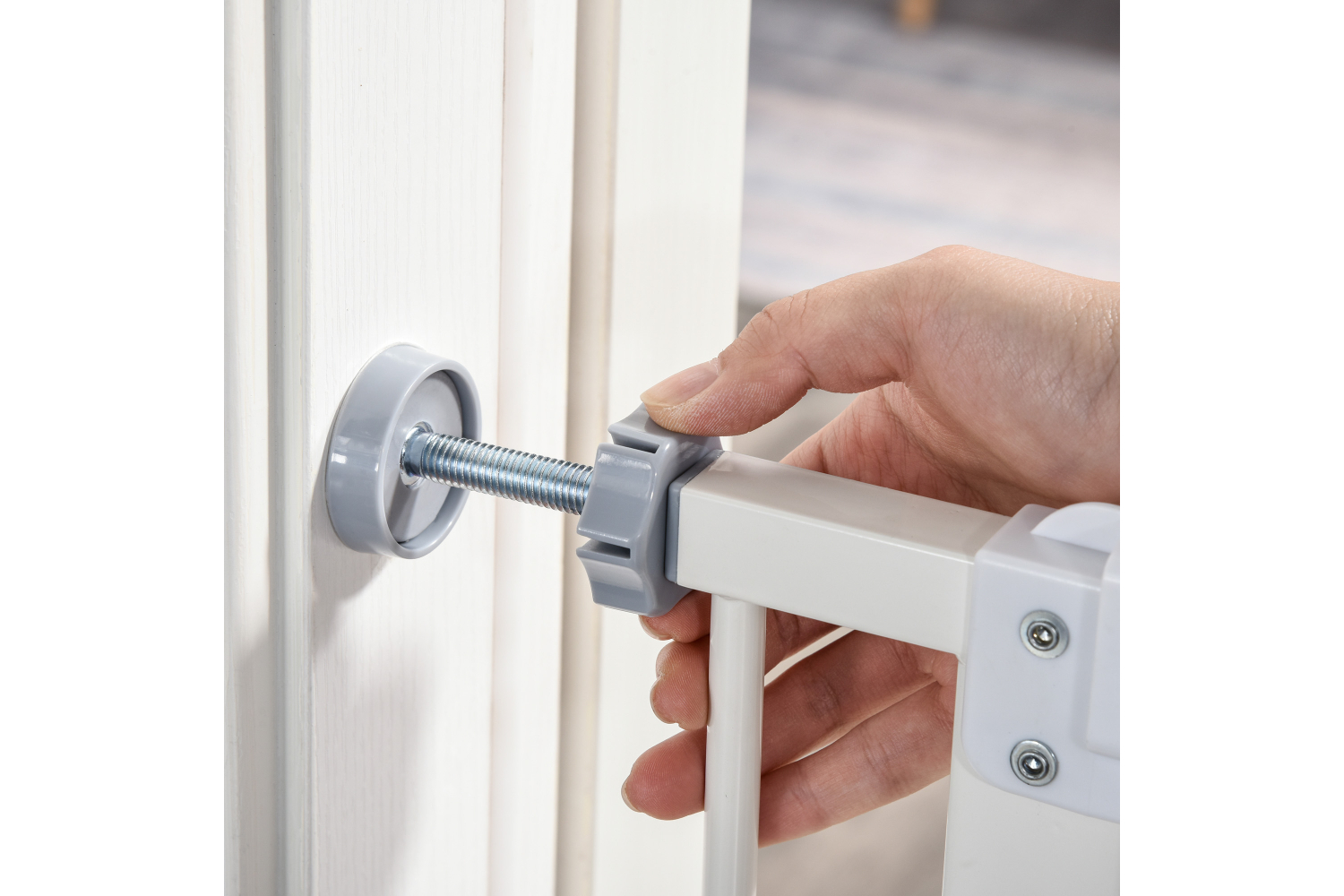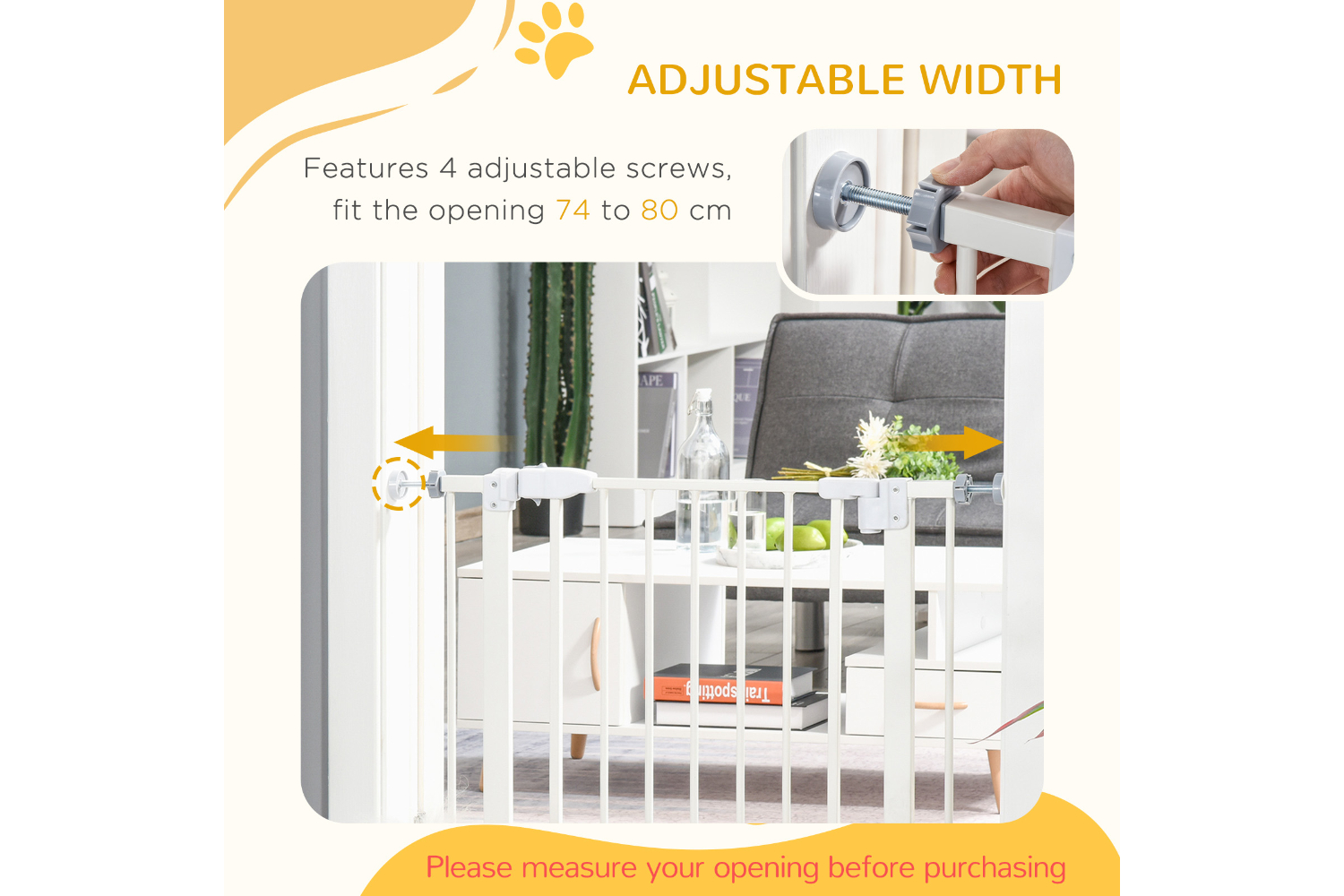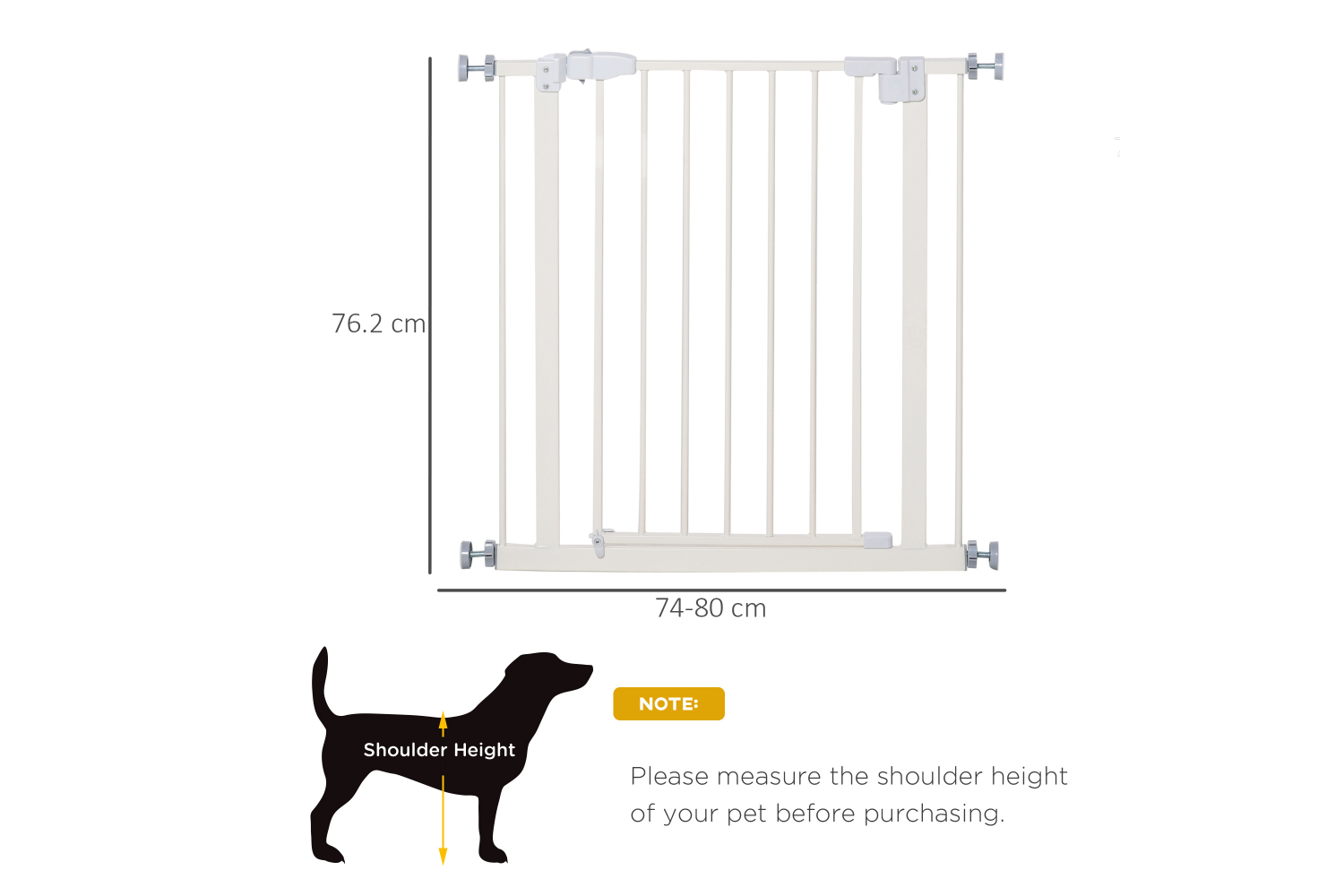 Keep pets away from rooms when required with this safety gate from Pawhut. Made from sprayed metal with lead-free and non-toxic treated surface for strength and safety. 4 adjustable screws included, ranging from 74cm to 84cm wide, allowing it to fit into different sized spaces with ease. Slide and lift, the handle is easy to open, allowing you to pass through quickly without your pet escaping for security. And 2 rotatable locks on the bottom allows the door can be opened in both or one specified direction. Double locking mechanism ensures your pet secured in a place to provide the maximum safety. Besides, the door can be closed automatically for more convenience. With all hardware included, this gate it easy to set up, saving you time and effort. Ideal for homes with pets.