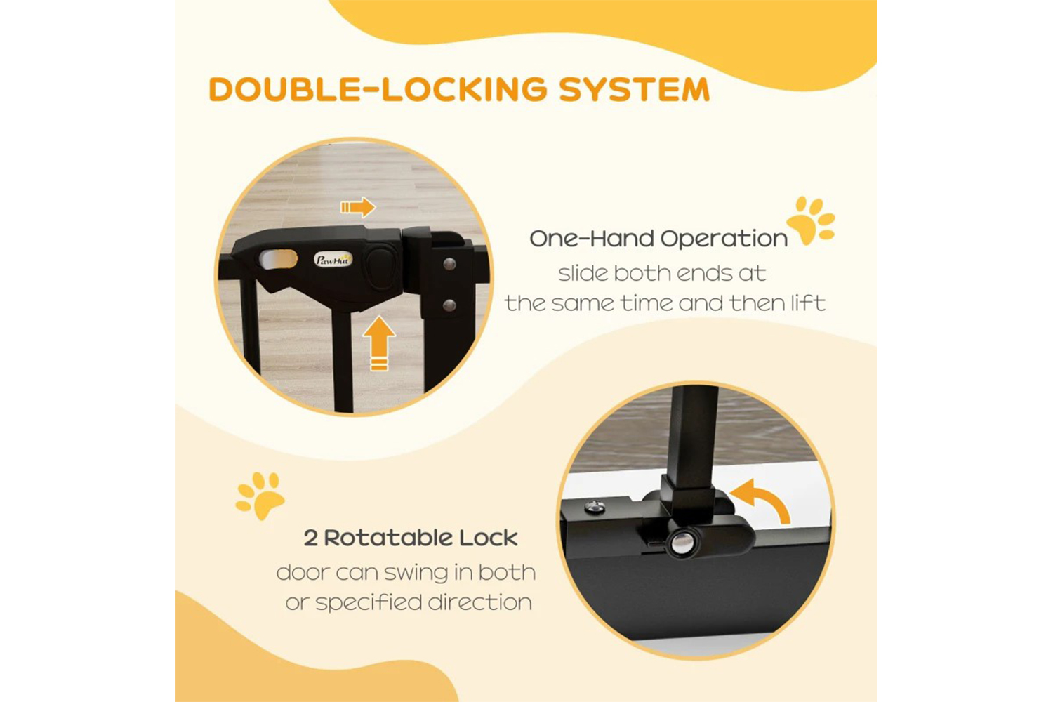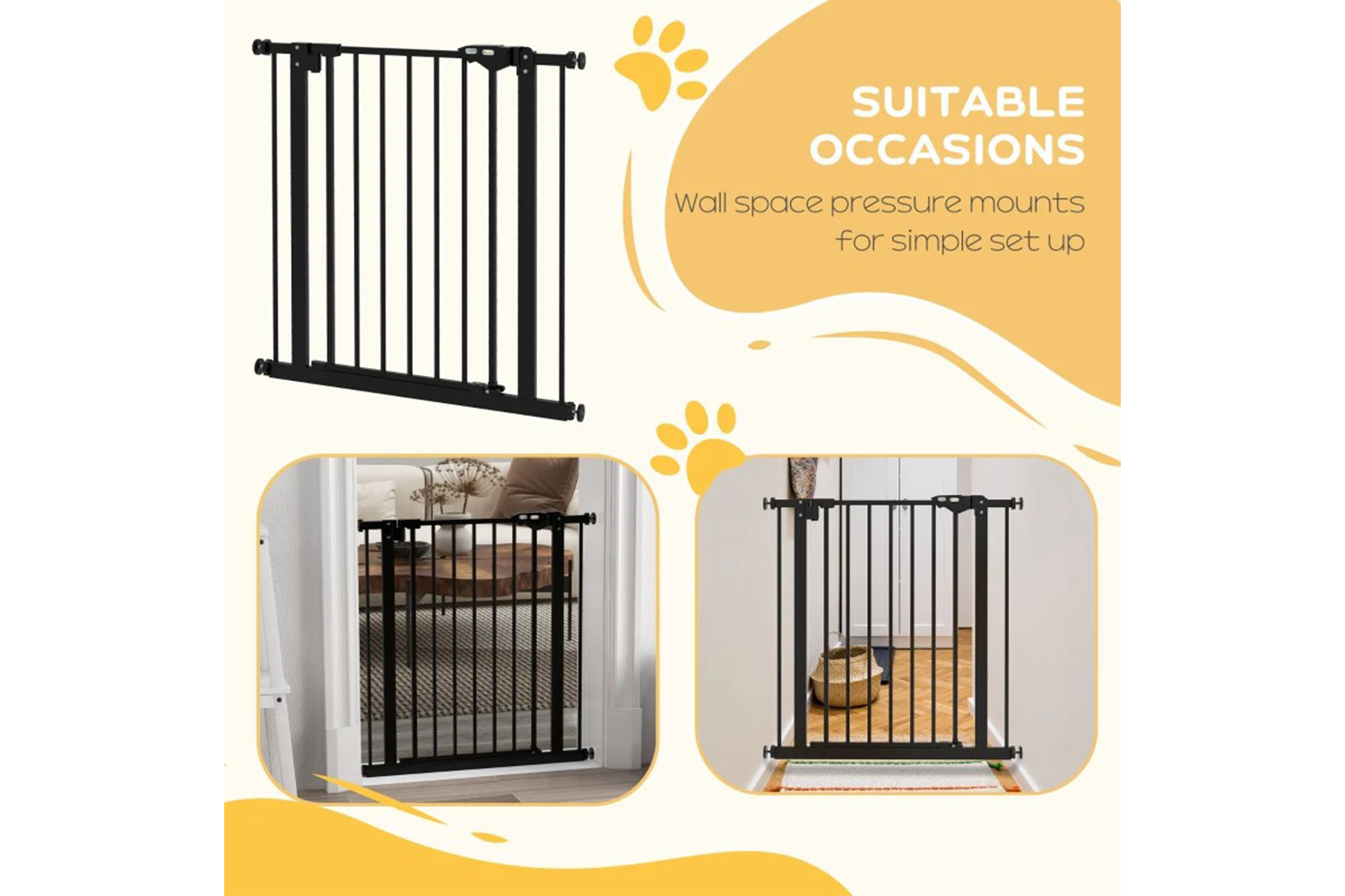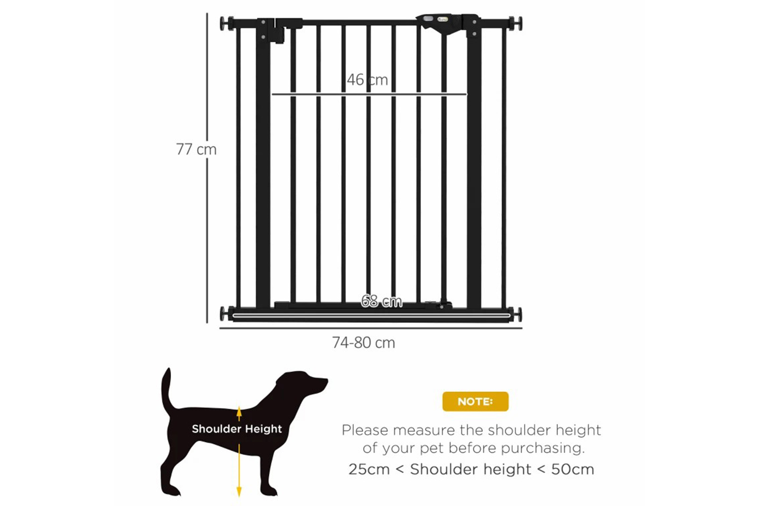 Need to keep pets away from certain places? This PawHut pet gate does the trick. Suitable for hallways, doorways and staircases, the width is adjustable for different sizes. Its metal frame stays in shape when in use, whilst the lead-free surface keeps pets safe. Door automatically closes if it's open at less than 90°, so it isn't a problem if left slightly open. Accessories are included, making it easy to assemble – you can get your gate up instantly, so pets stop going to restricted areas.