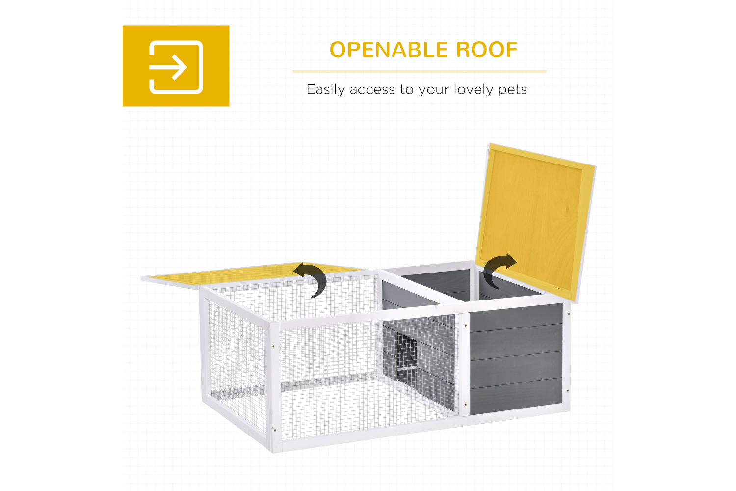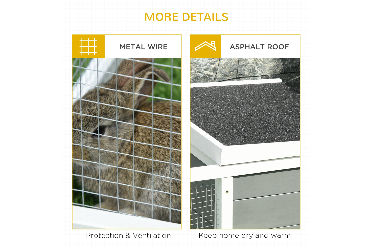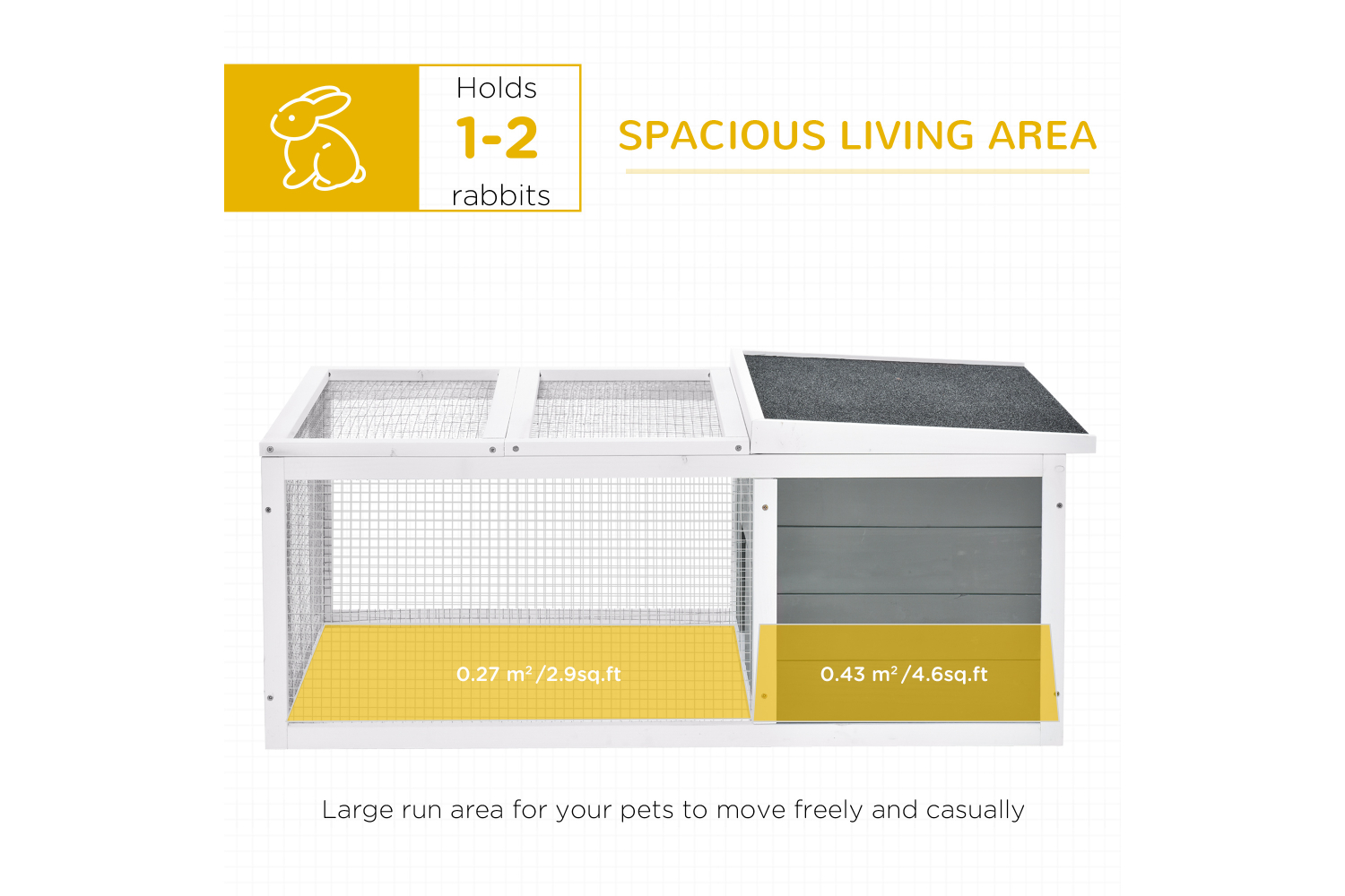 Does your little lovely pet need a safe and protected play space? Our pet house offers a great living/playing/exercising area for rabbit, bunny and other small animals. The sturdy wooden frame structure and asphalt roof can block sunlight and rain outdoors. It also makes it easy for you to watch your fluffy friends and bring a clear view for them. No worry about windy, rainy, snowy, it can be with you and your pets for years.
