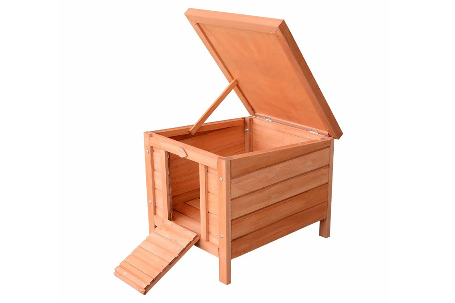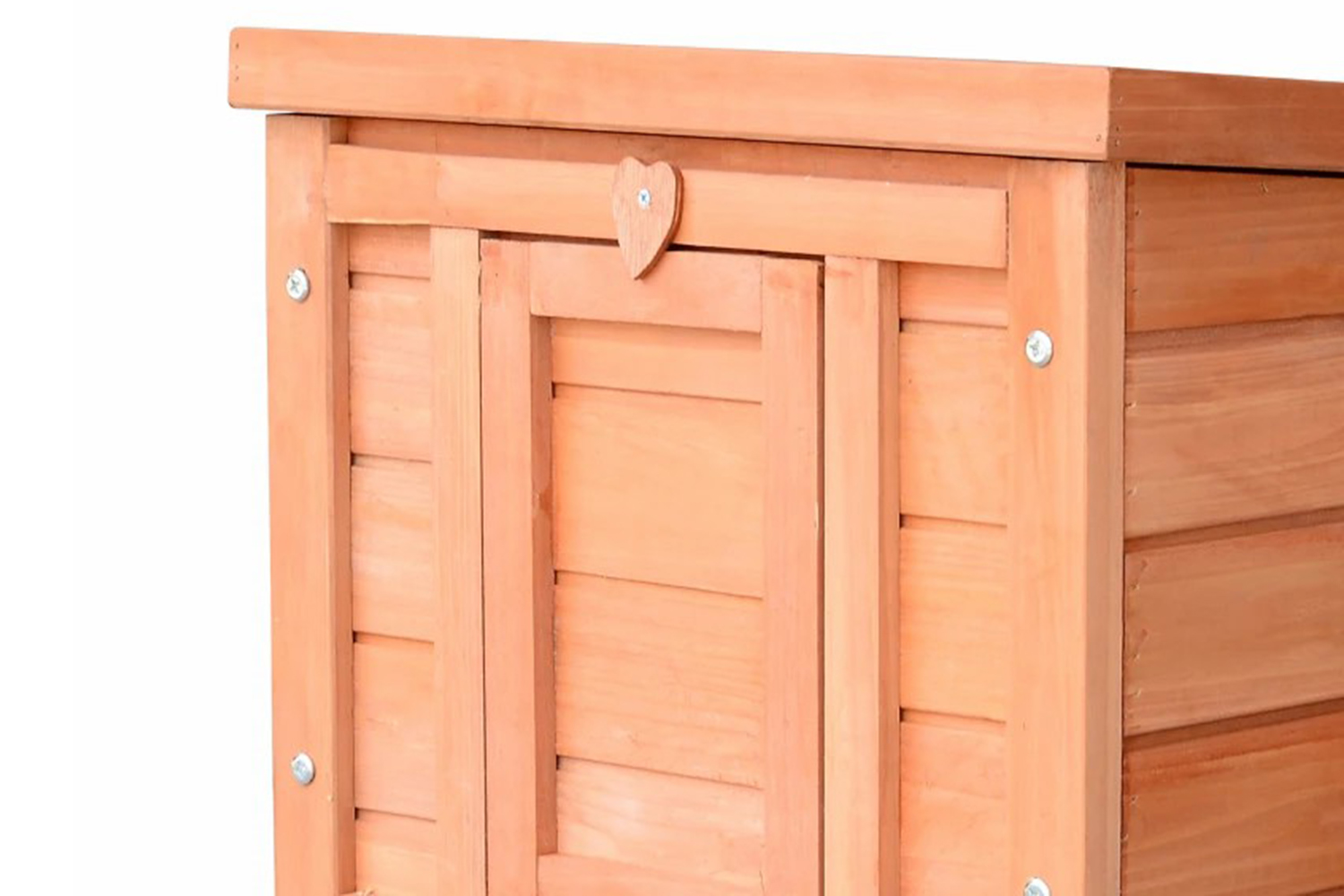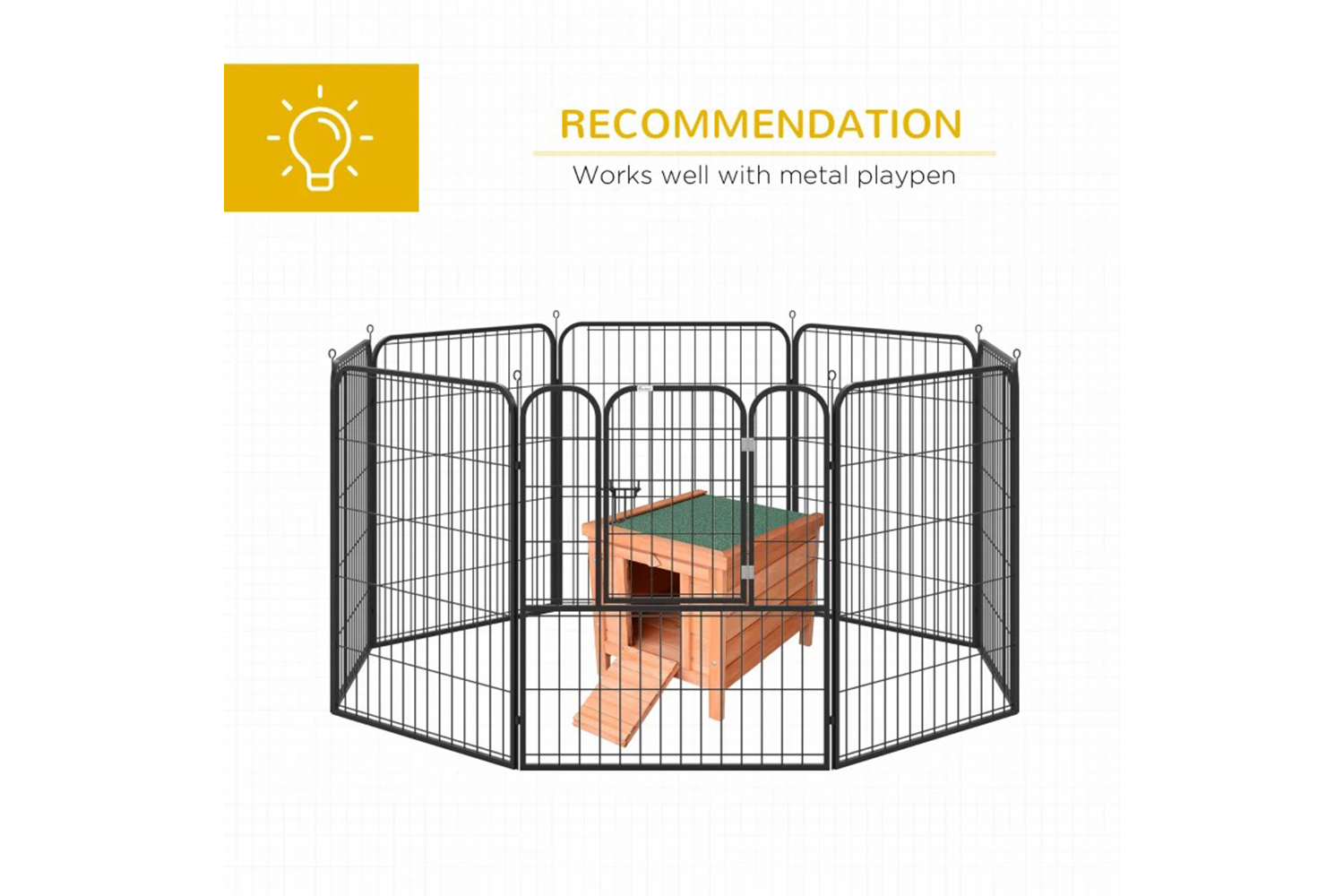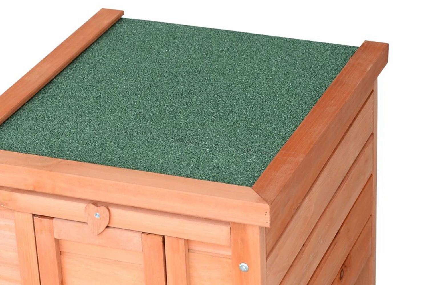 This outdoor pet shelter and rabbit hideaway house from PawHut is the perfect retreat for your furry friend. Made from fully treated and grooved fir wood and designed as a living room for sleeping and playing. The front door opens into a ramp that allows your pets to climb into it easily. The weather-resistant roof is covered in durable composite shingles and will protect your furry friends from adverse weather such as rain, snow, sun, and wind. The raised floor of this house helps keep out insects and other animals and helps avoid trapped moisture. Height adjustable roof opens to the inside for easy cleaning and maintenance. The adjustable arm keeps the roof propped open for climate control.