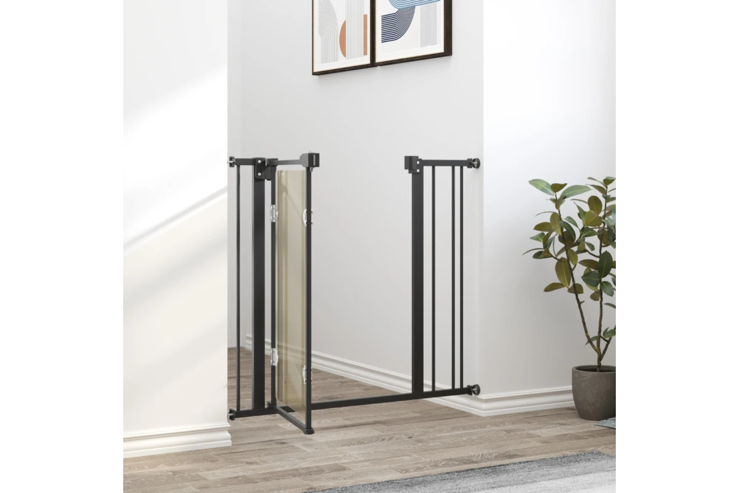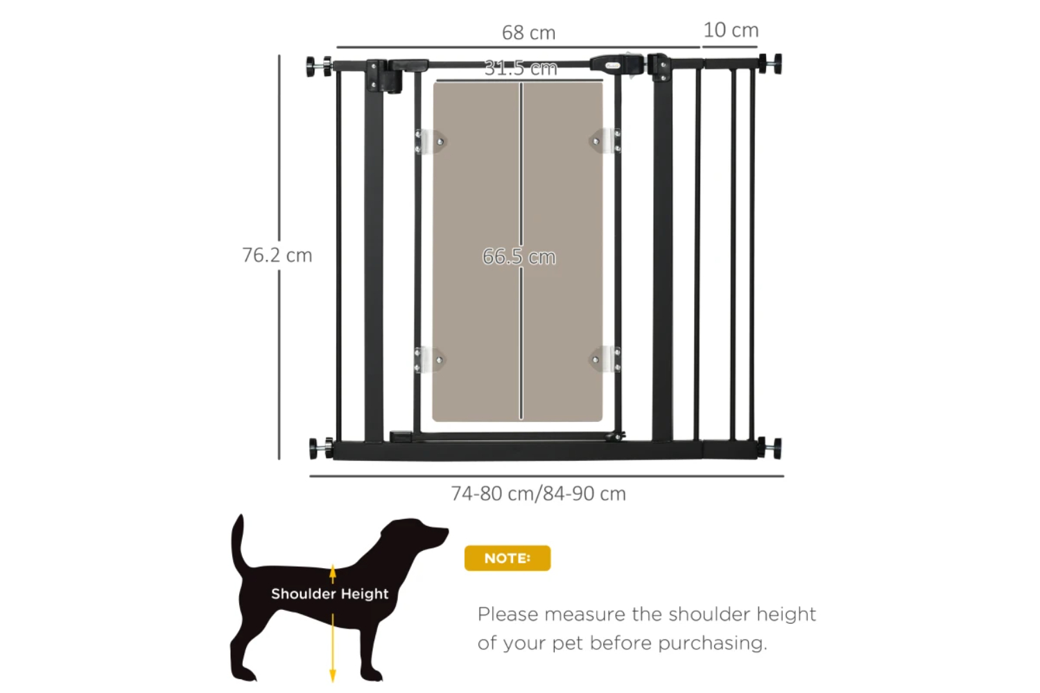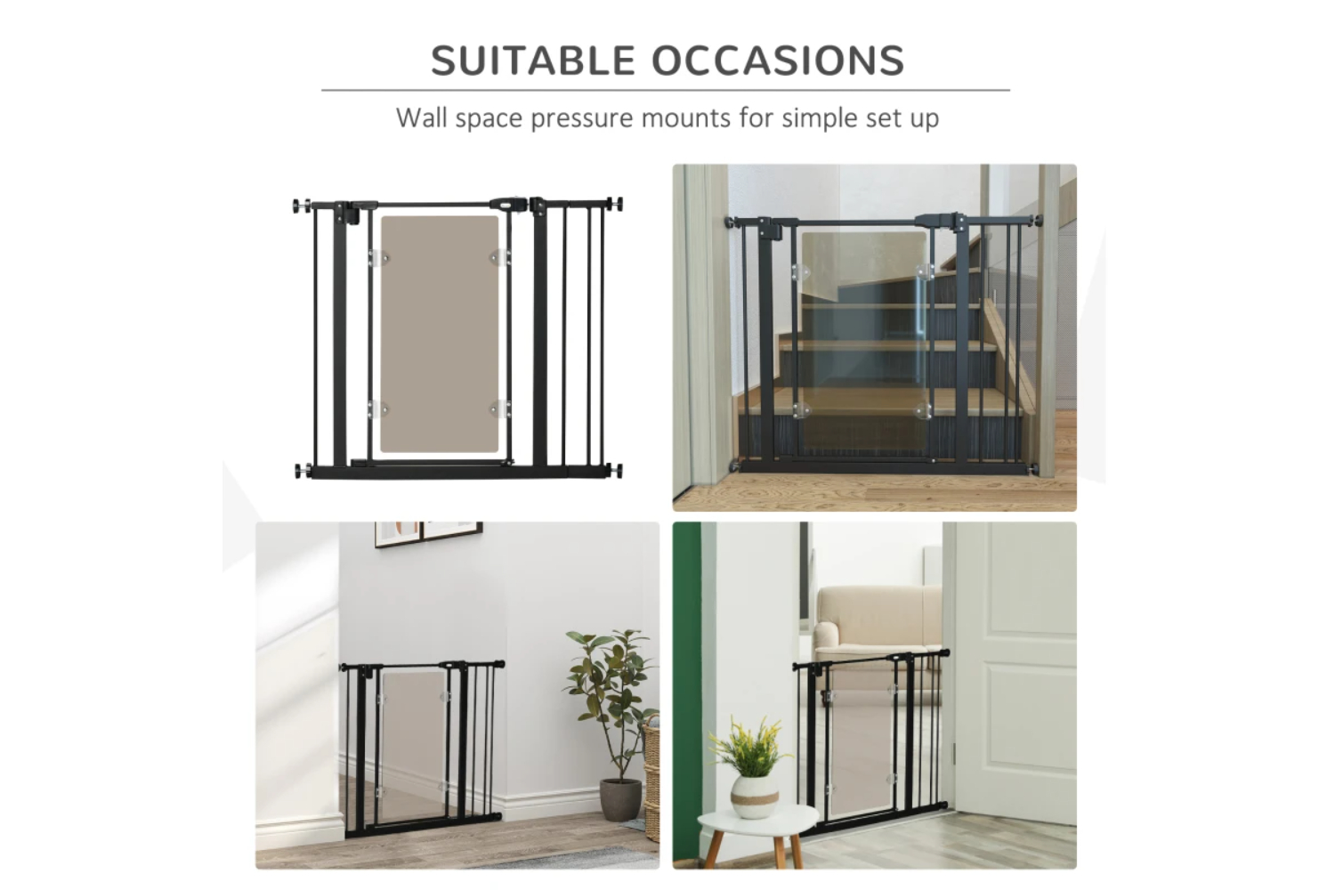 Keep pet from restricted area with this PawHut stair gate for dog. Suitable for hallway and staircase, it has an adjustable width of 74-80 cm or 84-90 cm for different spaces. The automatic closing function provides a degree of convenience and the automatic closing latch requires both buttons to be pressed down to open the gate, providing security and safety for your pets. The dog stair gate made by acrylic panel with unique shape and beautiful style, it looks like aesthetically pleasing