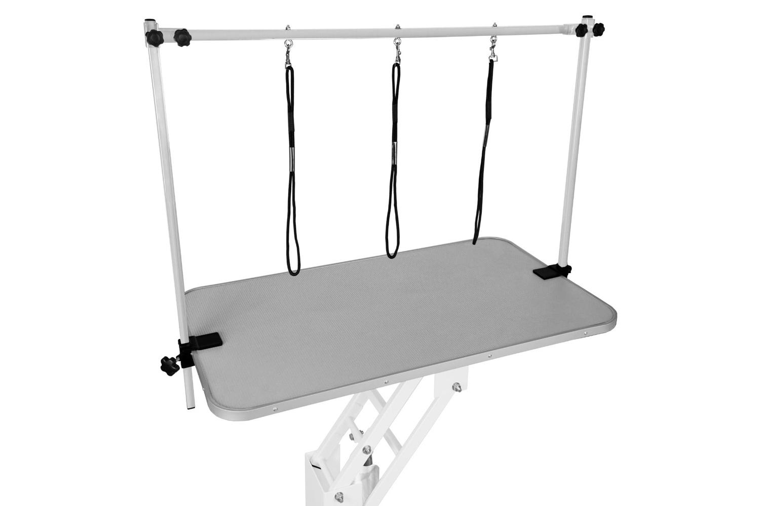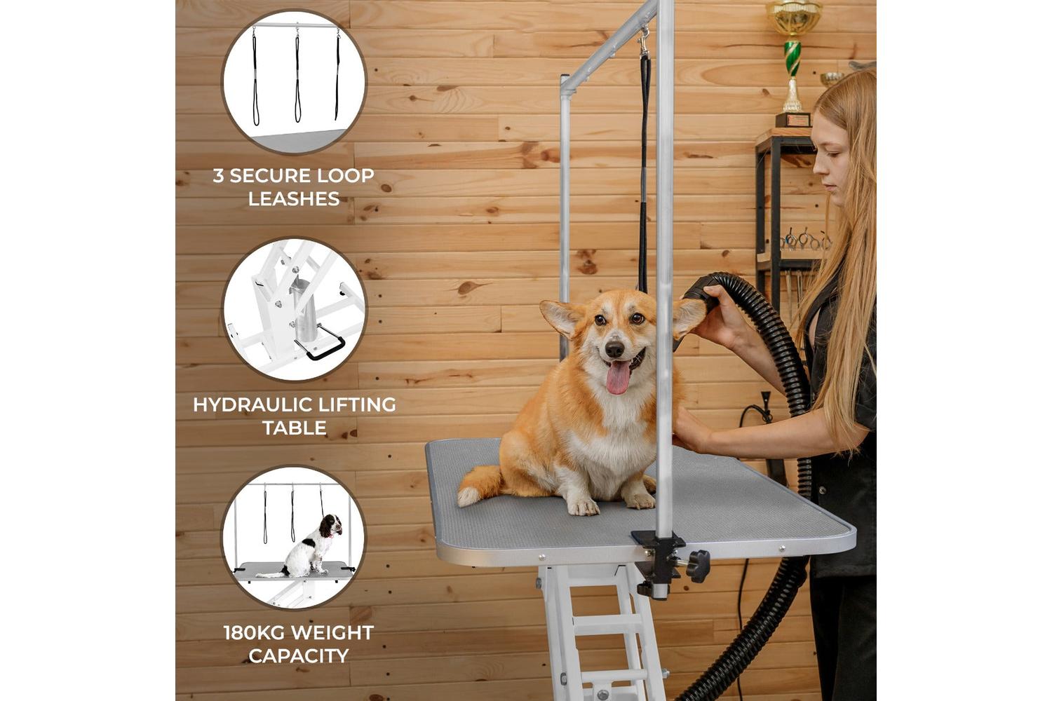 The expansive pet-friendly surface, measuring 106cm x 61cm, comfortably accommodates a variety of dog breeds and sizes. Withstanding up to 180kg of pet weight, this grooming table serves as a generous grooming Centre, be it for home or professional use. Adjust the table height seamlessly between 55.5cm to 101.5cm courtesy of the hydraulic foot pump, while the height-adjustable H-Bar extends convenience and support during grooming.