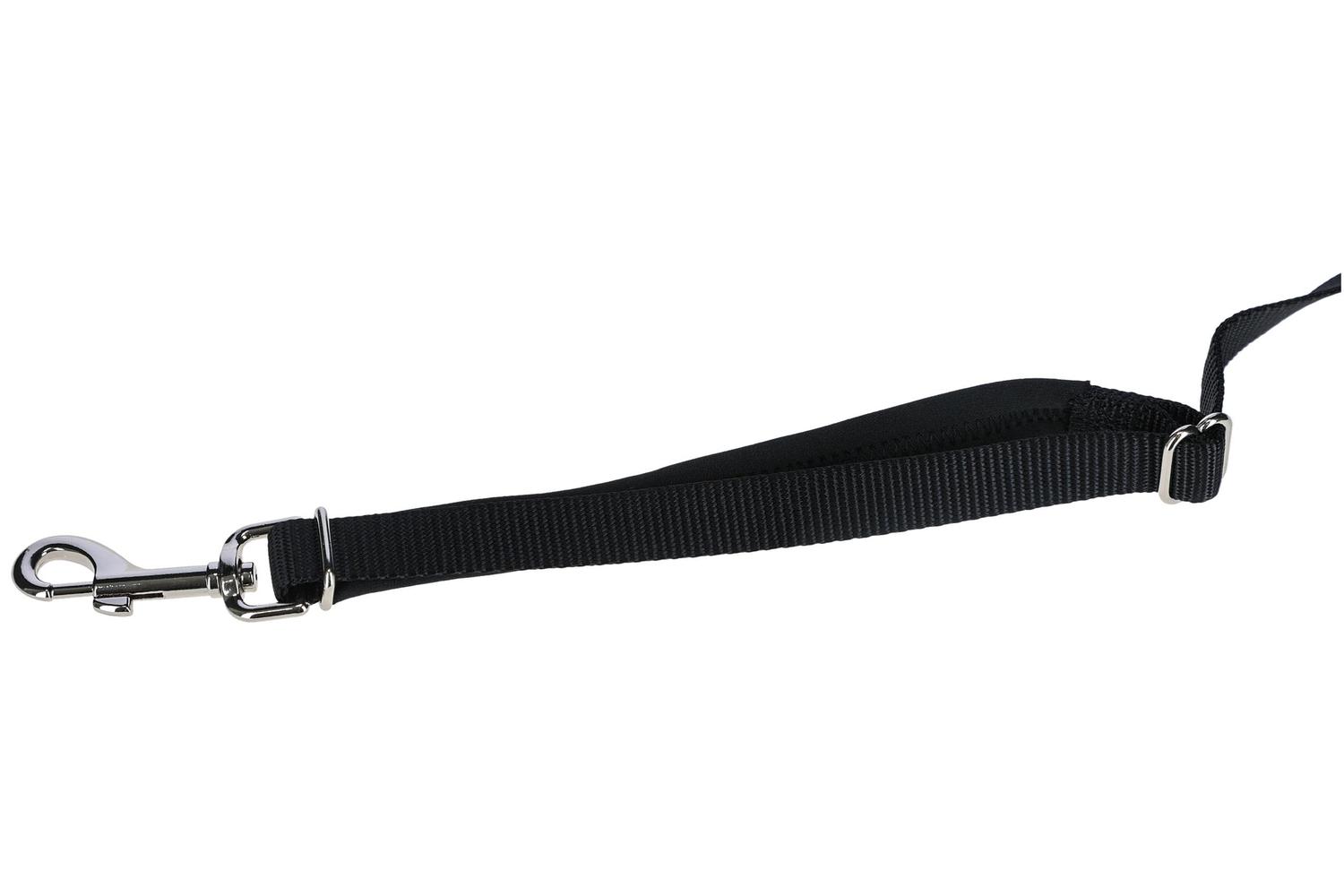 This adjustable nylon belt features an integrated short guide, making it convenient for various uses. The belt is padded for comfort and infinitely adjustable, also doubling as a waist belt if needed. The clip closure allows for quick opening, while the sturdy nylon fabric comes in bright colors for visibility. The robust fittings include carabiner hooks for added versatility and durability.
