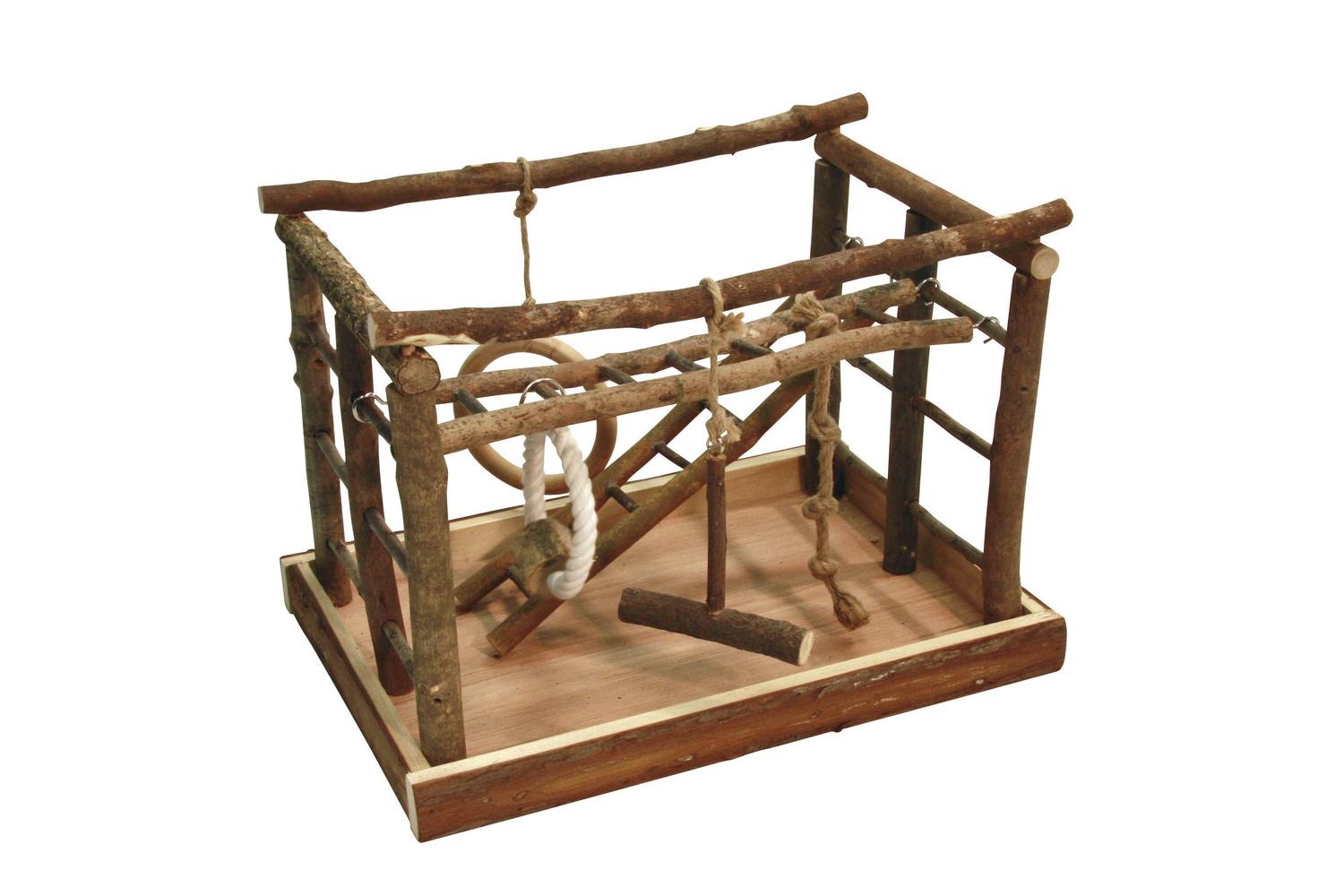 Includes a 10 cm diameter wooden swing, 2 ladders, a landing area, cotton rope, and a ring. Easy to mount, measuring 25 x 35 cm.