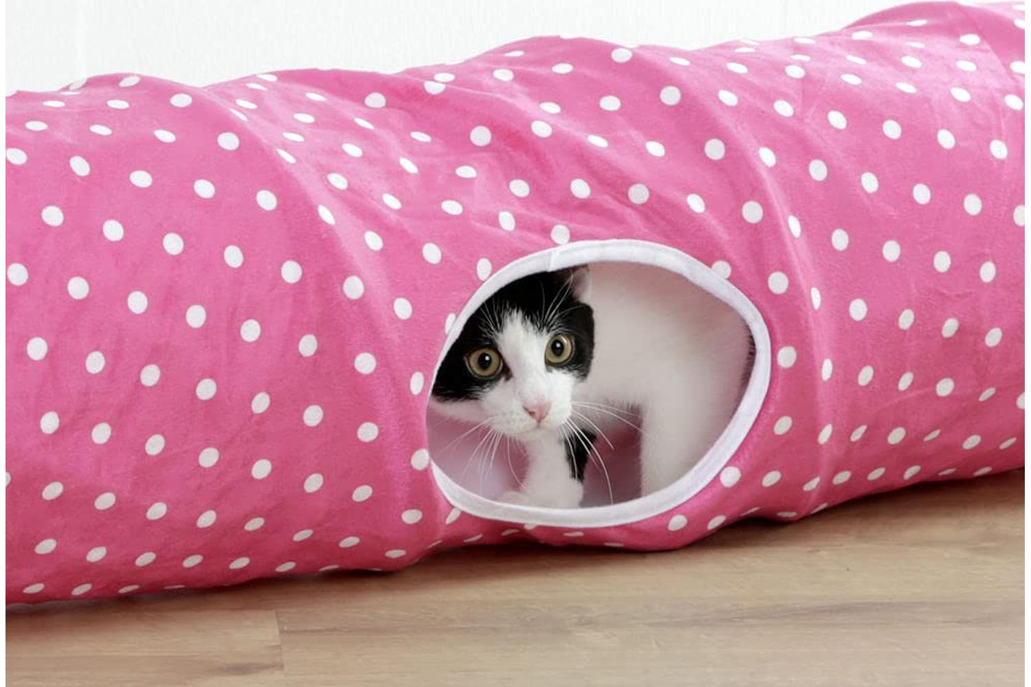 This cat tunnel features a charming pink and white polka dot design that will delight both you and your feline friend.