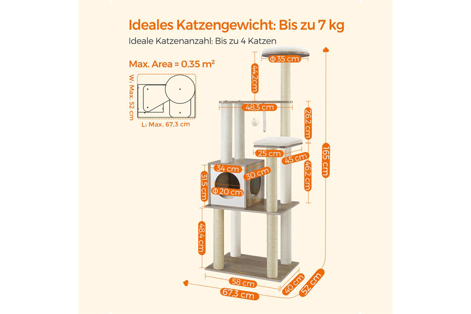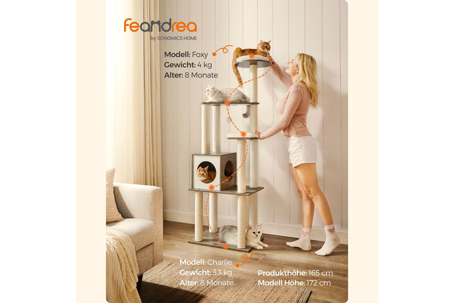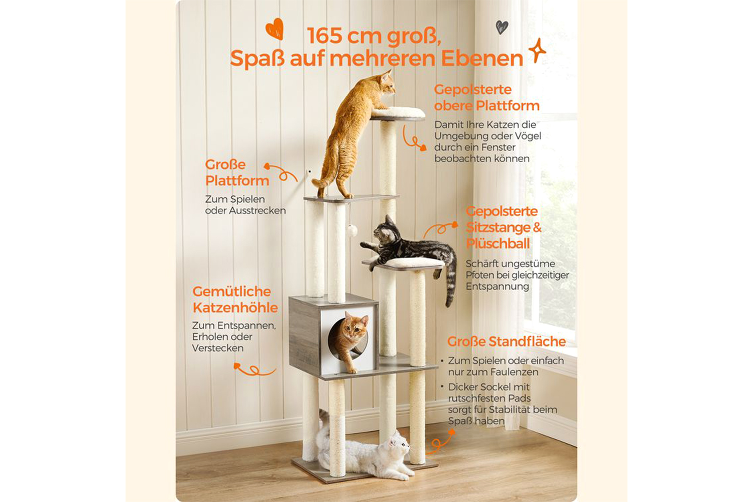 This 165cm tall cat tree makes full use of vertical space, offering multiple tiers and diverse fun - perfect for multi-cat households.