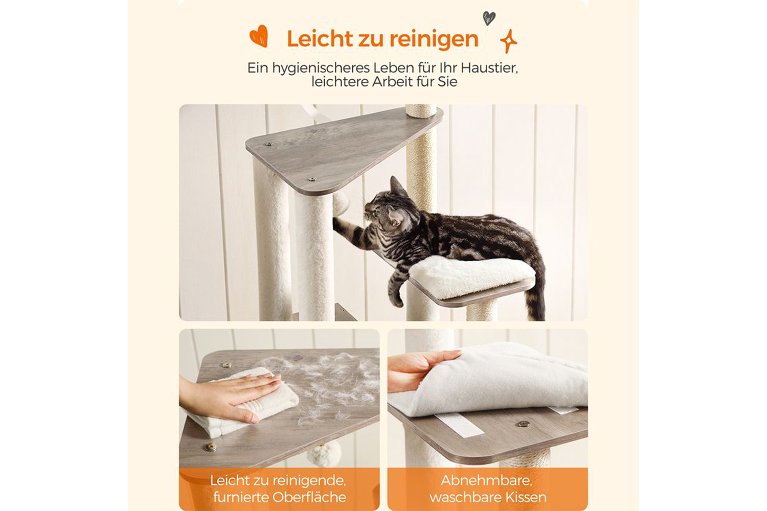 The veneered surface does not collect fur and is easy to clean with a cloth. The cushions can be cleaned with a lint roller for daily care and are removable and washable for cleaning.