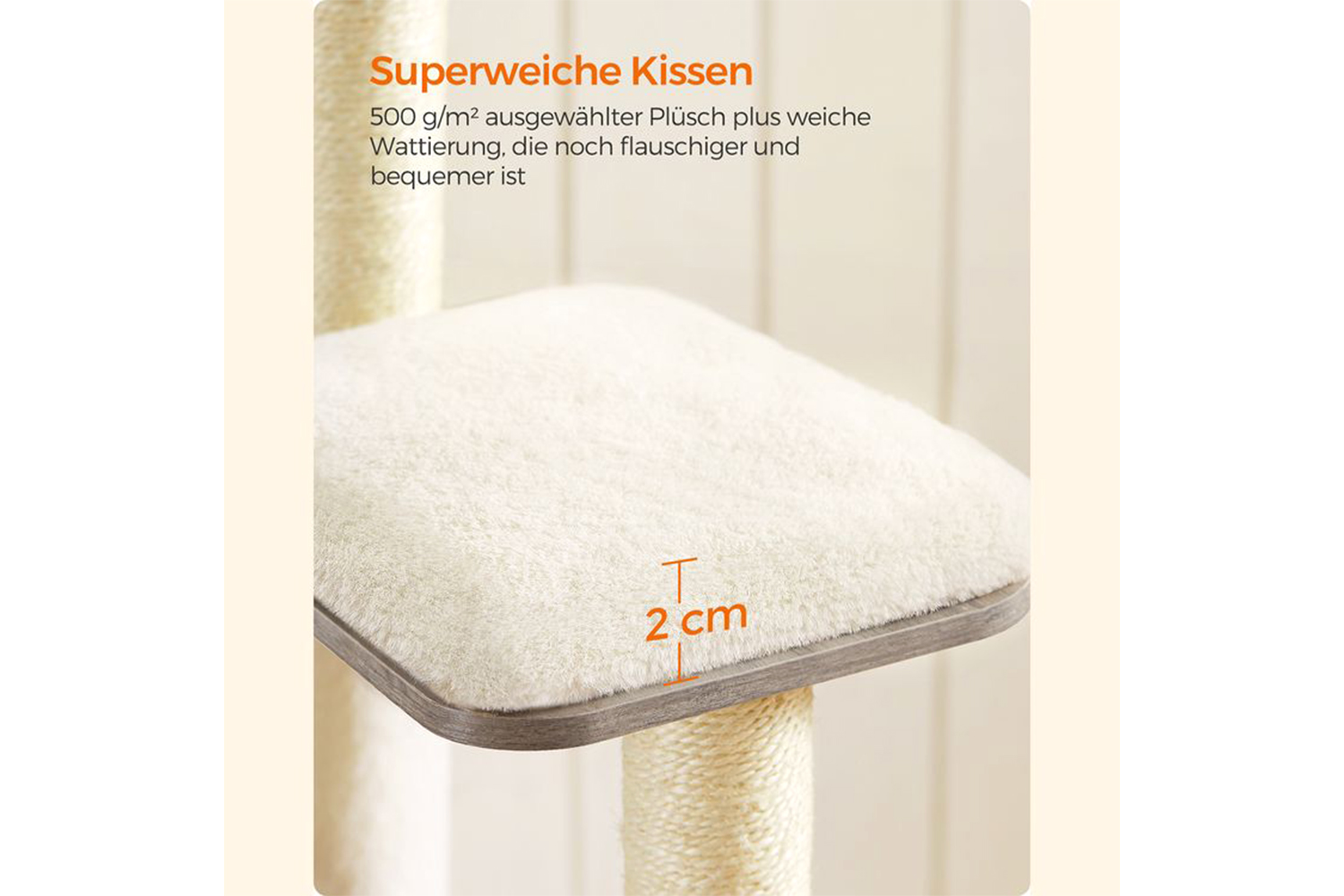 This XXL cat scratching post comes with three 2 cm thick cushions that are well padded and covered with 500 g/m² plush - even denser, softer and fluffier than conventional plush.