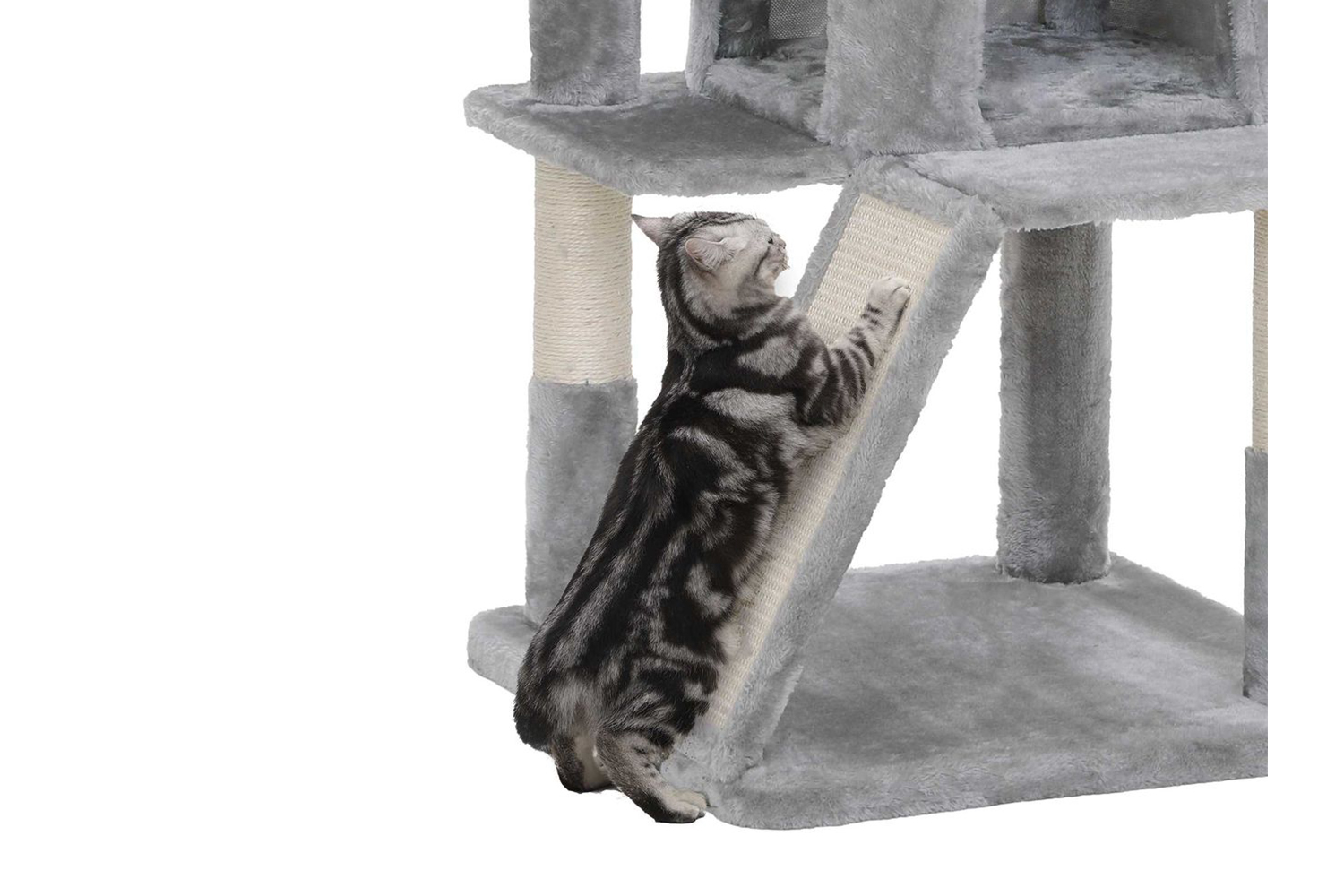 At the bottom of the cat tree is a scratching board to keep your couch safe from scratches. This board doubles as a step to help your kittens climb the cat tree and build muscle at the same time. It's cool !