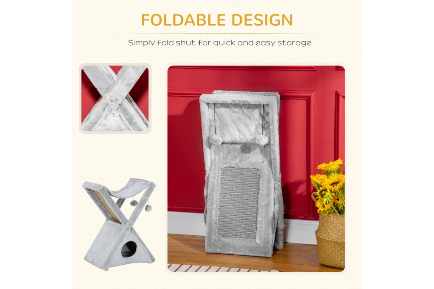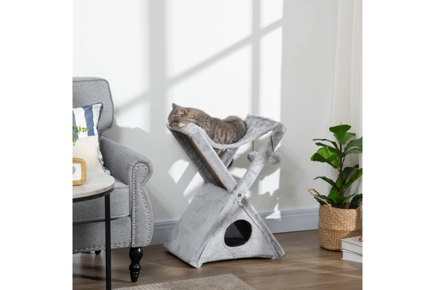 Give your cats and kittens a new favourite spot at home with this cat tree from Pawhut. In grey, it is crafted into a two-tier design which features a small house on the bottom, a hammock on the top, two hanging balls and a scratching board, allowing them to rest, relax and play. The frame, made from solid particle, supports up to 4kg and is covered in a soft, plush material to keep them comfortable and safe. Foldable by design, you can pop this tree up and store away for convenience, as well as take it with you when you travel. Great for saving your home furniture from damage as well as giving them own private spot.