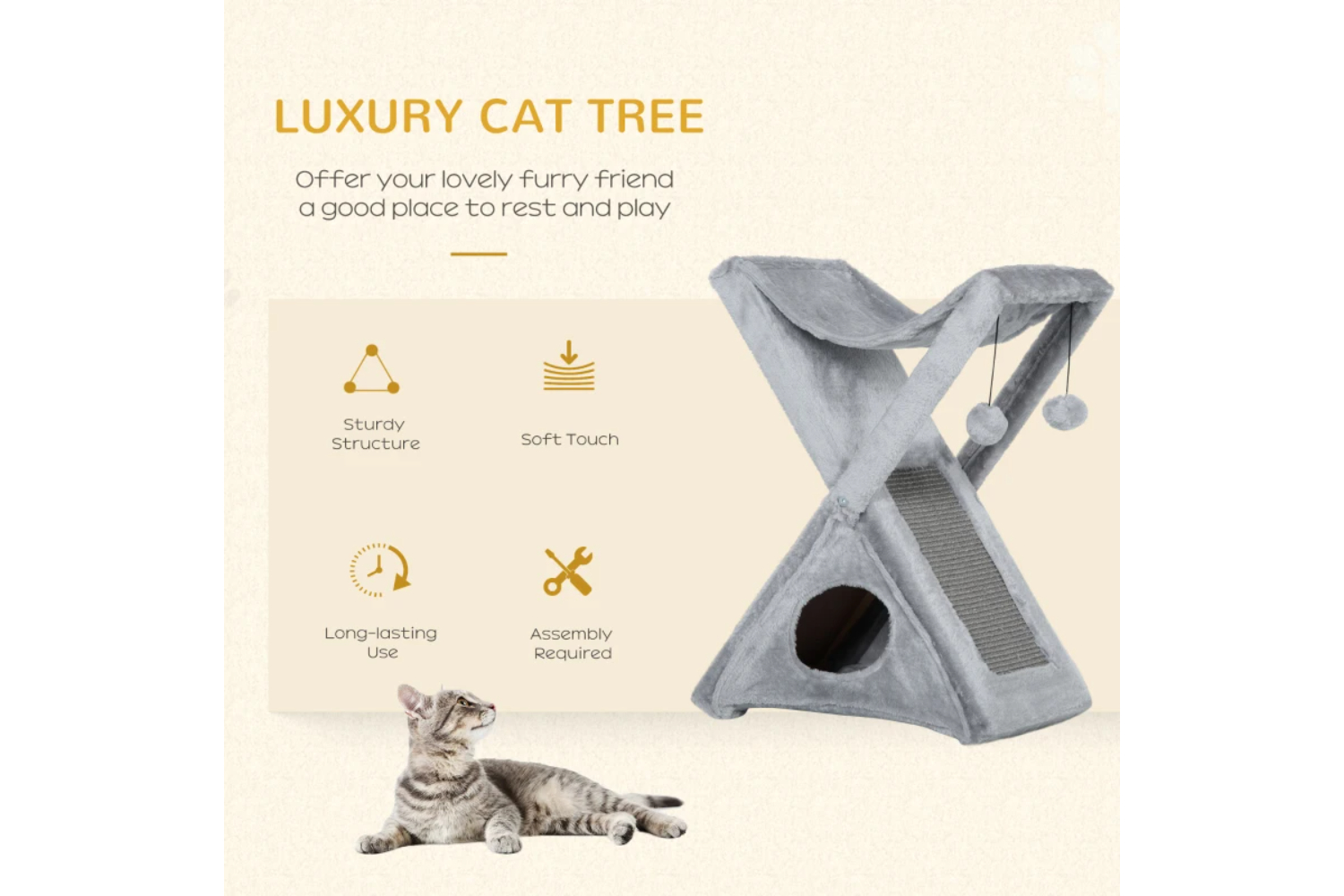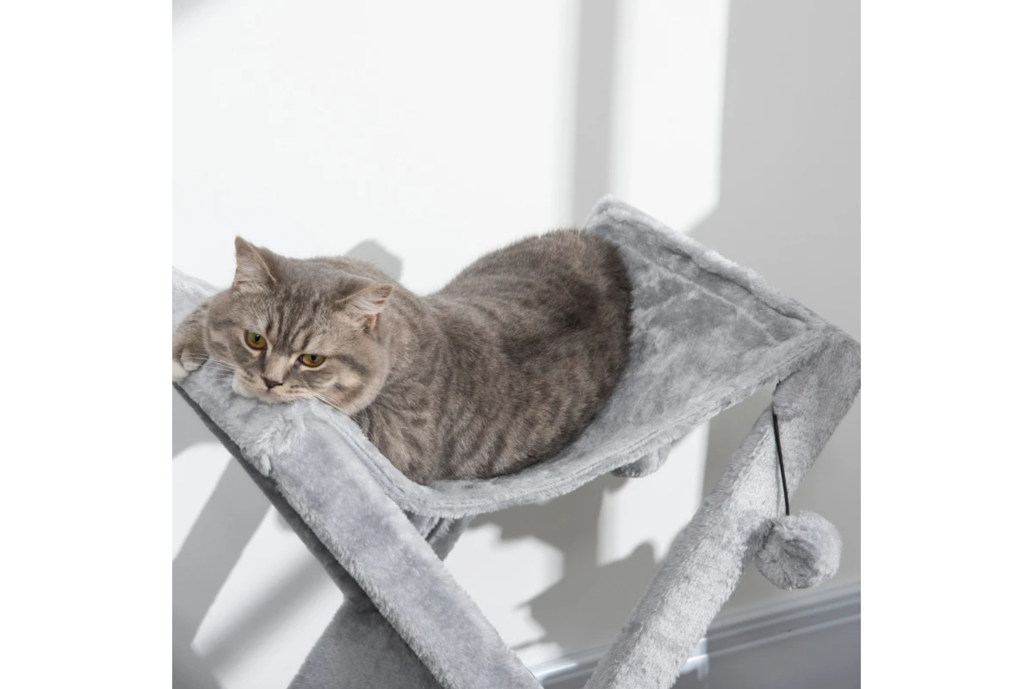 - Two-Tier design featuring a bottom hideaway spot and a top hammock with two hanging pom-poms for playing