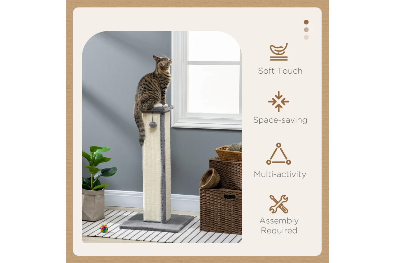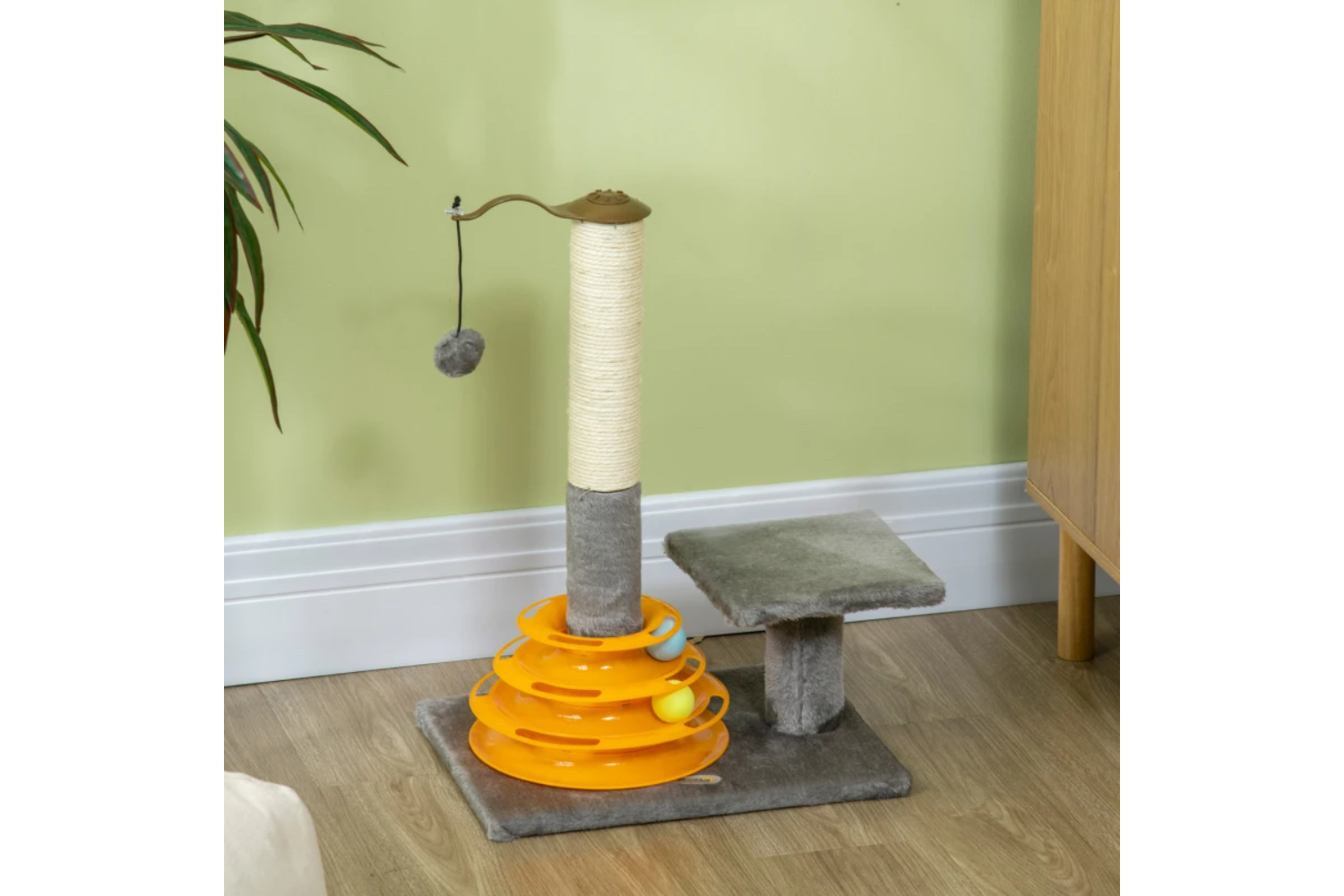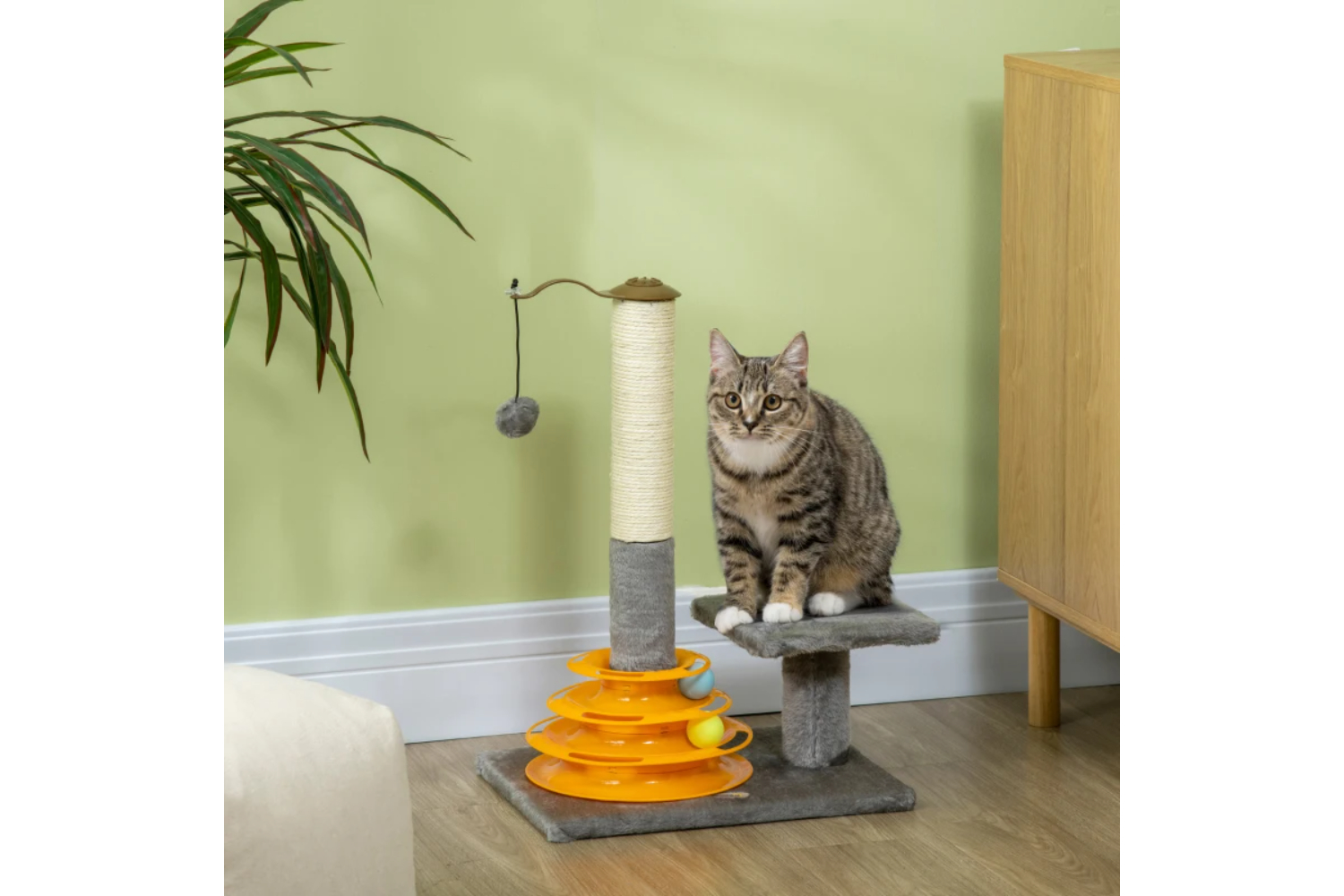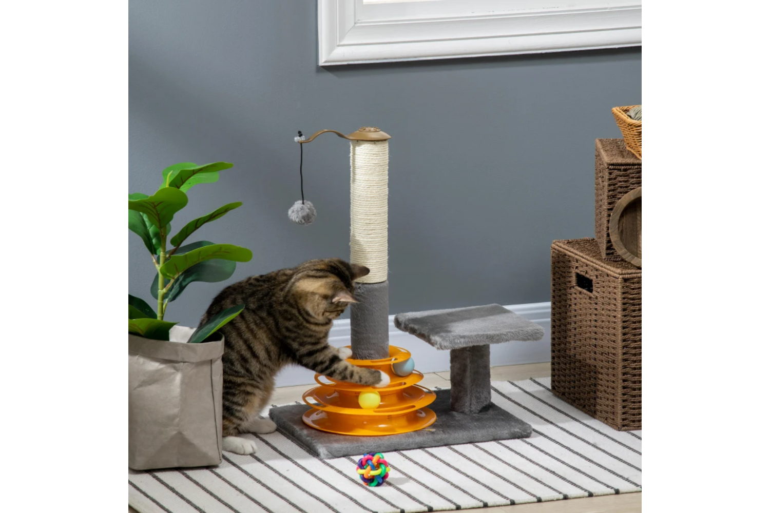 Satisfy your cat's natural instincts safely with this cat climbing tree from PawHut! This cat tree includes a sisal rope scratching post, a perch, a toy and a hanging ball toy for versatile play. Keep your furniture free of scratches and digs with this cat tower. Give your frisky felines a safe place to sharpen their claws on the cat activity center. From cat naps to play time, this cat tree gives your pets a place of their own to lounge, scratch and more.