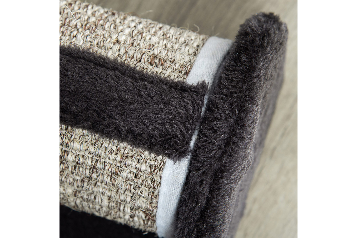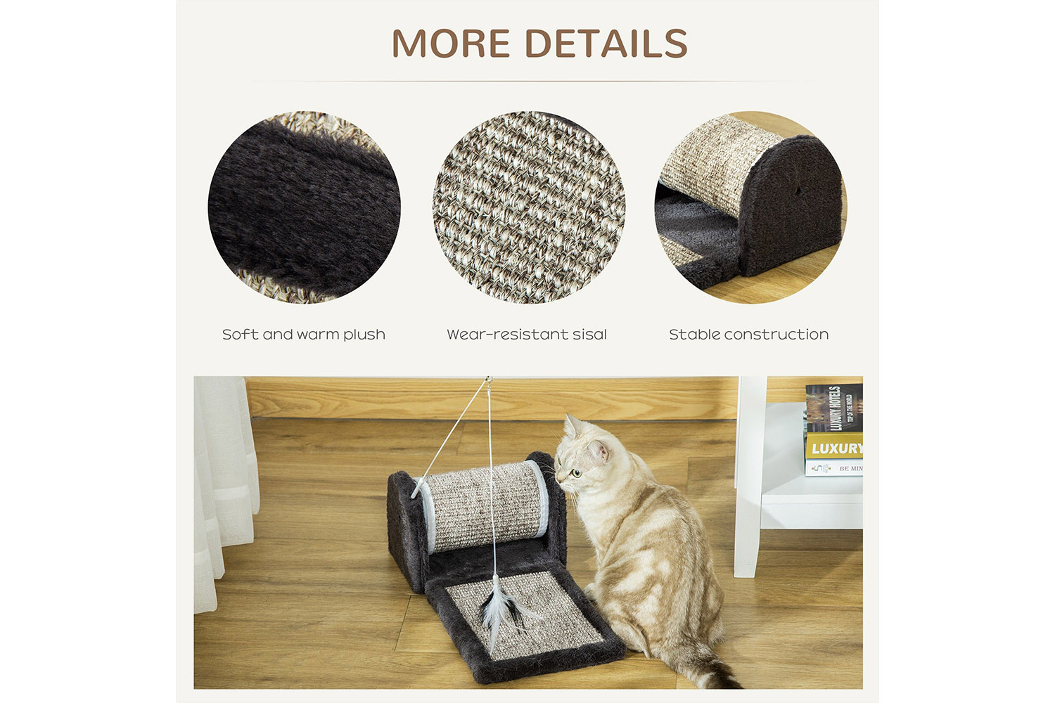- Material: Particle board, plush, sisal
