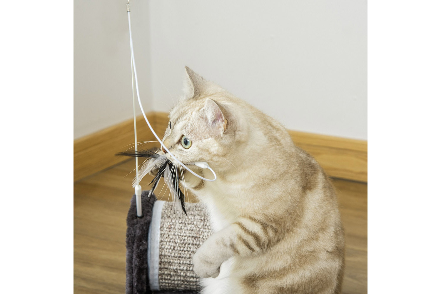 - Includes a feather toy for when it's playtime