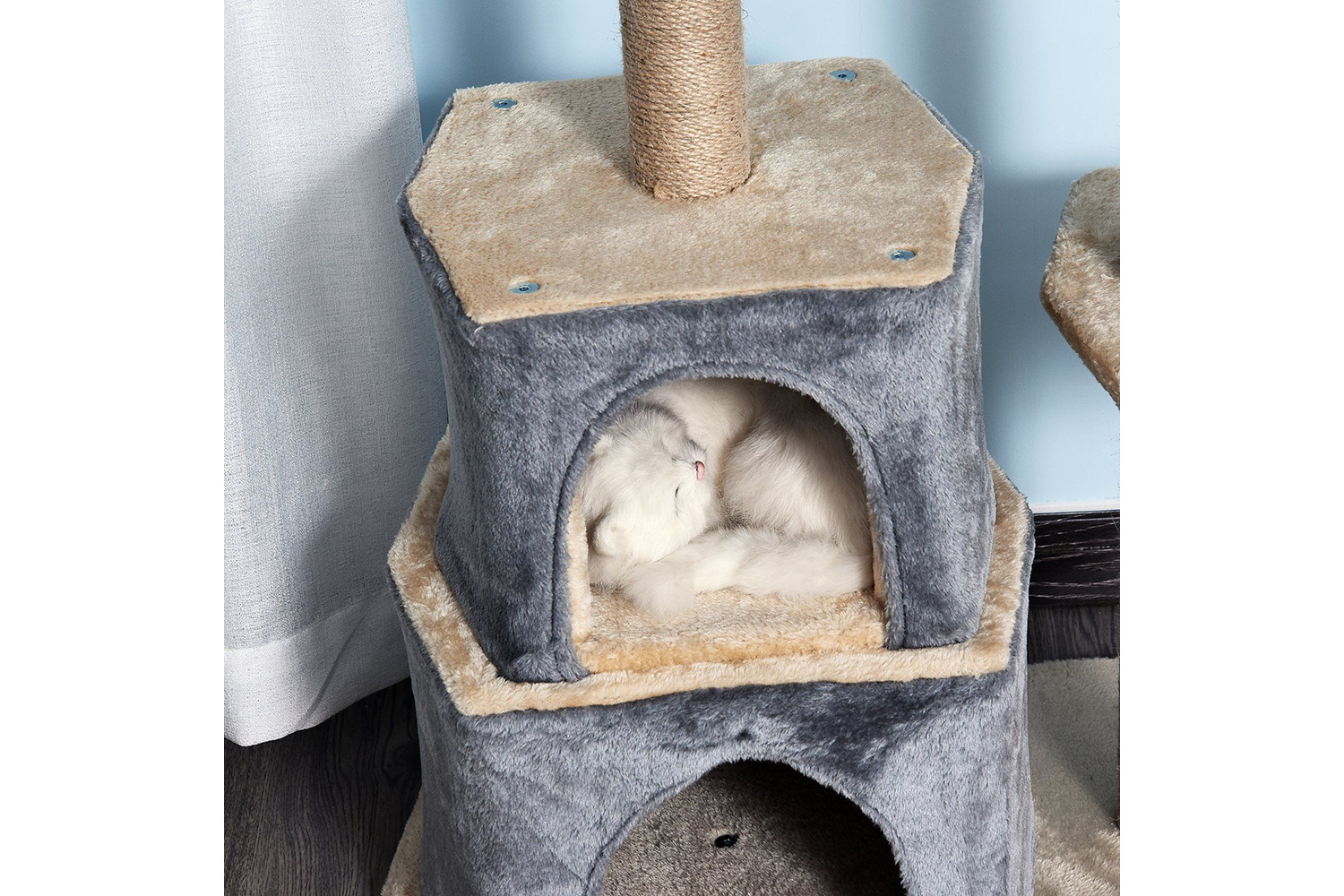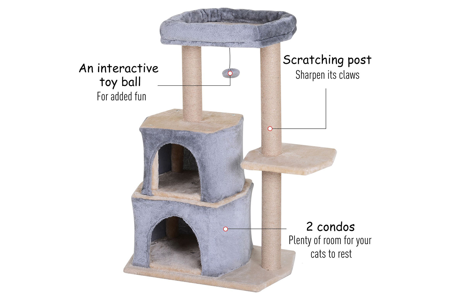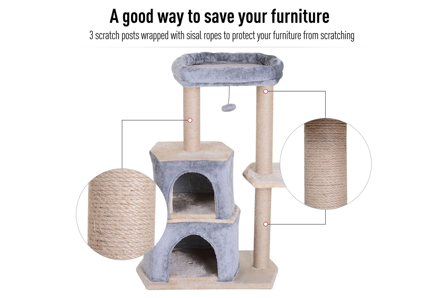 • Three sisal scratching posts are hard wearing and safe for the cat to use