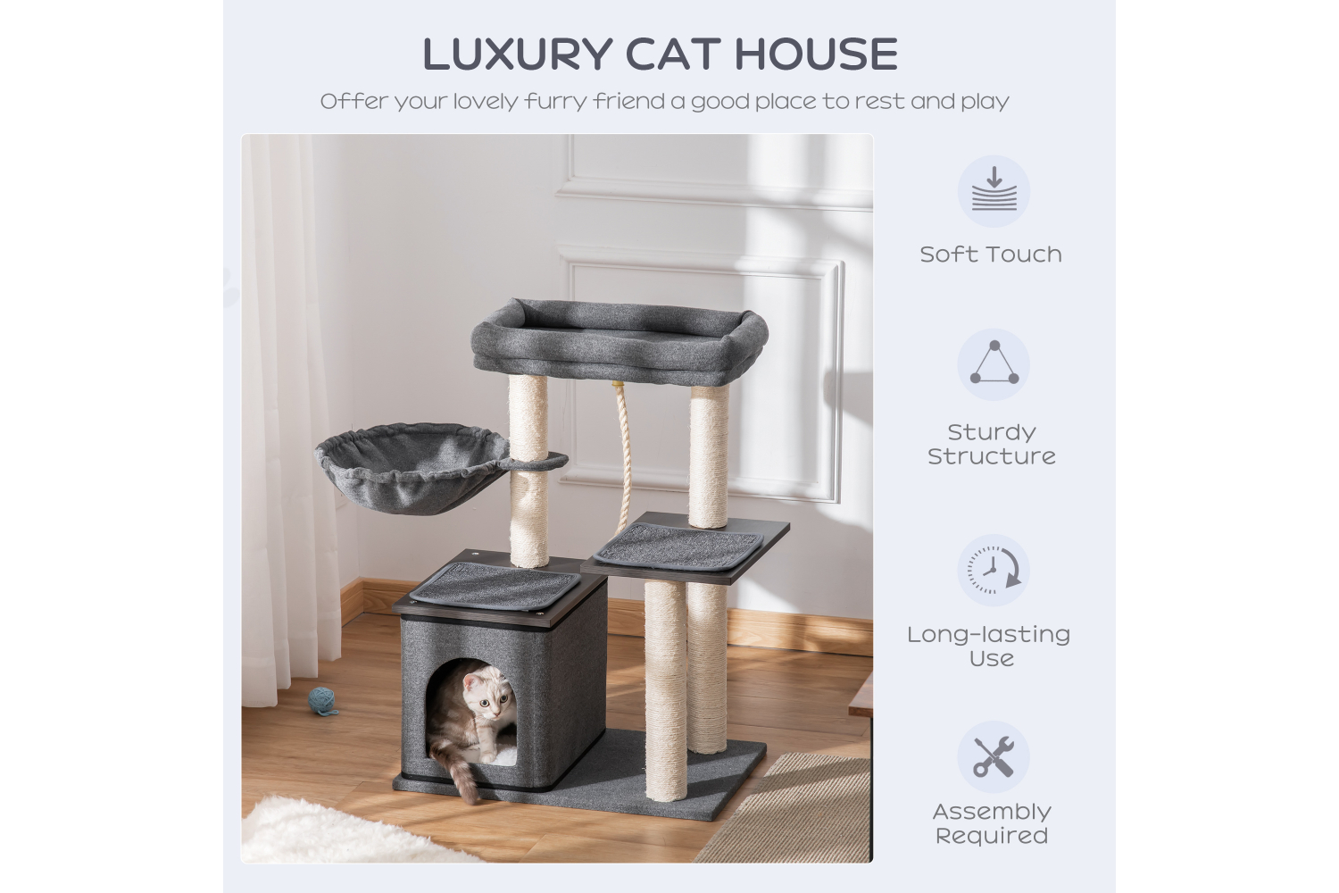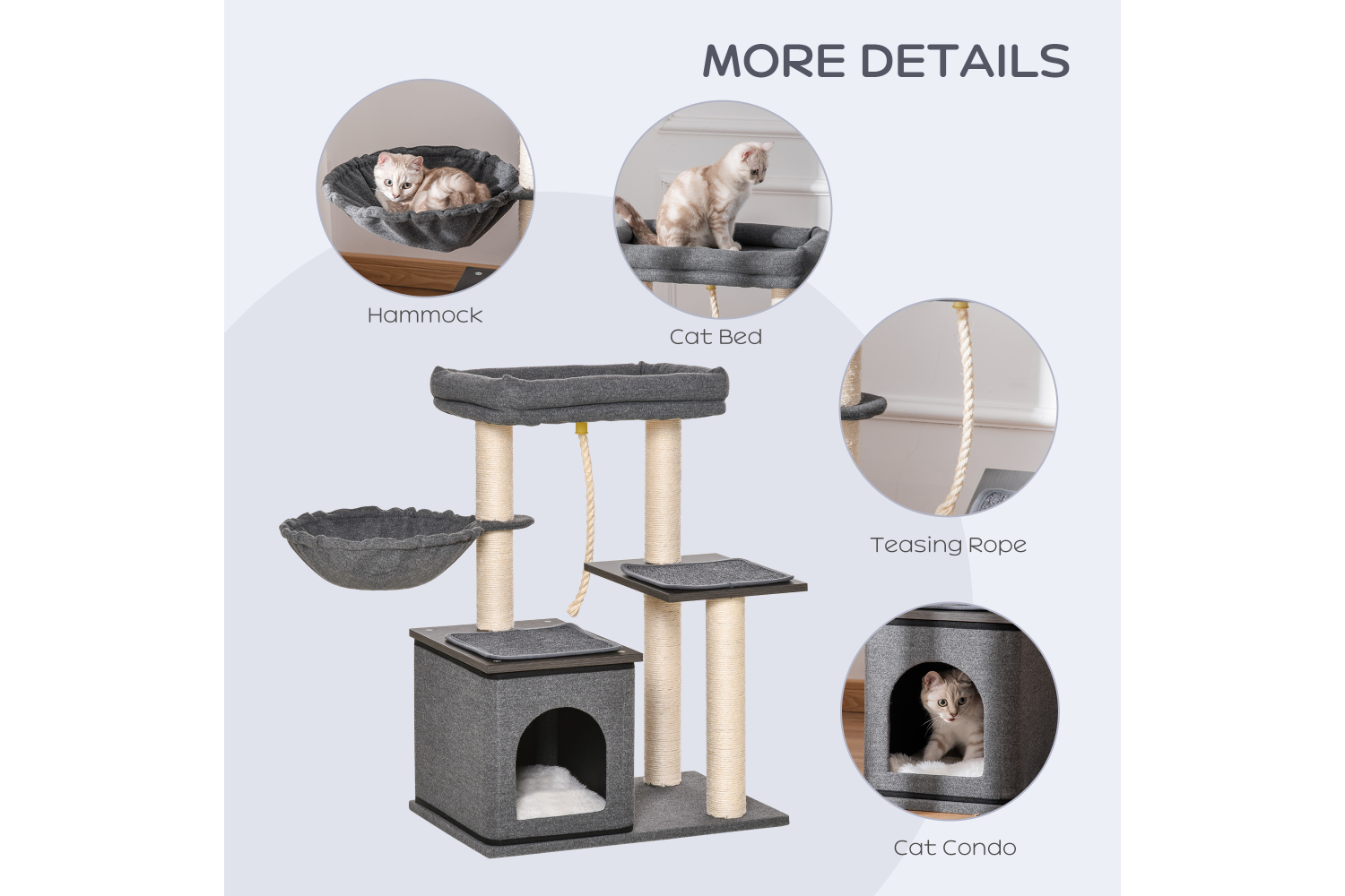 Safely satisfy your cat's instincts with this cat tree from PawHut! This multi-activity center features sisal scratching post, cat condo, cat bed, hammock, teasing rope and perches for so much fun. Cat scratchers benefit both pets and owners by providing someplace to relieve cats’ desire to claw and climb and save your carpets and household furniture from damage. Rest, play, exercise, your cats can spend all day on it, a comfortable unit for your furry friends.