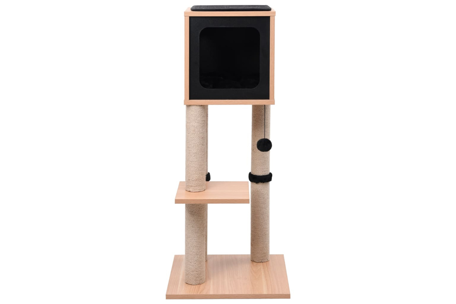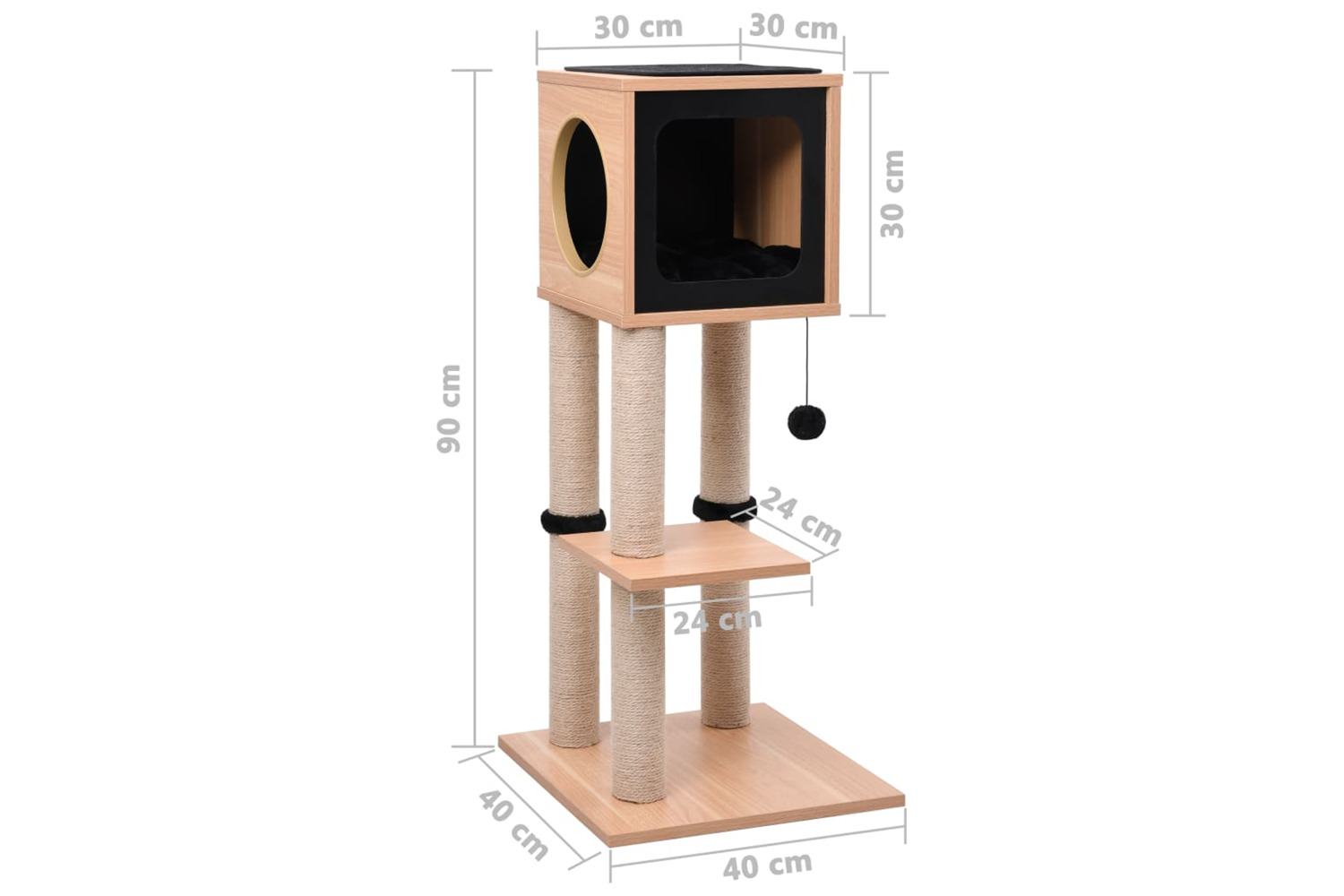 - With a house, a dangling ball, scratching jute posts, perch and relaxing areas