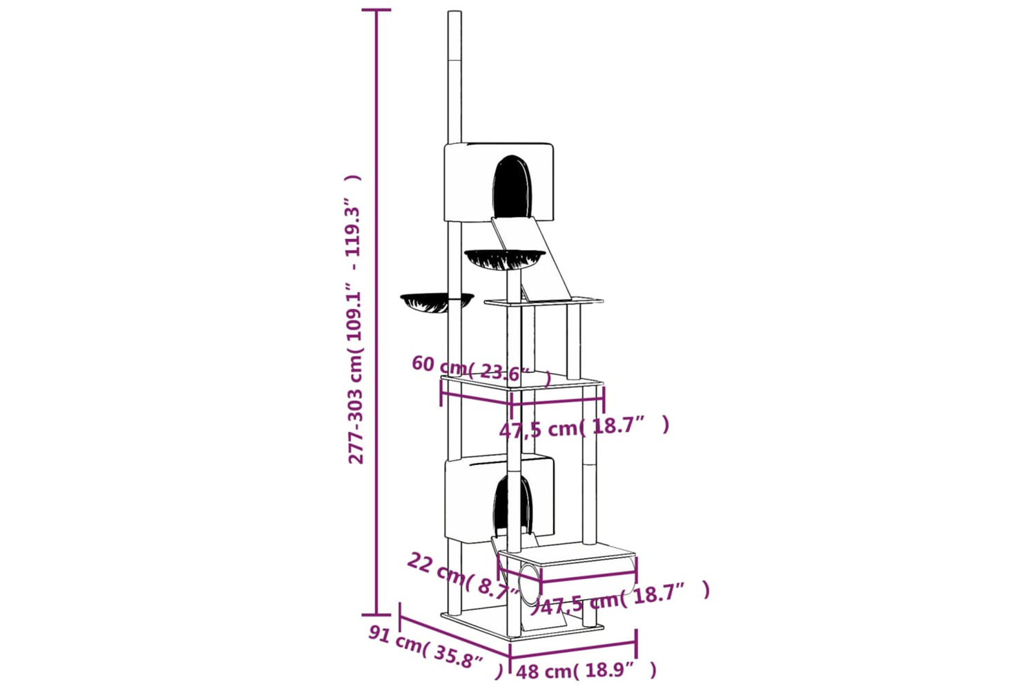 - Dimensions: 48 x 91 x (277-303) cm (L x W x H)