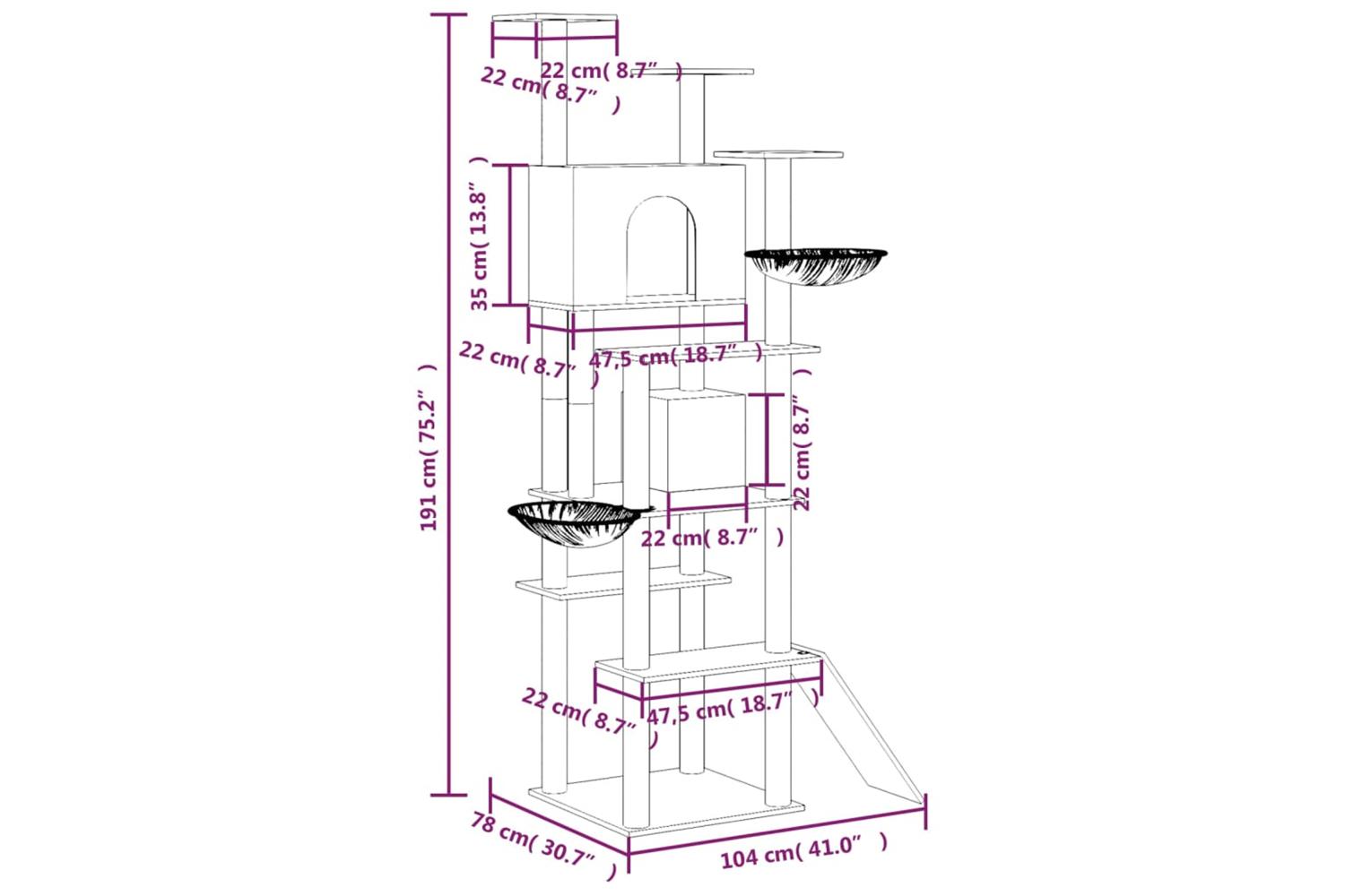 - All-in-one cat tower: The multi-level cat scratch tower gives your cat a fun and compact place to play, exercise and a warm house for a good nap. It features a ladder, 2 houses, 2 baskets and platforms.