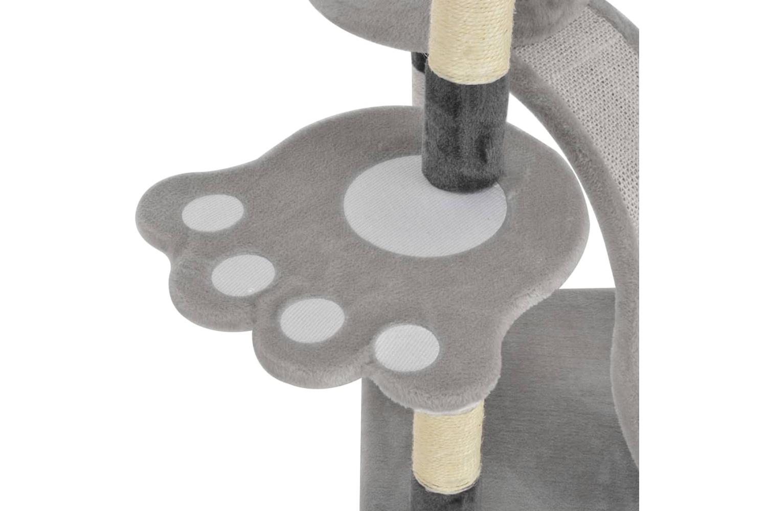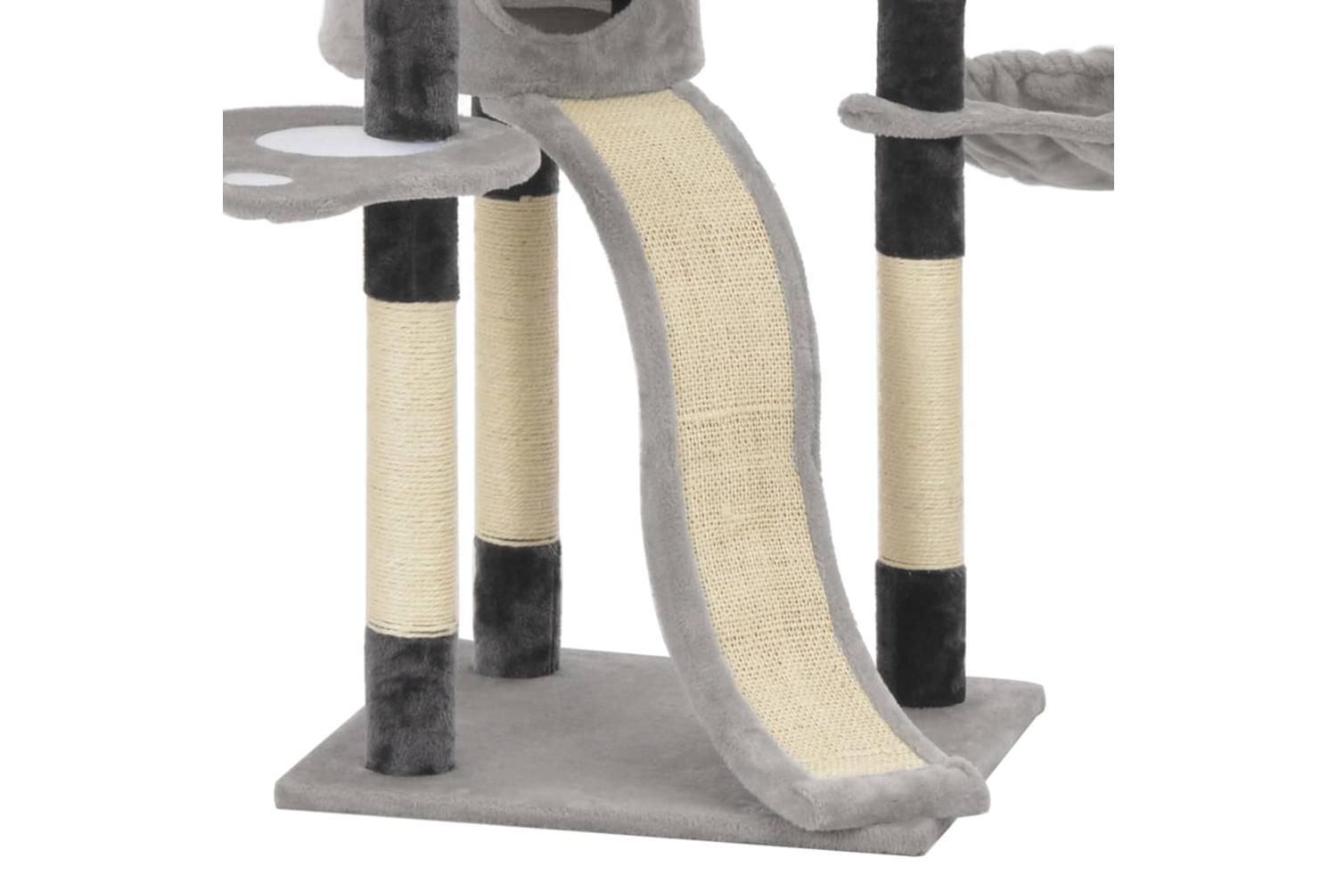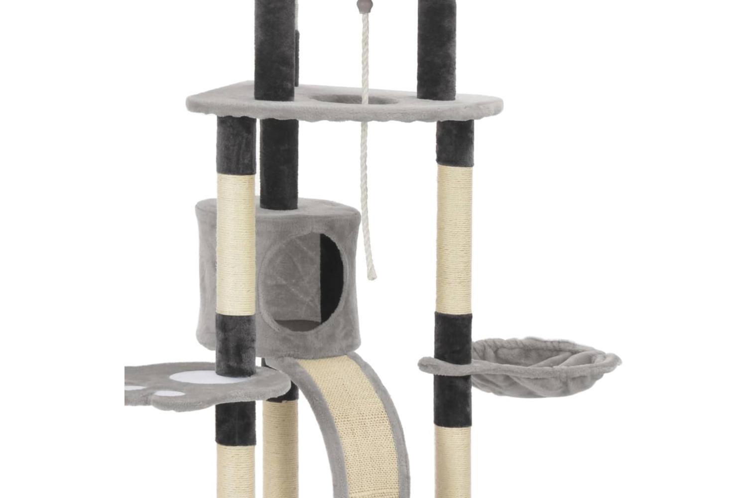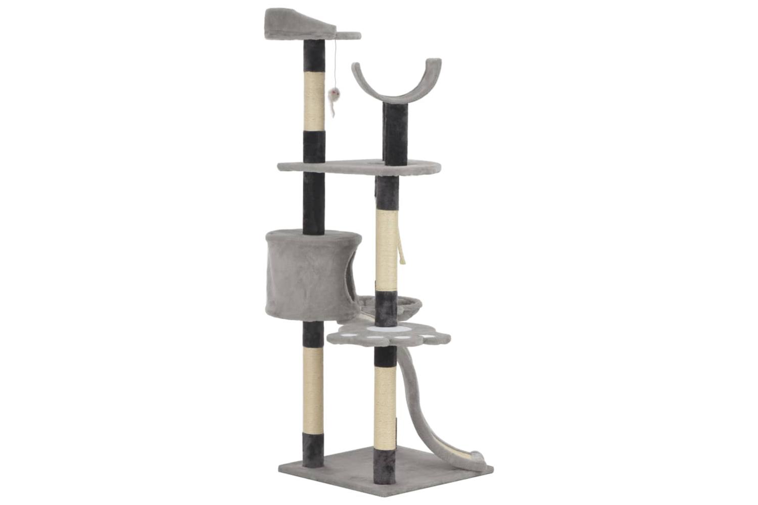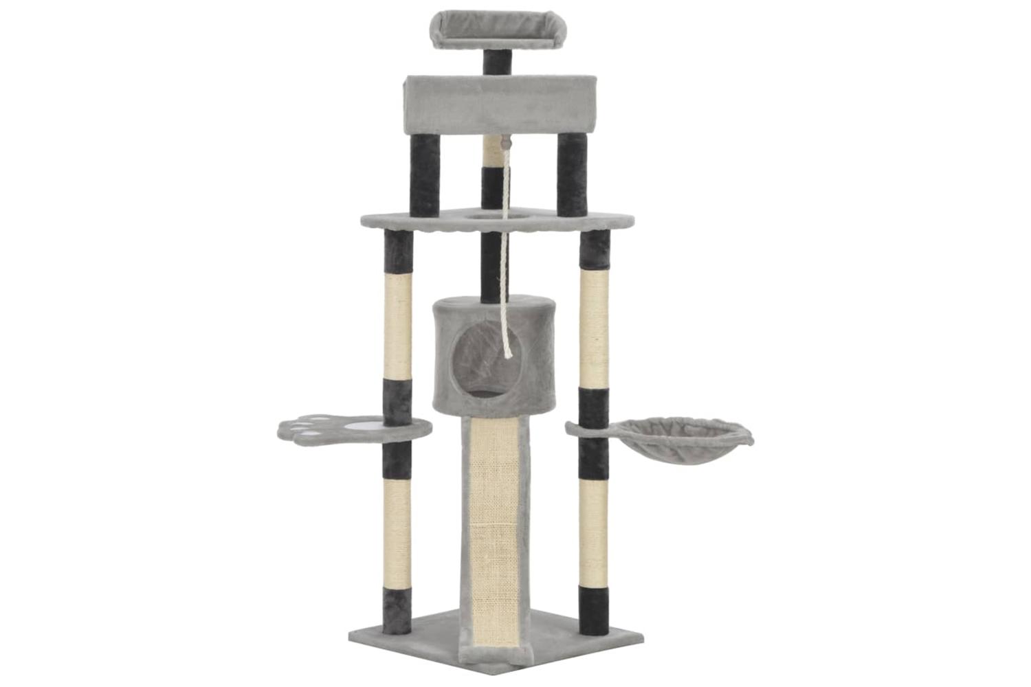 - With a house, a climbing rope, a dangling toy, a basket, scratching posts and platforms