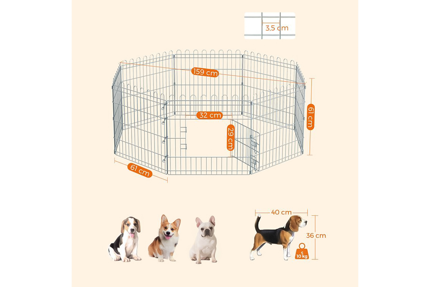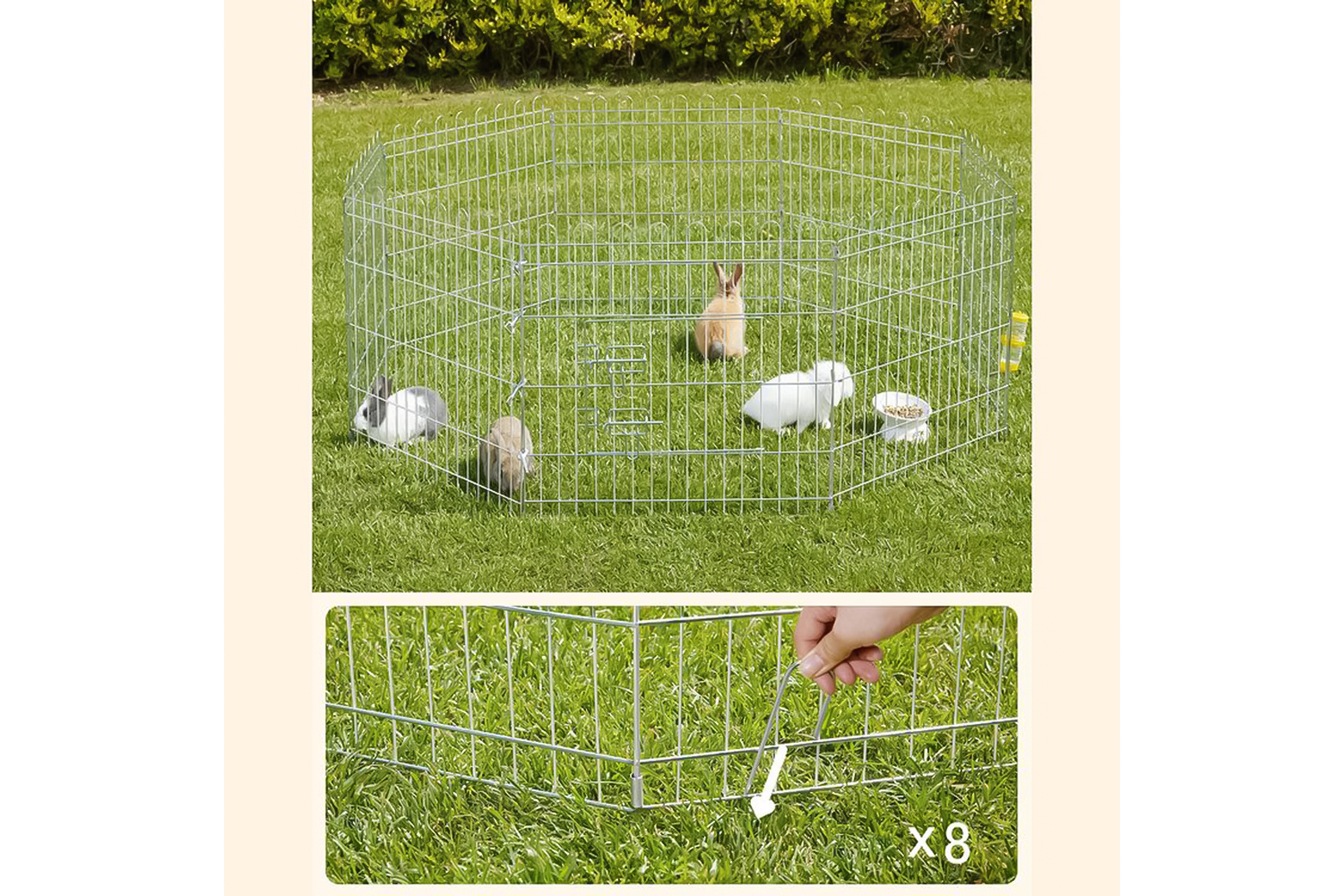 This playpen consists of 8 pieces of fence, which can be assembled into a square or octagon according to your needs. The height of 61 cm is suitable for animals up to 40 cm, e.g. B. for dogs, rabbits and chickens.