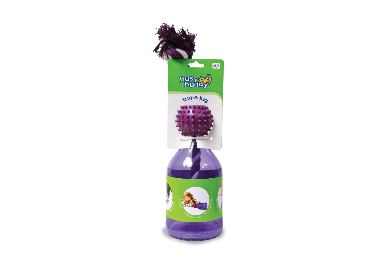 If your pet needs a multi-purpose toy to keep them extra-busy, treat them to a PetSafe Busy Buddy Tug-A-Jug. This durable plastic jug randomly dispenses treats and holds up to super-strong chewers. The braided rope is great for playing tug-of-war and the jug can double as a slow feeder for pets who eat too fast. Our patented Treat Meter dispenses treats randomly while your dog plays with the toy. Trim the prongs to make treats come out faster. Available in extra small, small and medium/large. Trust PetSafe to help to keep your pet healthy, safe and happy.