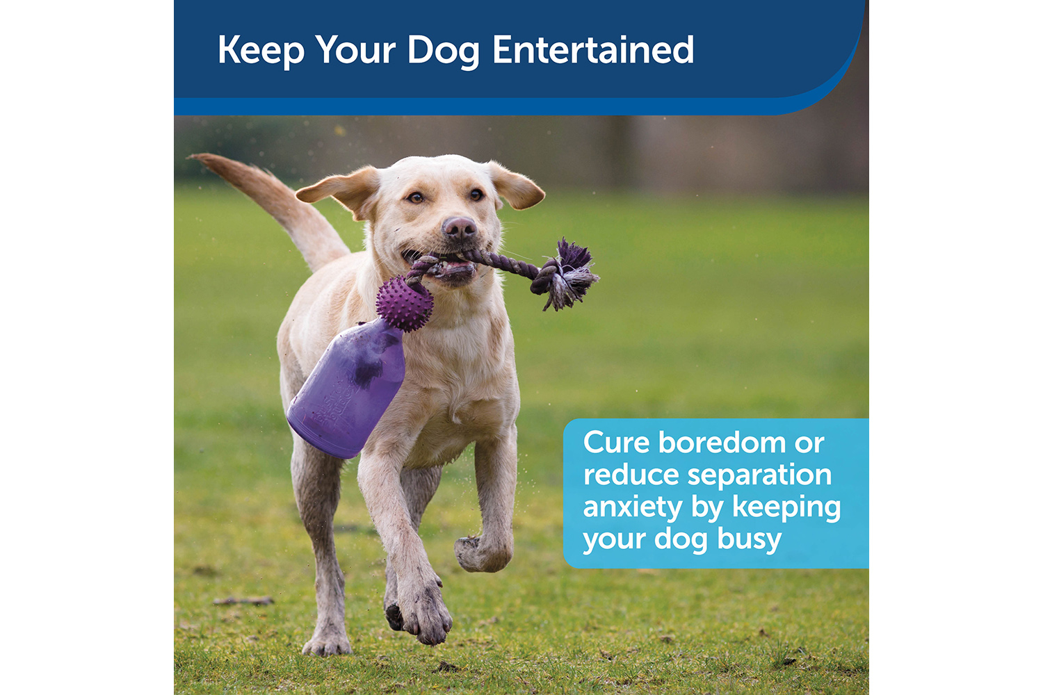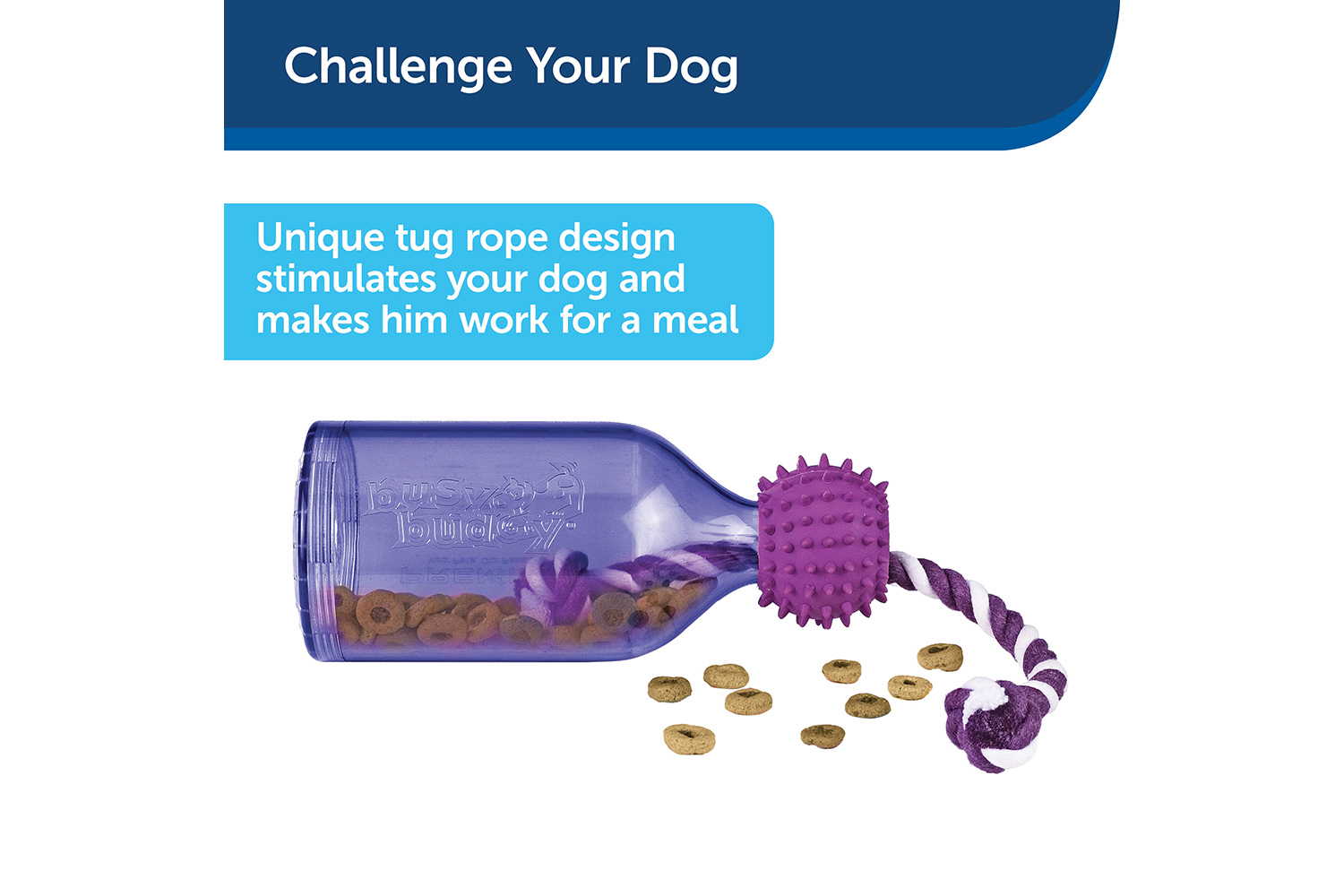 Slow feeder and trainer – Use to regulate meals, play games or teach training commands; holds up to 828 mL of kibble. Reduces Boredom – Durable plastic jug keeps your pup busy; braided rope is great for tug-of-war and helping to keep teeth clean. Interactive Treat Dispenser – Our patented Treat Meter® dispenses treats randomly while your dog plays with the toy; trim the prongs to make dry treats come out faster. Easy to Clean – Dishwasher-safe; use top rack for best results. Three sizes available – Extra small for pups under five kilograms; small for dogs 5–18 kilograms; medium/large for pooches over 18 kilograms
