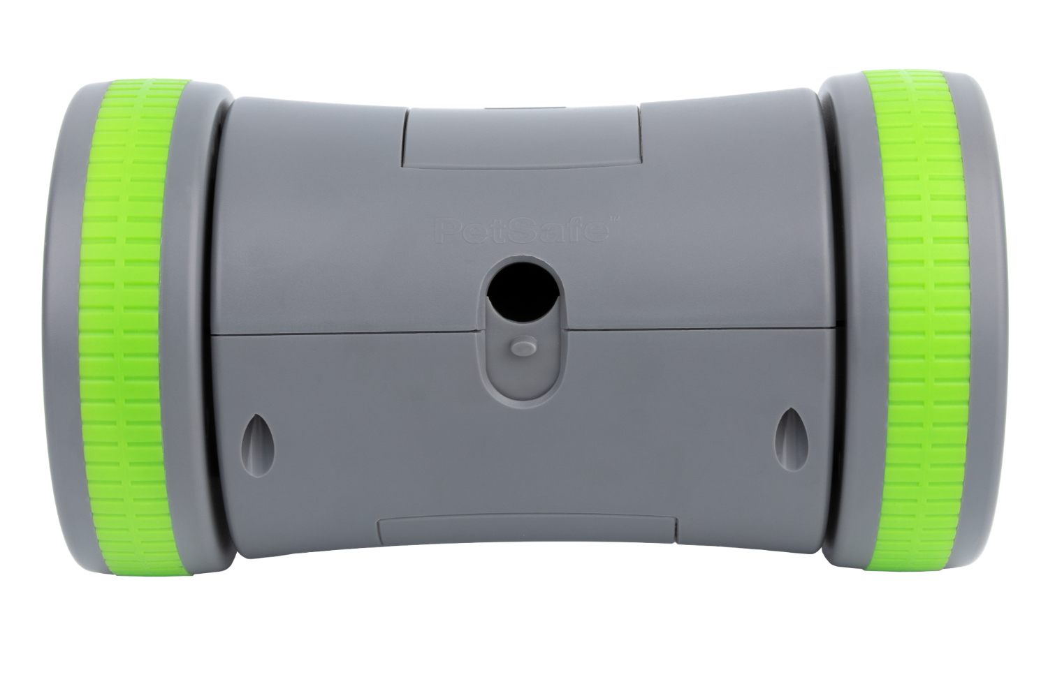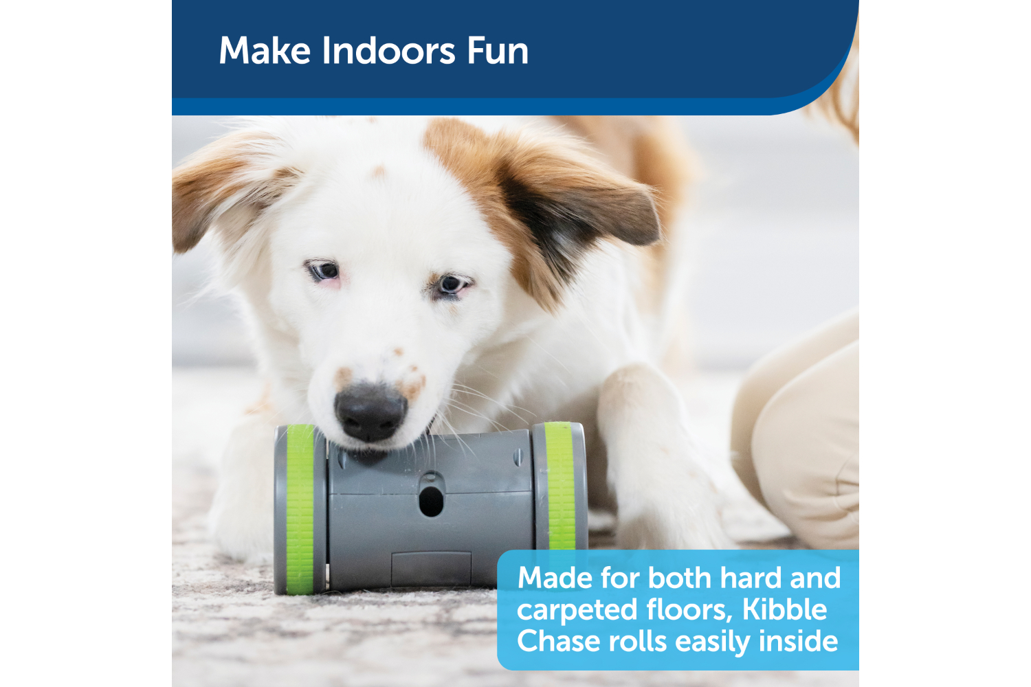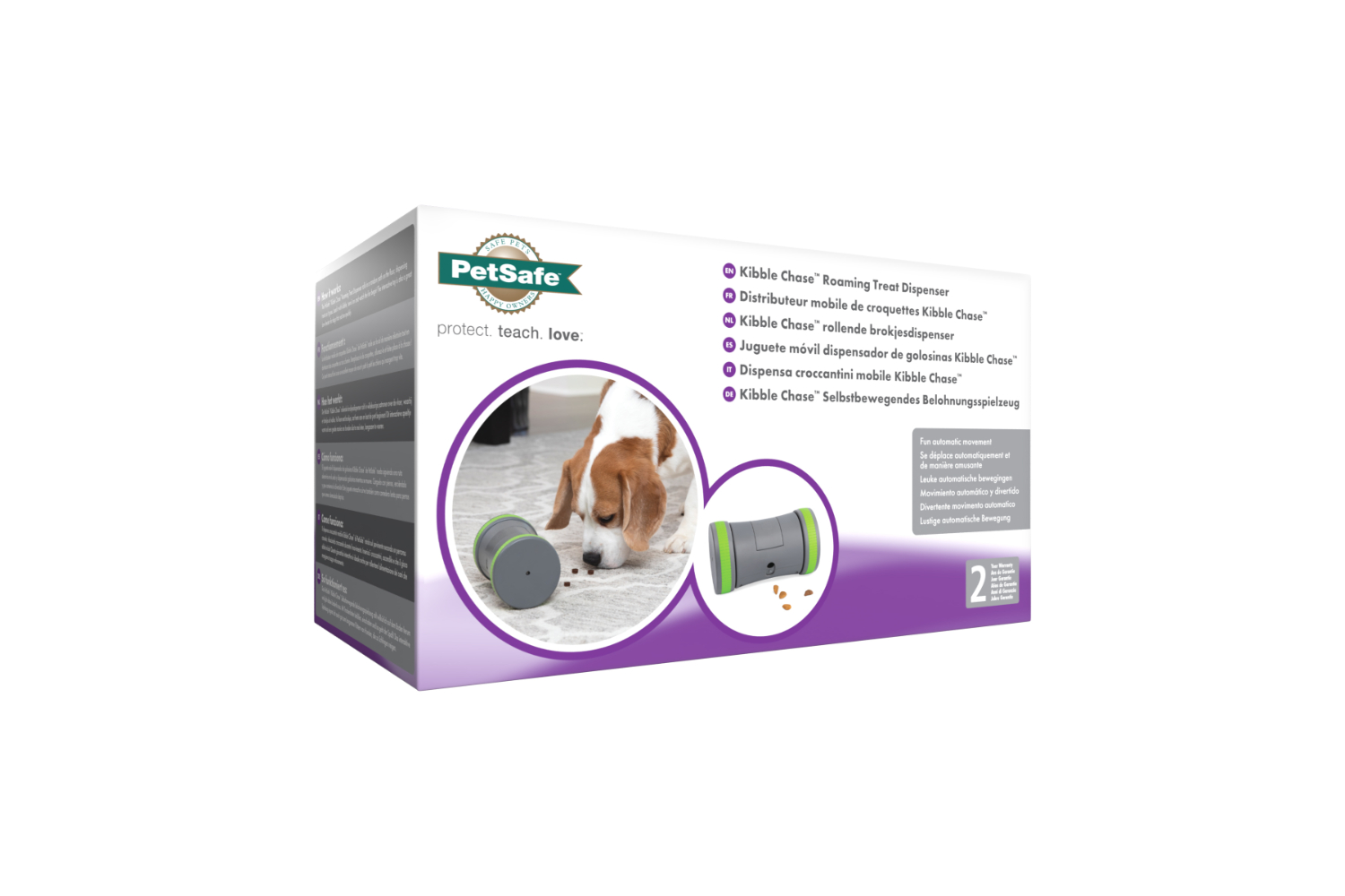 The treat chase is on! The PetSafe Kibble Chase Roaming Treat Dispenser is an interactive dog toy that will get your puppy excited about playtime. Simply load it with kibble, turn it on and watch the fun begin. The battery-powered toy rolls around the floor in a random pattern, dispensing treats as it goes. This is a perfect choice for dogs that eat too quickly. This treat puzzle is a great way of feeding slowly and can hold up to half a cup (118 ml) of kibble. Tough rubber wheels roll quietly and easily on most indoor floor surfaces. From playtime to dinner time, the PetSafe brand is here to help you and your pet to live happy together.