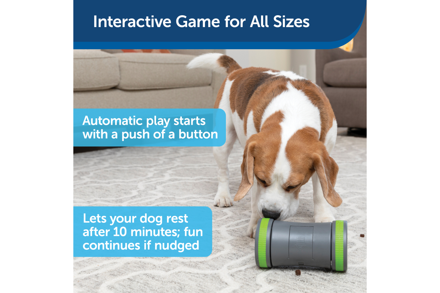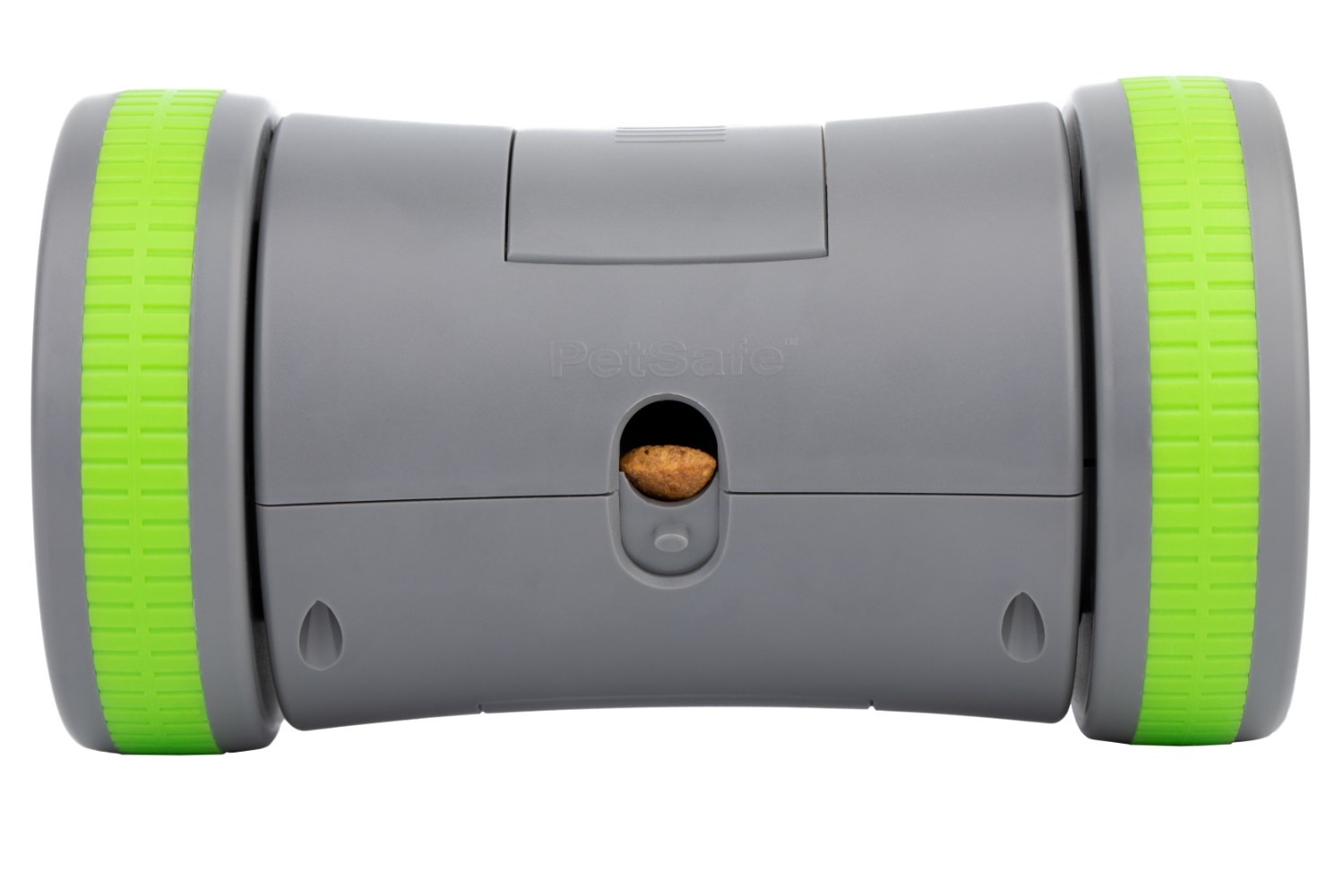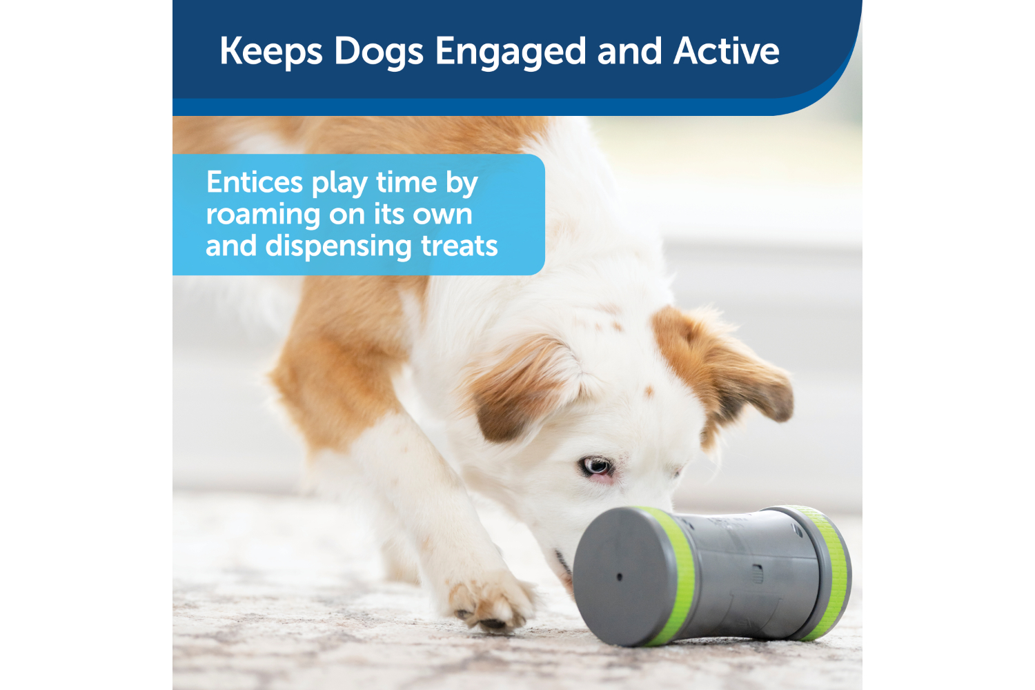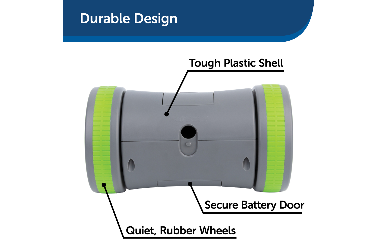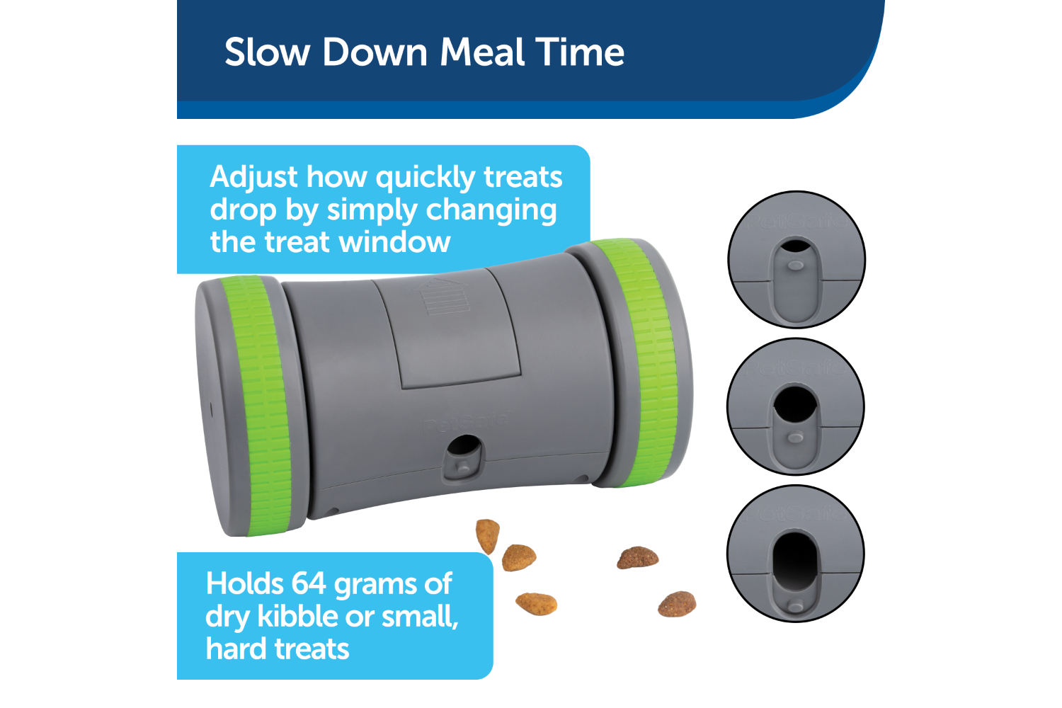 Keeps your Dog’s Interest - Engaging toy moves in an unpredictable rolling action while randomly dropping treats to entice your dog Encourages Active Play - Fun automatic movements keep dogs of all sizes busy with a game of chase and treatSlow Feed Solution - The adjustable window opening allows you to control how quickly food is dispensed; holds up to half a cup of dry kibble or hard treats under half an inch wideQuality Construction - Durable plastic shell and secure battery door stand up to rough play, and the tough rubber wheels roll quietly and easily on most indoor floor surfaces Sleep Mode - This electronic toy gives your dog a break after 10 minutes, but will be ready to play again if nudged; requires 3 AA batteries (not included)